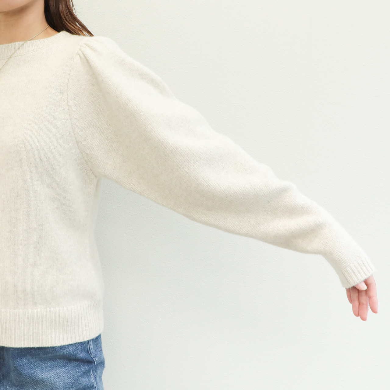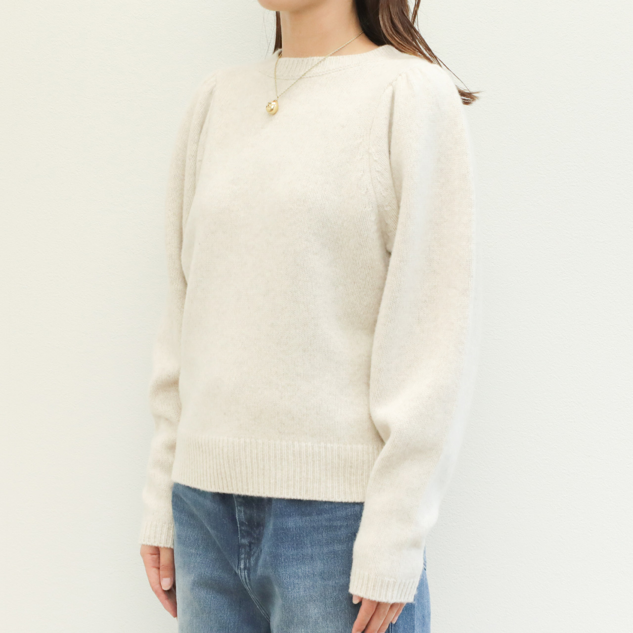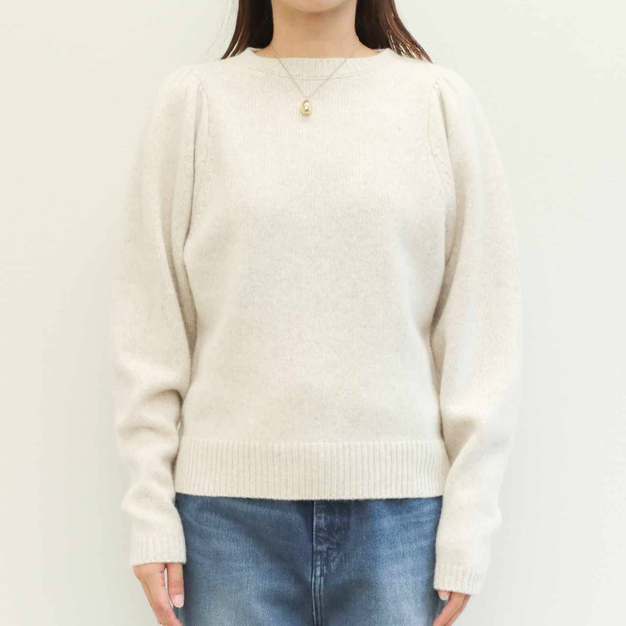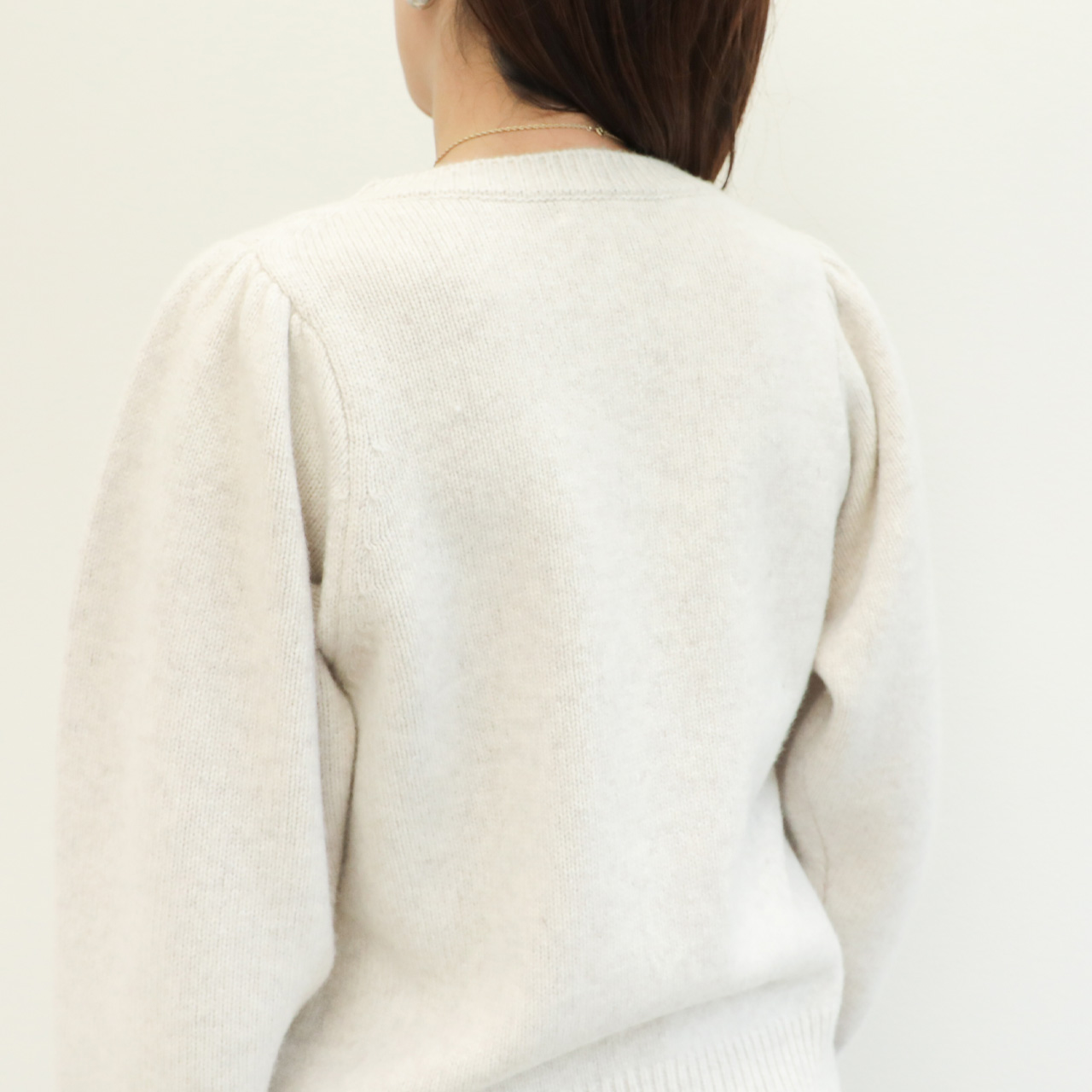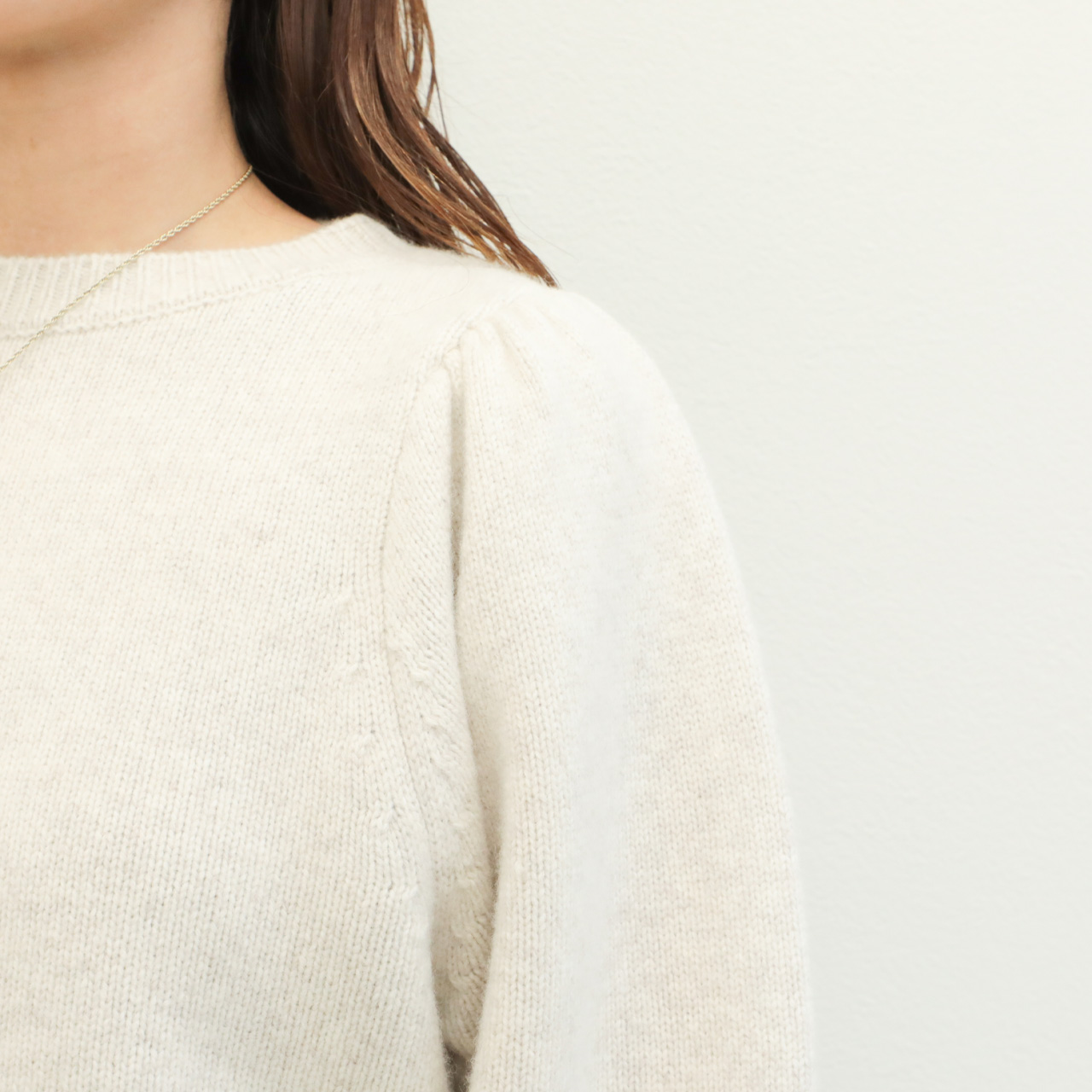 こちらは肩部分にギャザーを入れたパフスリーブデザインが大人の可愛らしさを引き出してくれるクルーネックニット。
