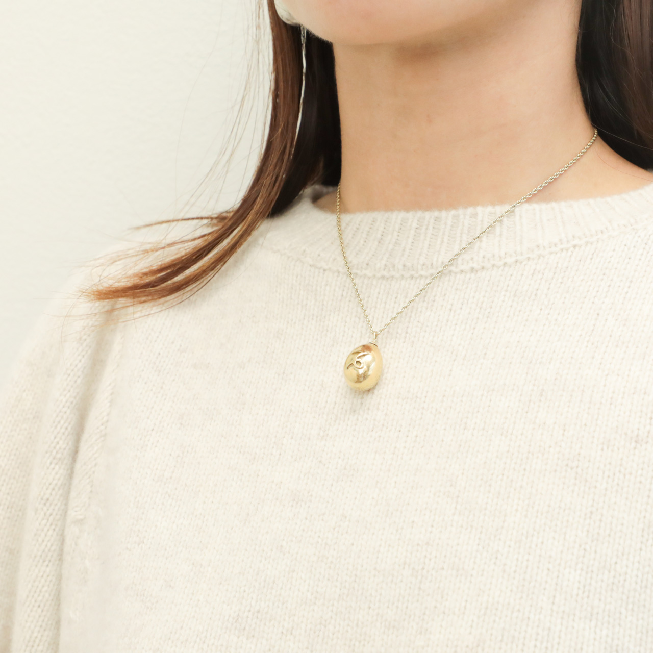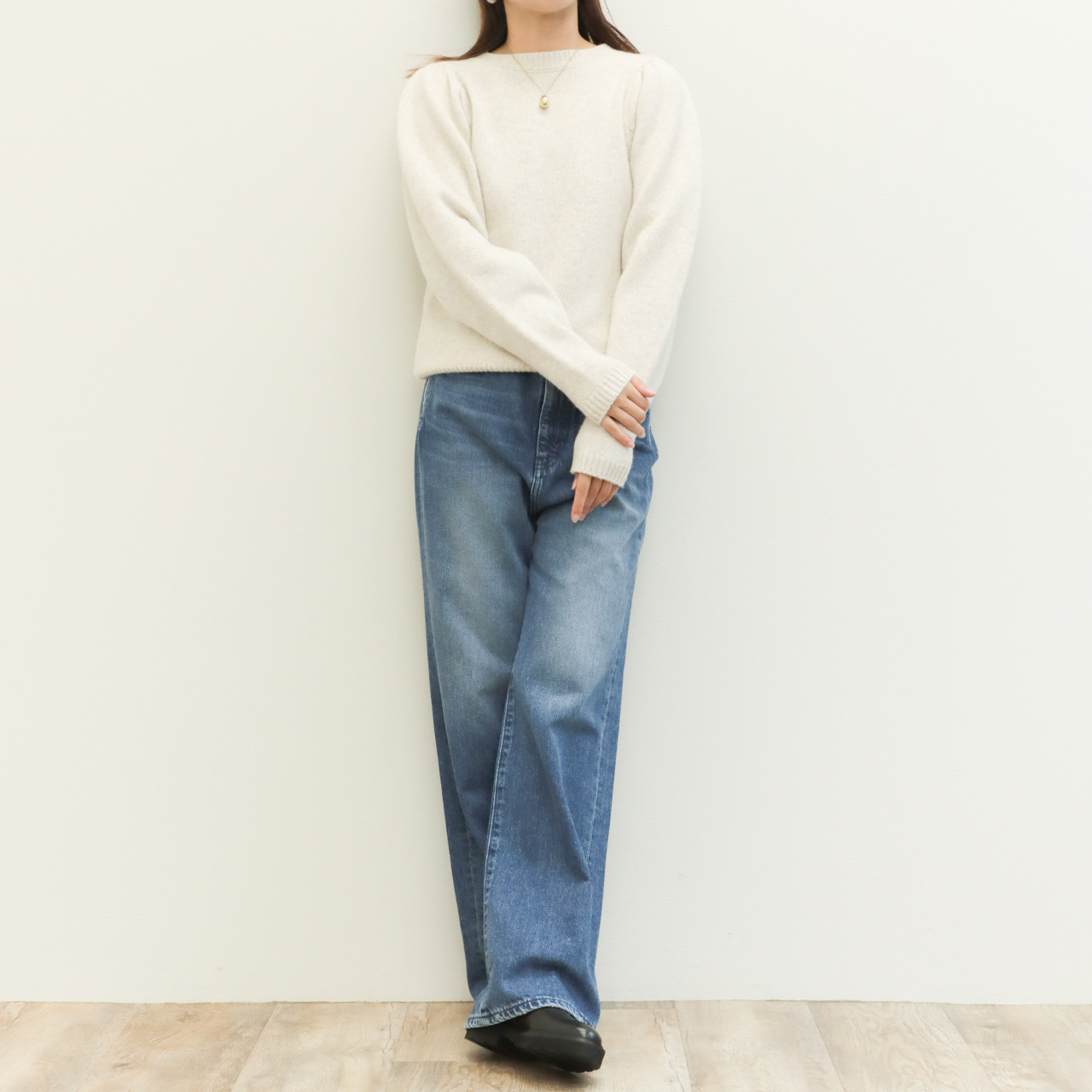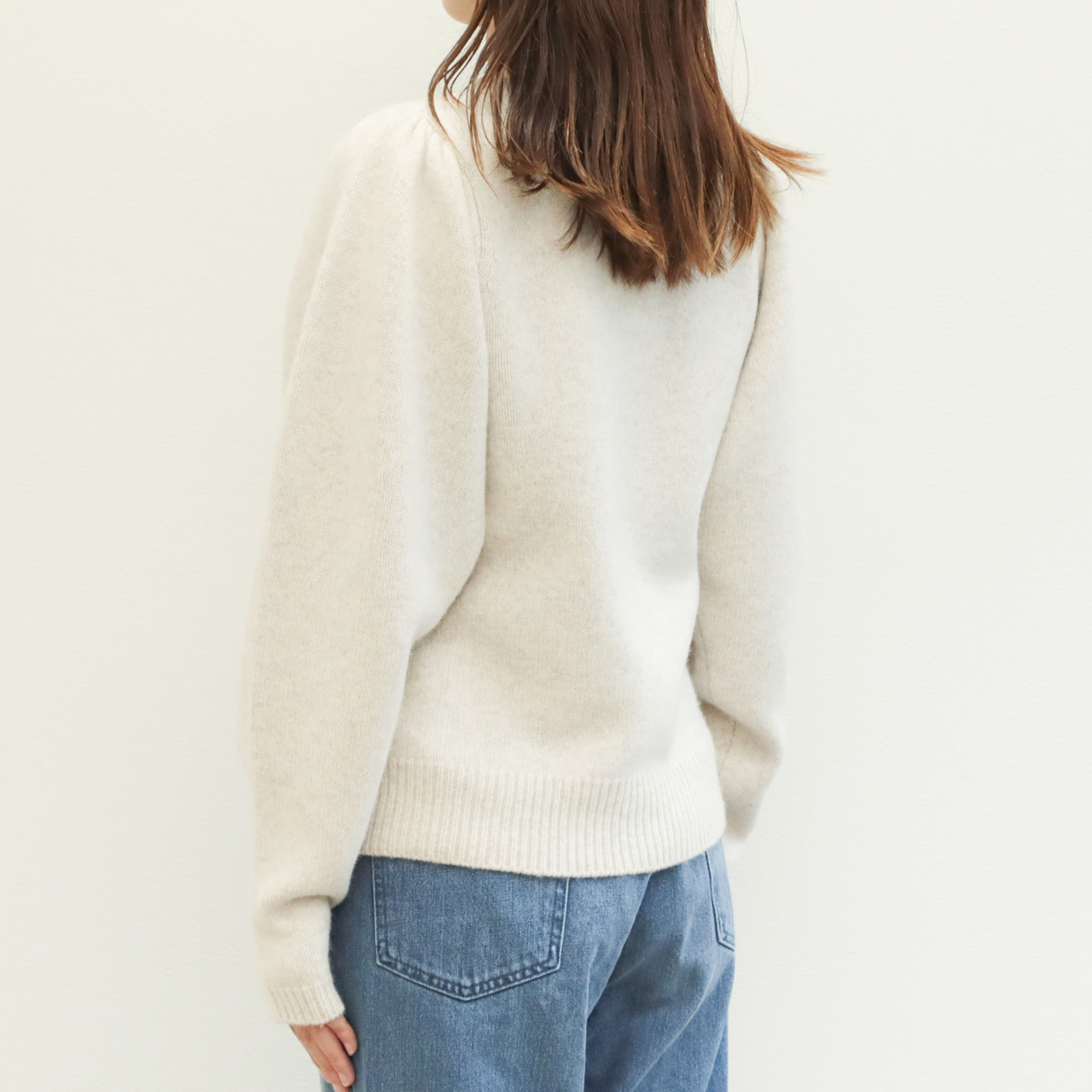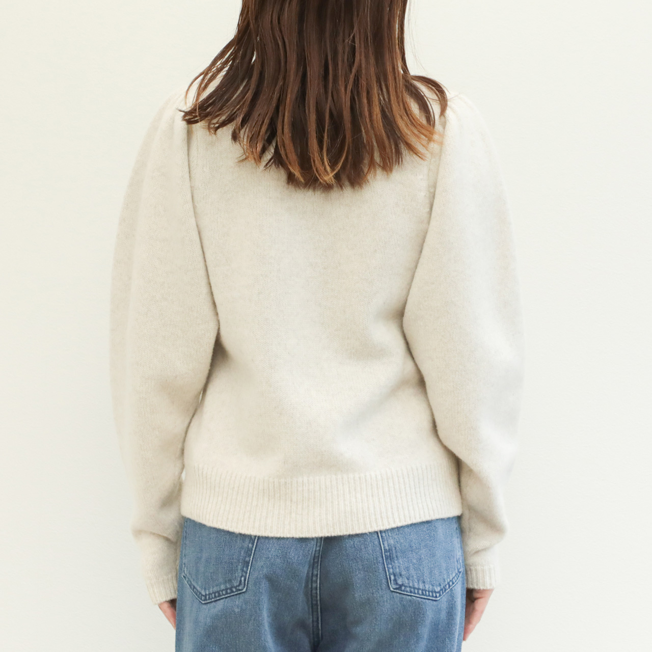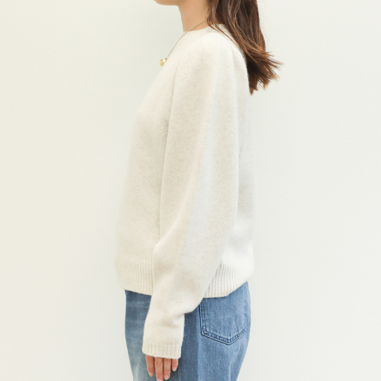 こちらは肩部分にギャザーを入れたパフスリーブデザインが大人の可愛らしさを引き出してくれるクルーネックニット。
