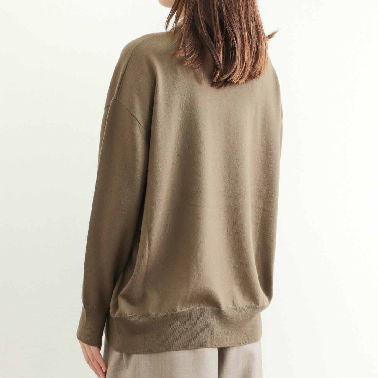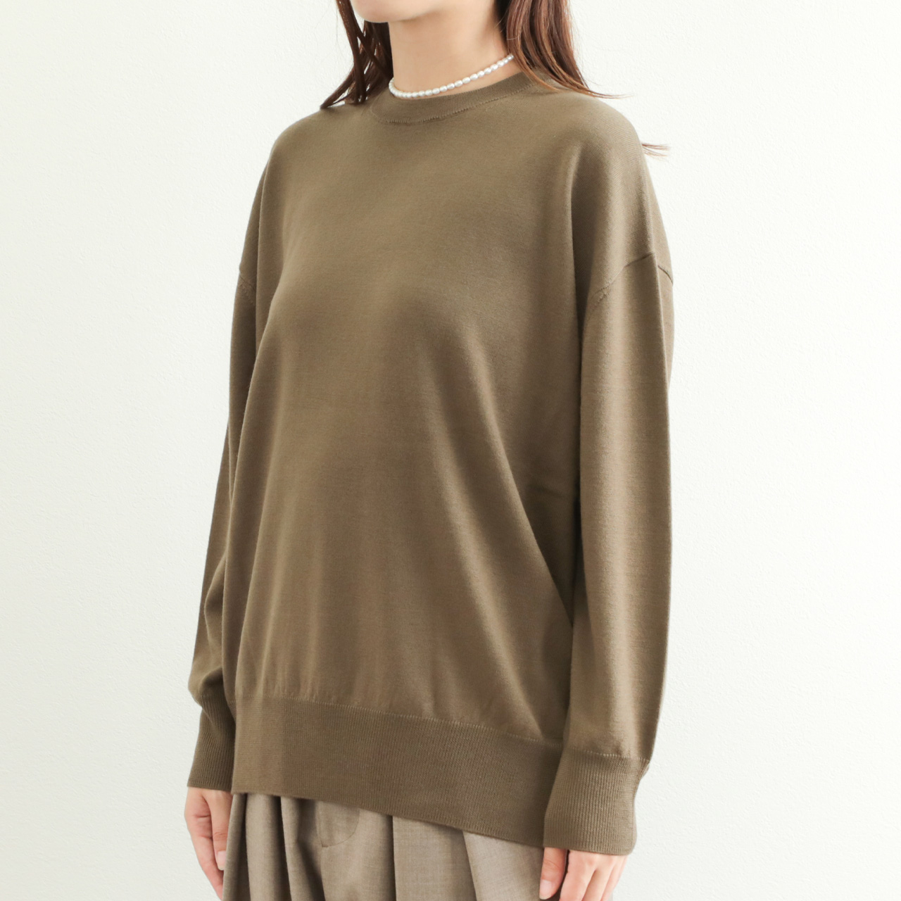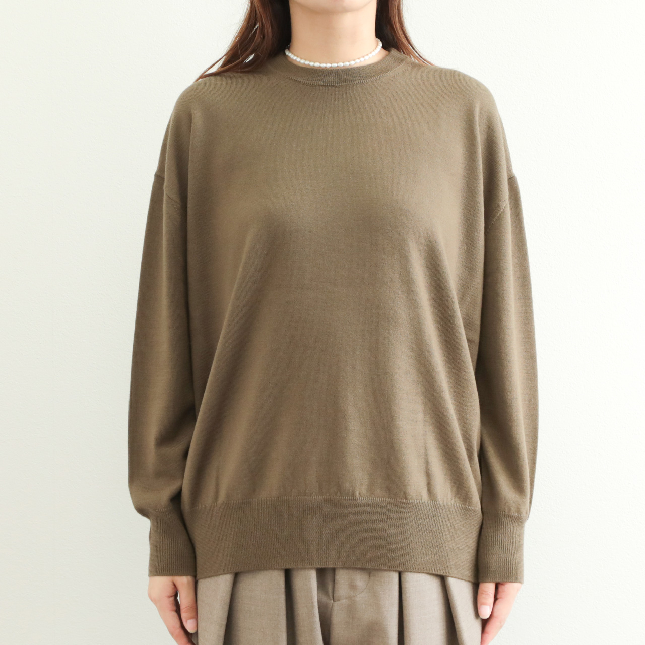 ベーシックな作りに絶妙なゆとりのオーバーサイズ感がポイント。ハイゲージで編み上げていますので、単品使いはもちろん、レイヤードスタイルのインナーとしても幅広い着こなしに活躍する一着です。