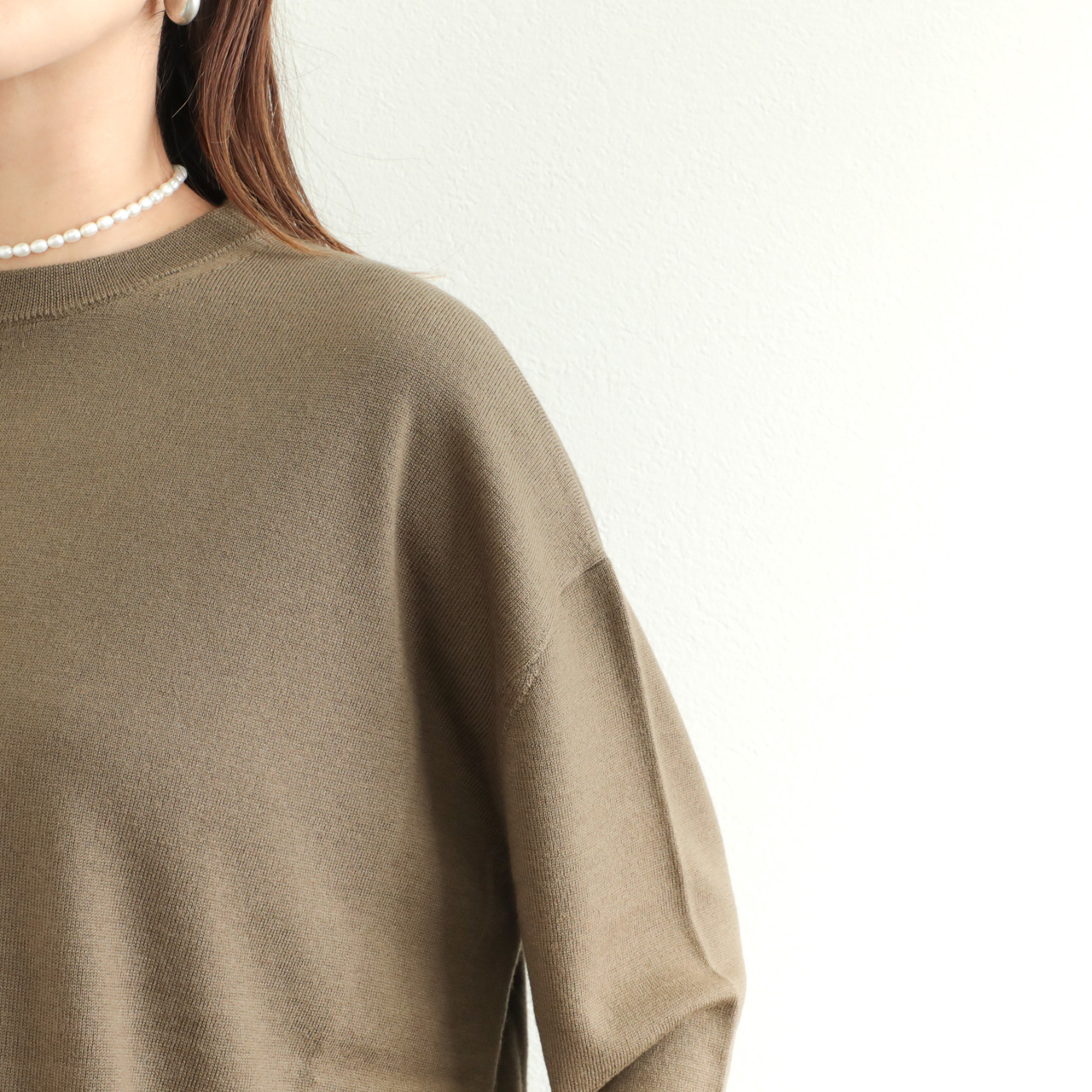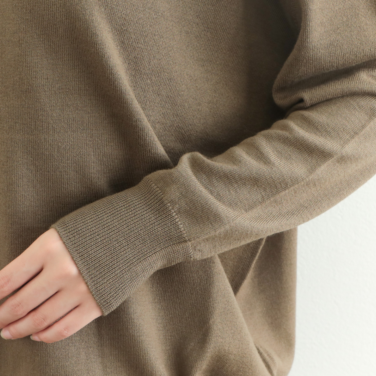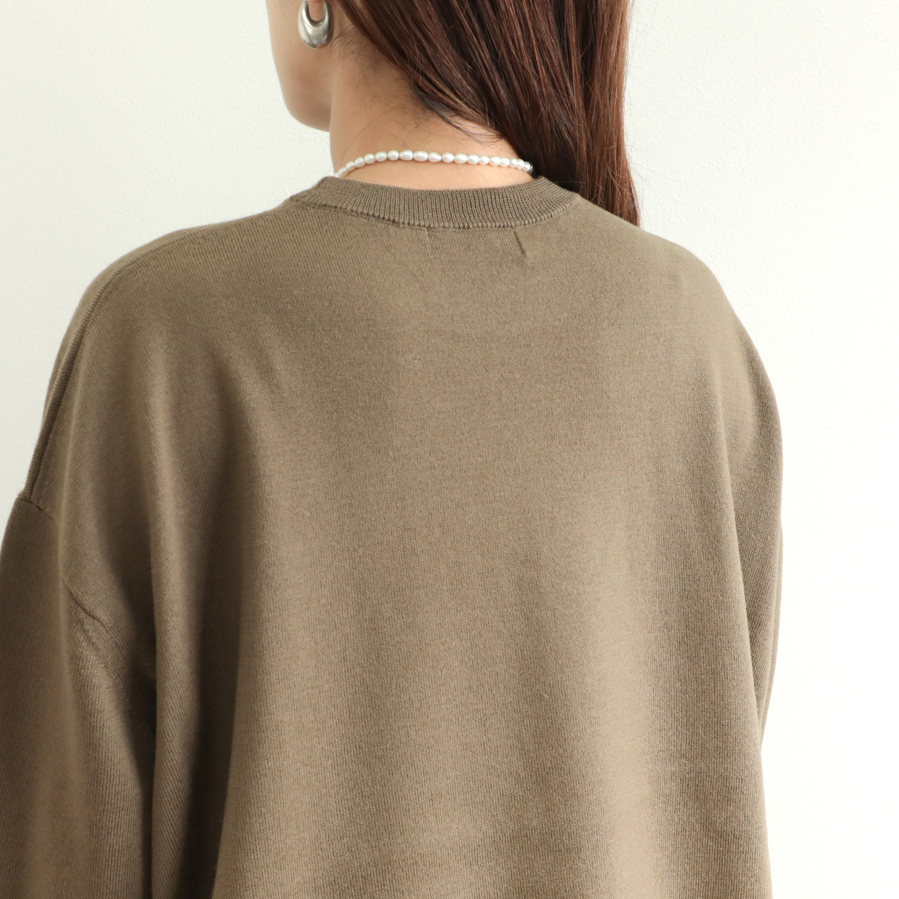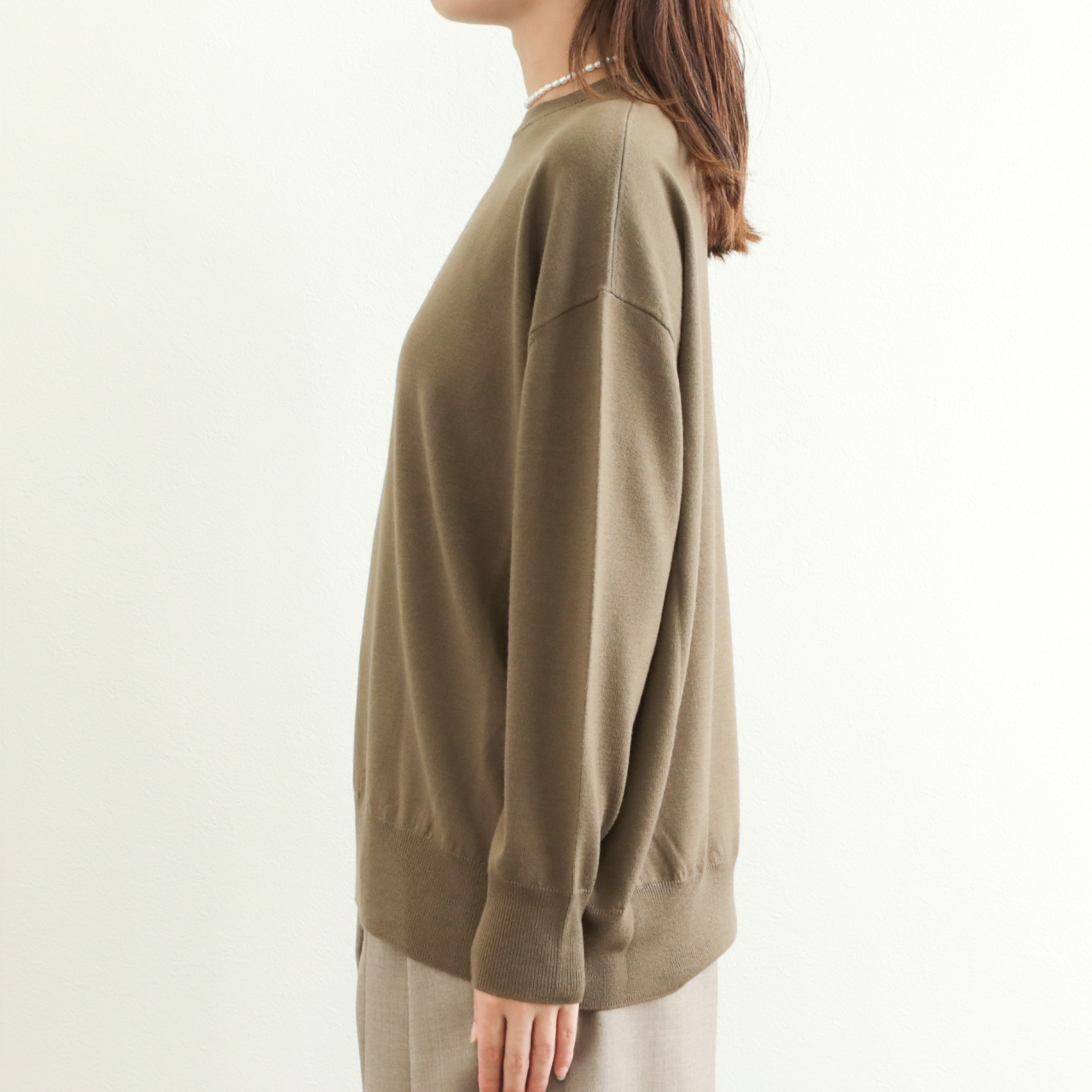 ベーシックな作りに絶妙なゆとりのオーバーサイズ感がポイント。ハイゲージで編み上げていますので、単品使いはもちろん、レイヤードスタイルのインナーとしても幅広い着こなしに活躍する一着です。
