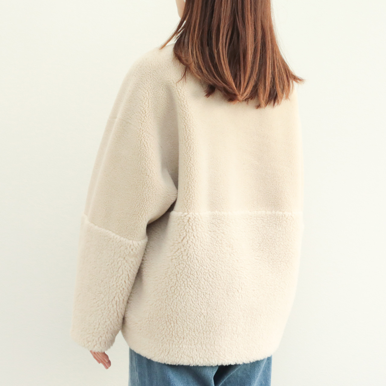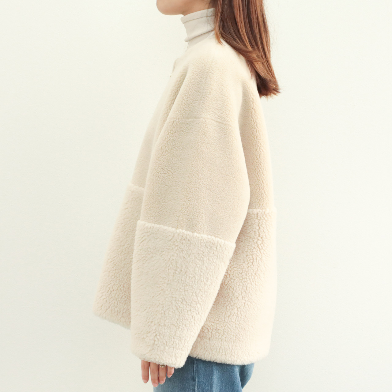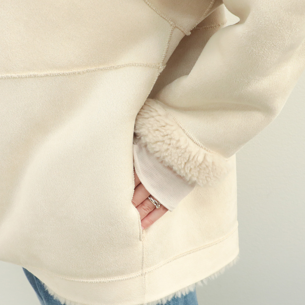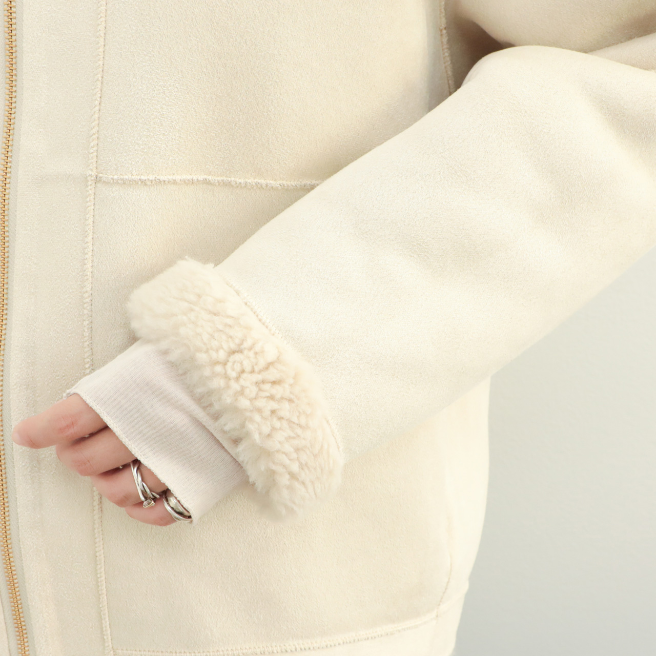 毛足の異なるボアを袖とウエスト辺りで切り替えた、表情感のある見た目になっており、スエード面を表にすると、袖口からボアが覗くところもデザインポイントです。
