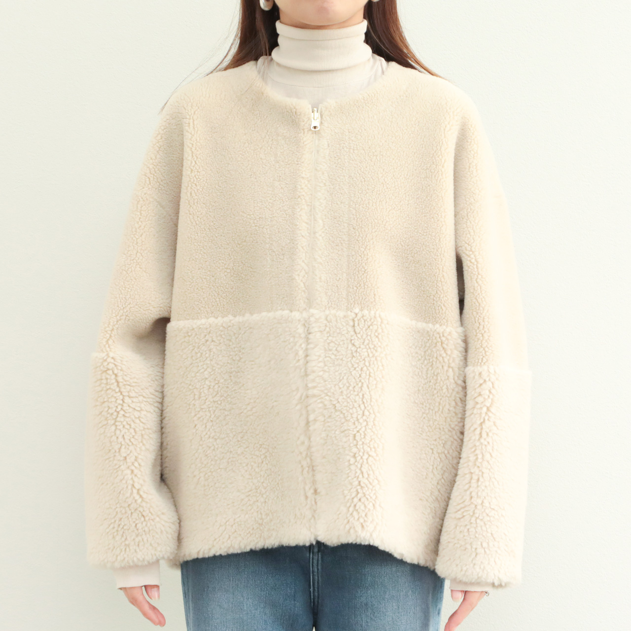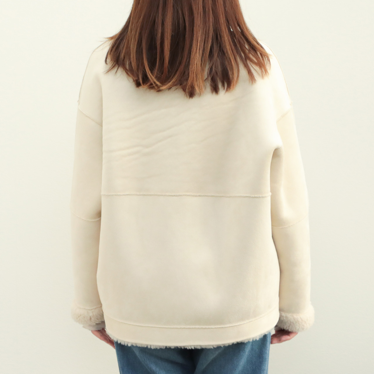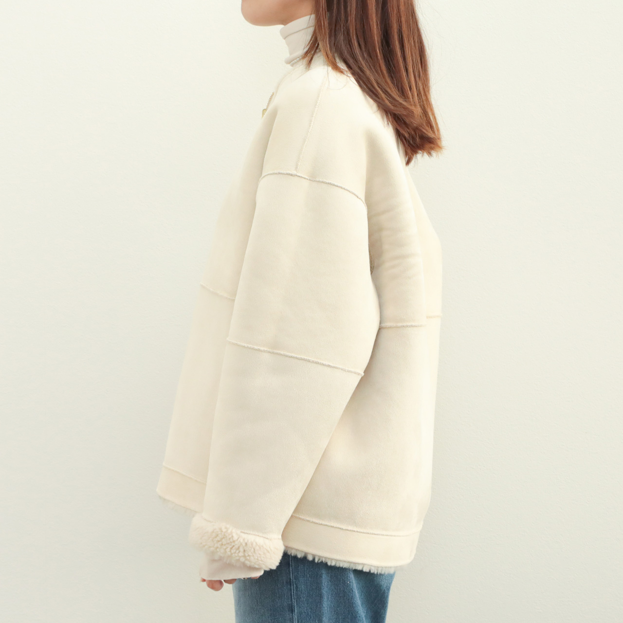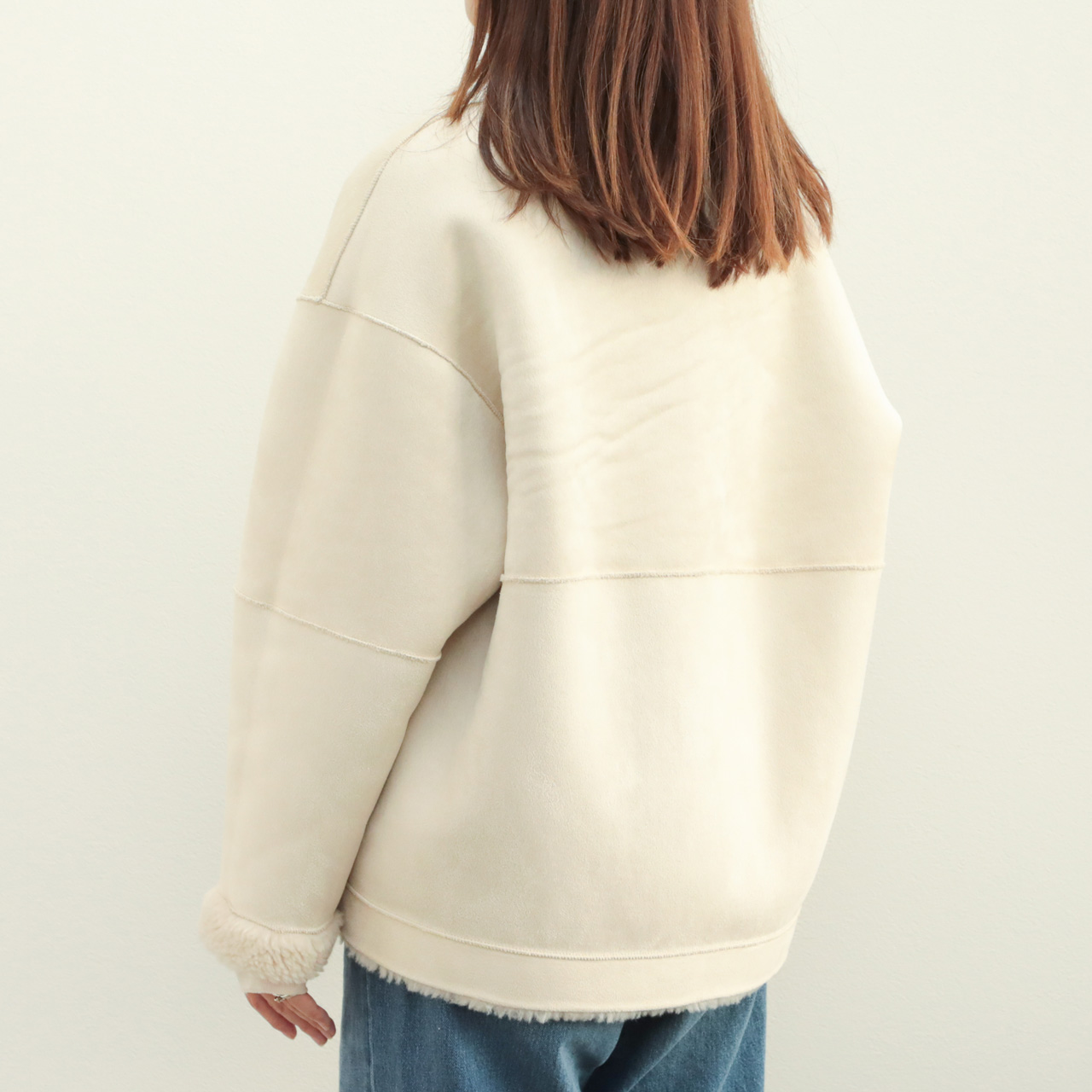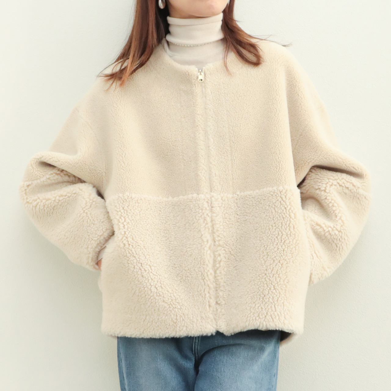 毛足の異なるボアを袖とウエスト辺りで切り替えた、表情感のある見た目になっており、スエード面を表にすると、袖口からボアが覗くところもデザインポイントです。