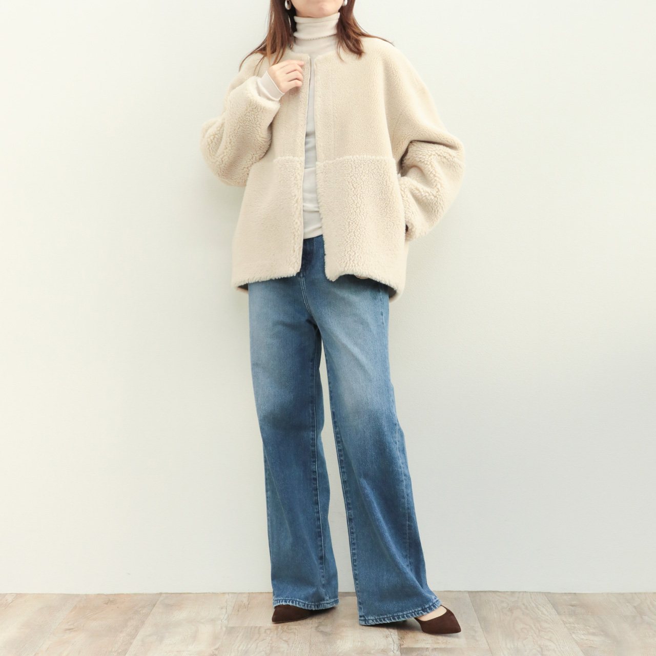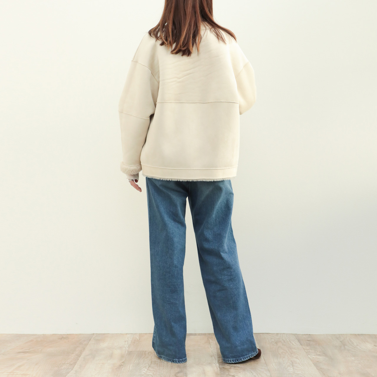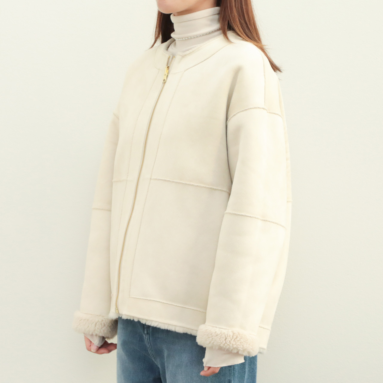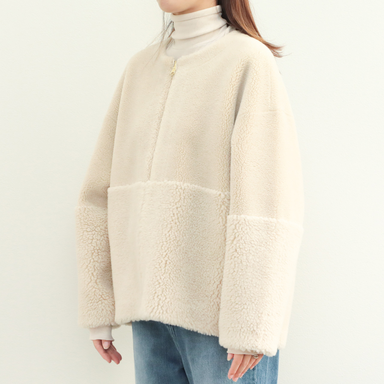 毛足の異なるボアを袖とウエスト辺りで切り替えた、表情感のある見た目になっており、スエード面を表にすると、袖口からボアが覗くところもデザインポイントです。