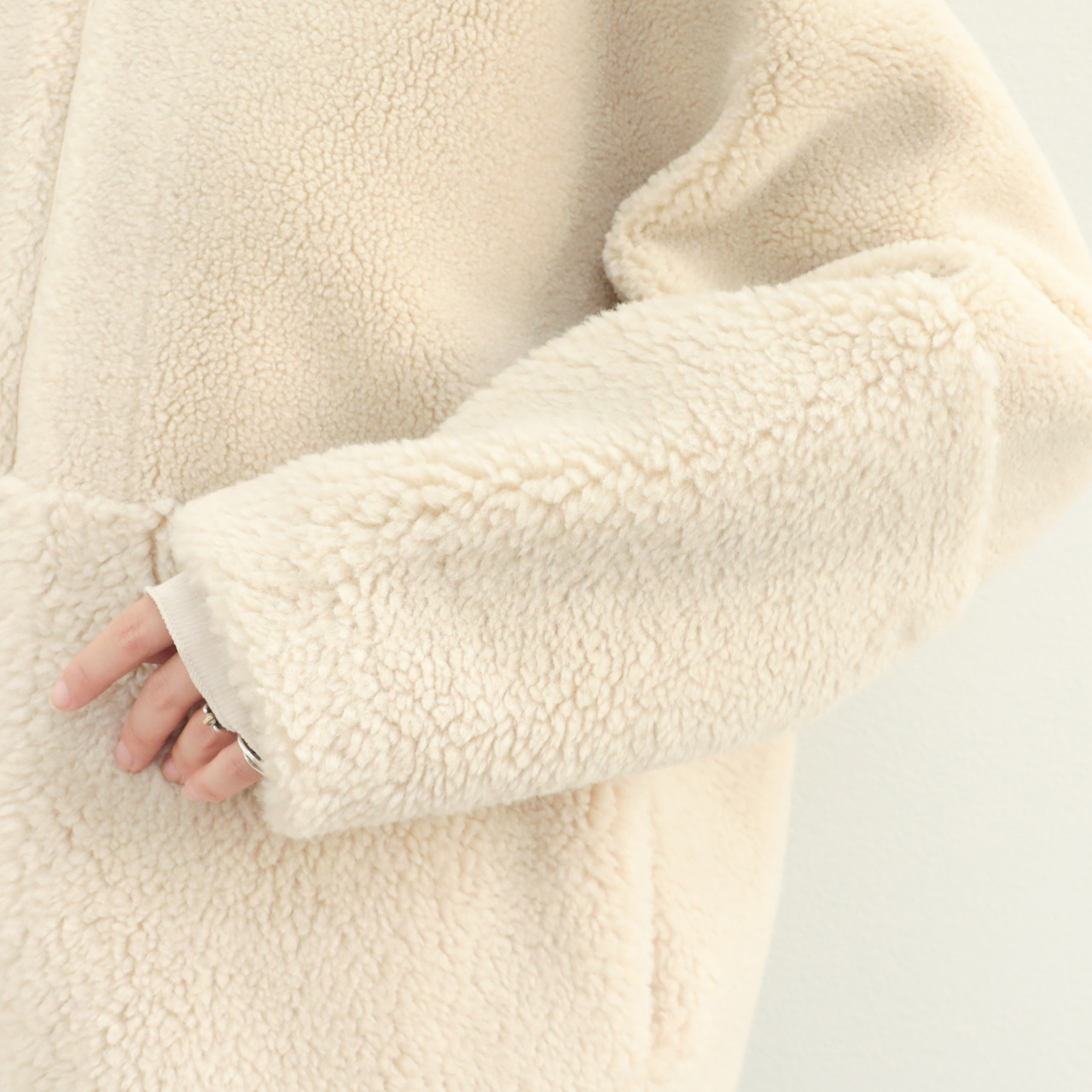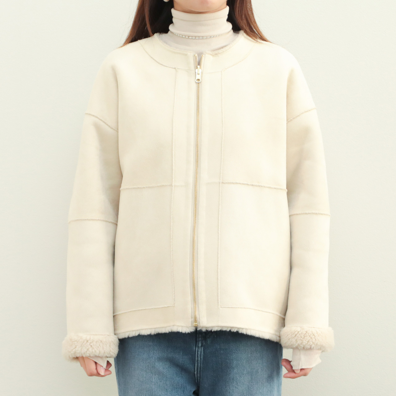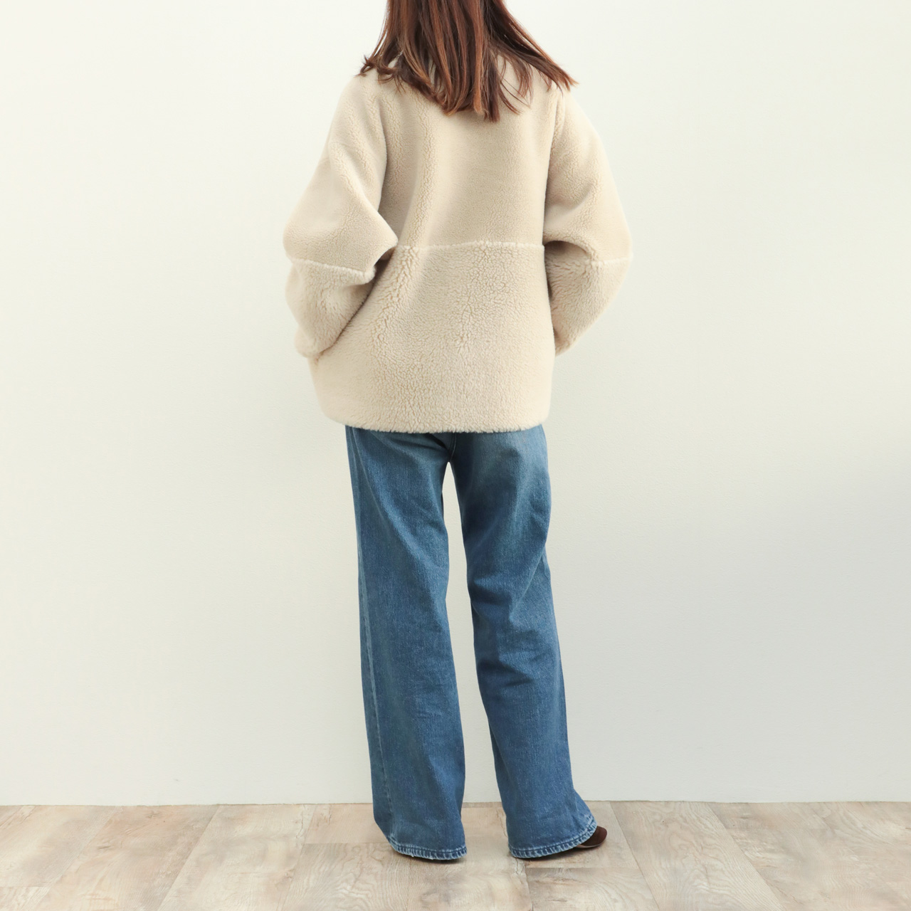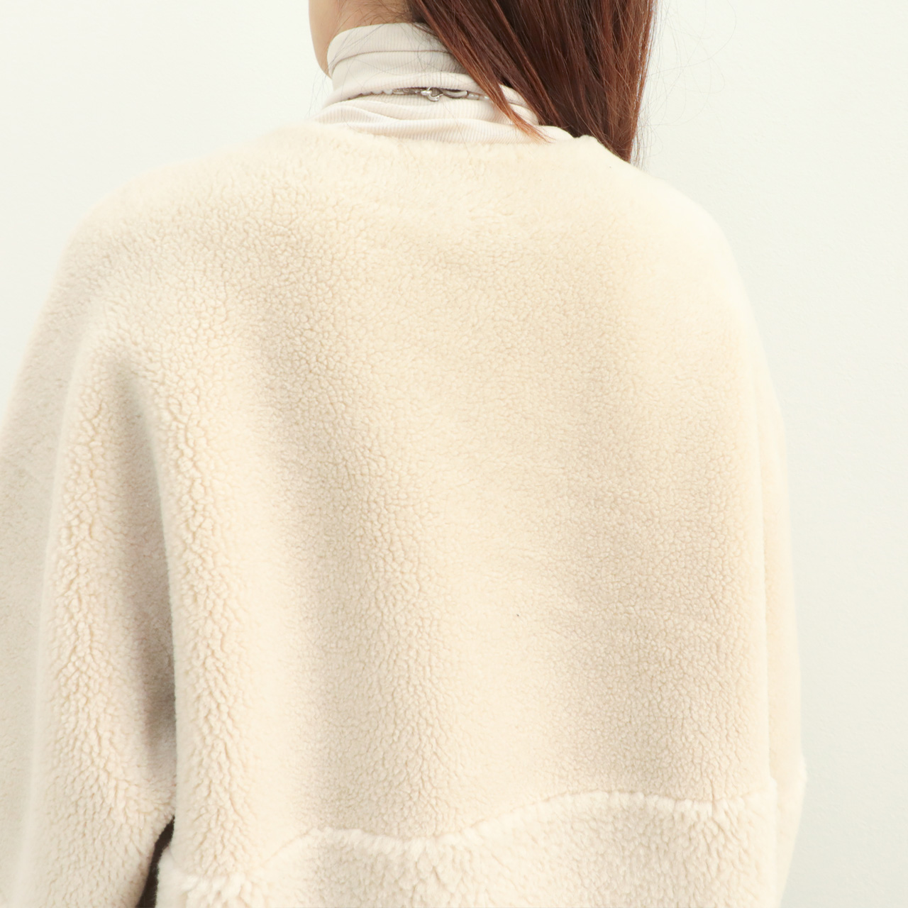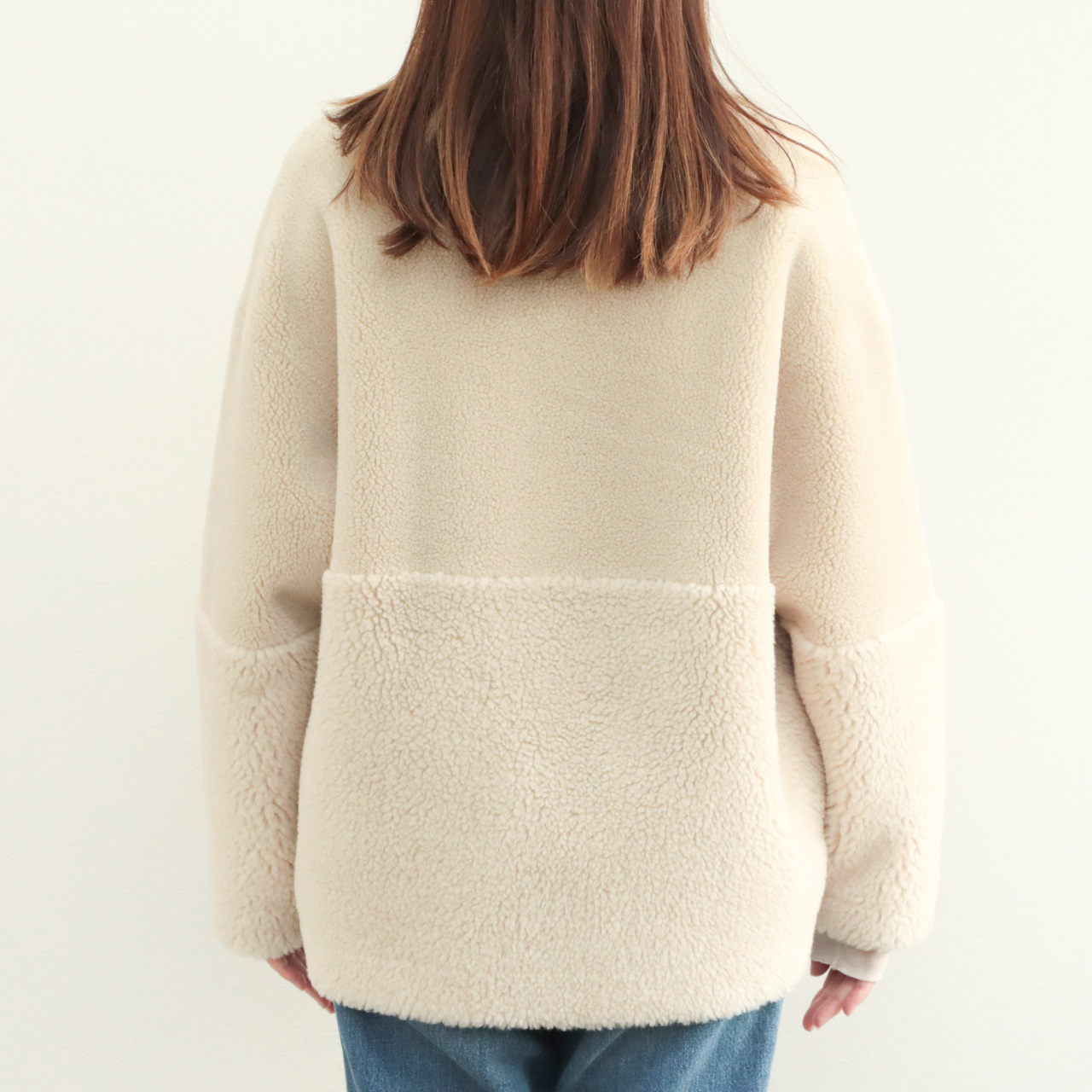 毛足の異なるボアを袖とウエスト辺りで切り替えた、表情感のある見た目になっており、スエード面を表にすると、袖口からボアが覗くところもデザインポイントです。