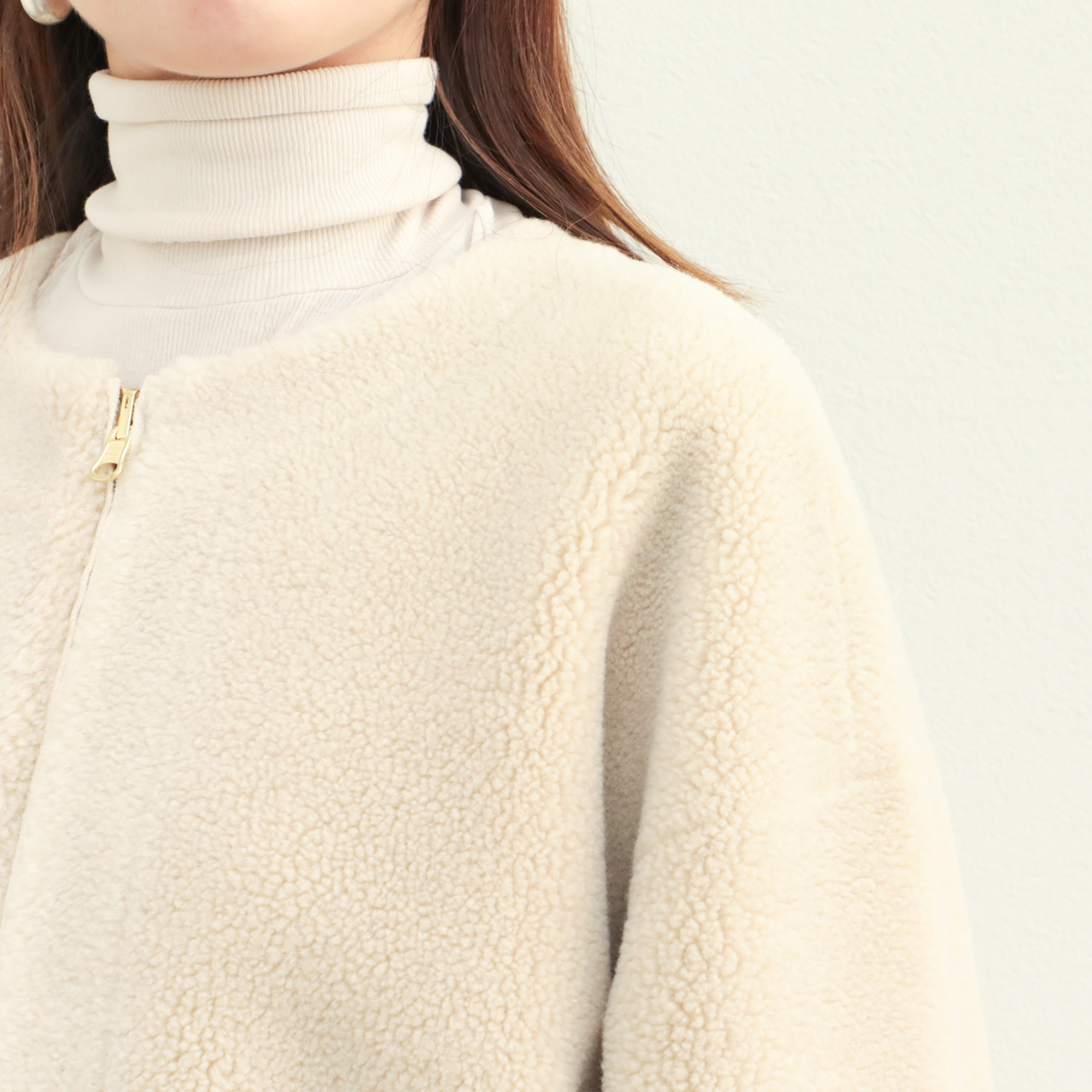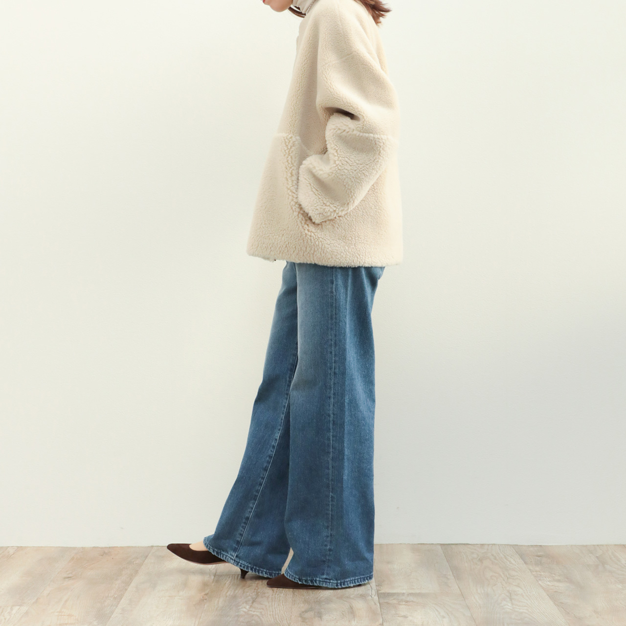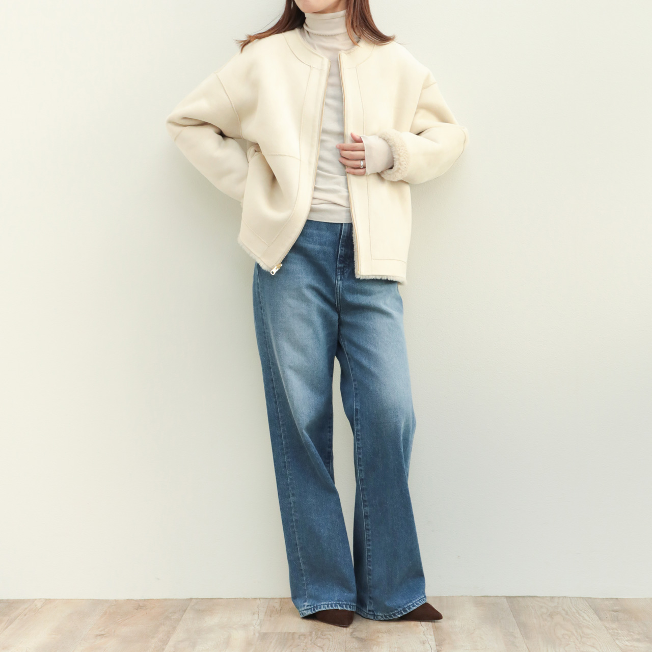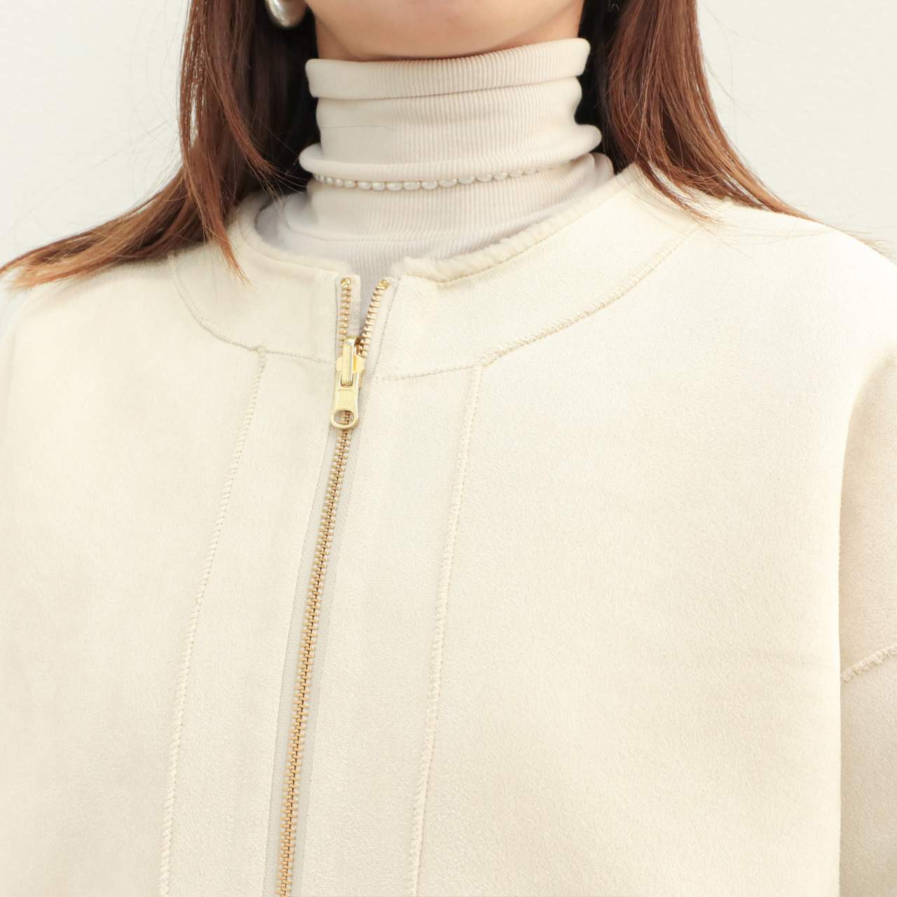 毛足の異なるボアを袖とウエスト辺りで切り替えた、表情感のある見た目になっており、スエード面を表にすると、袖口からボアが覗くところもデザインポイントです。
