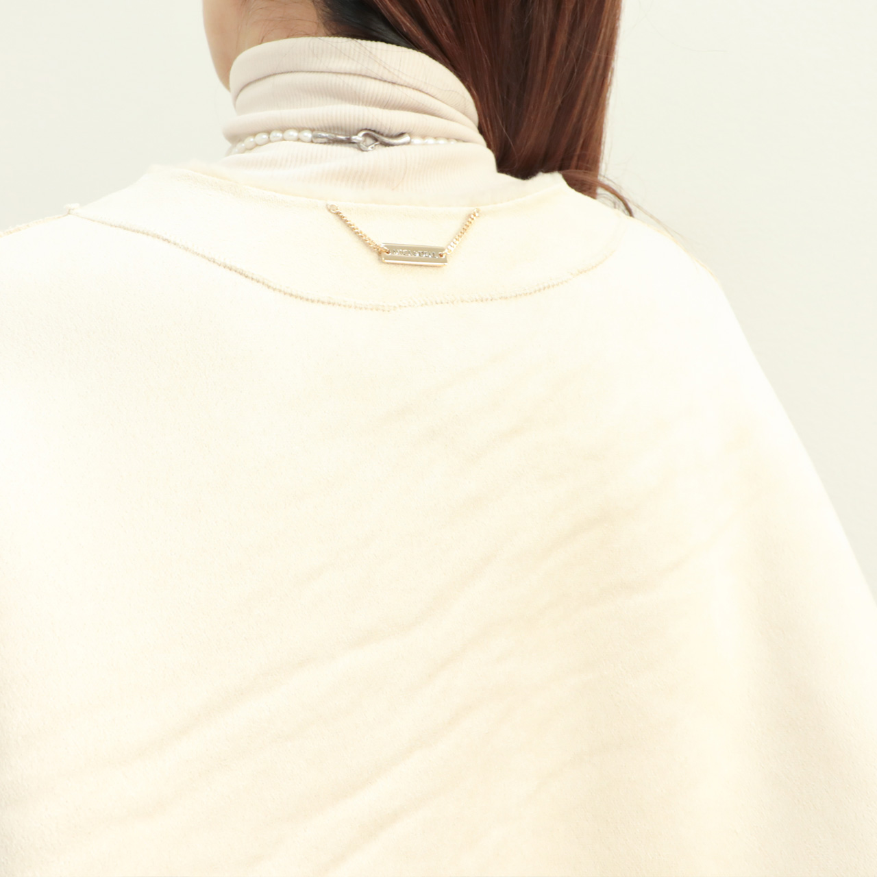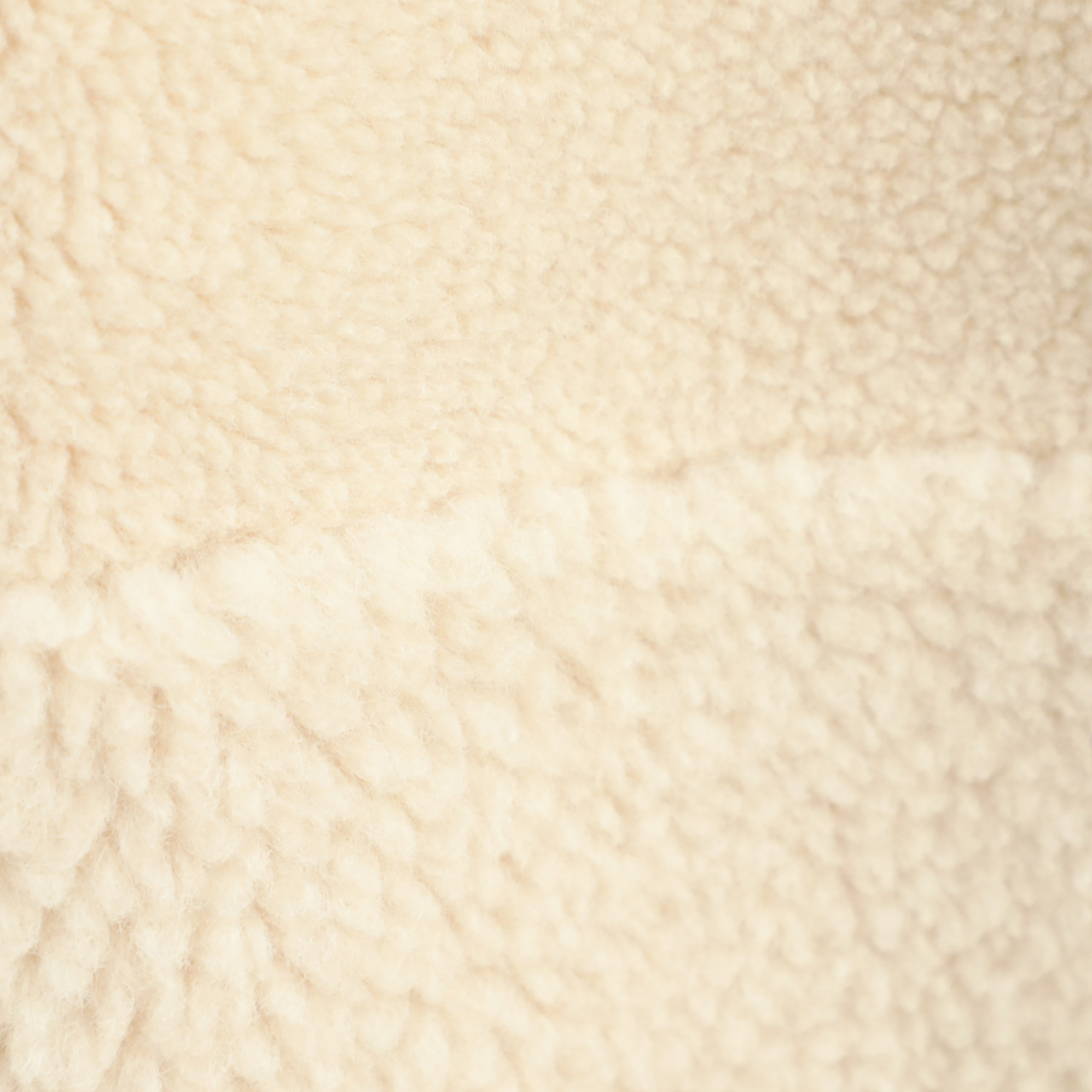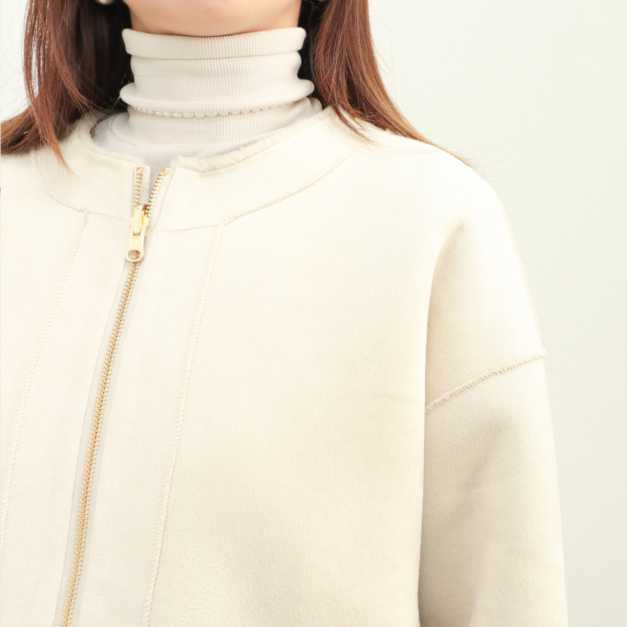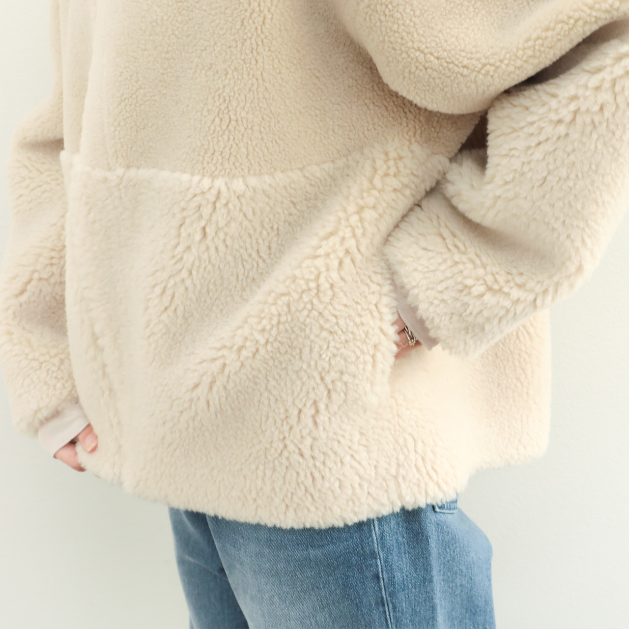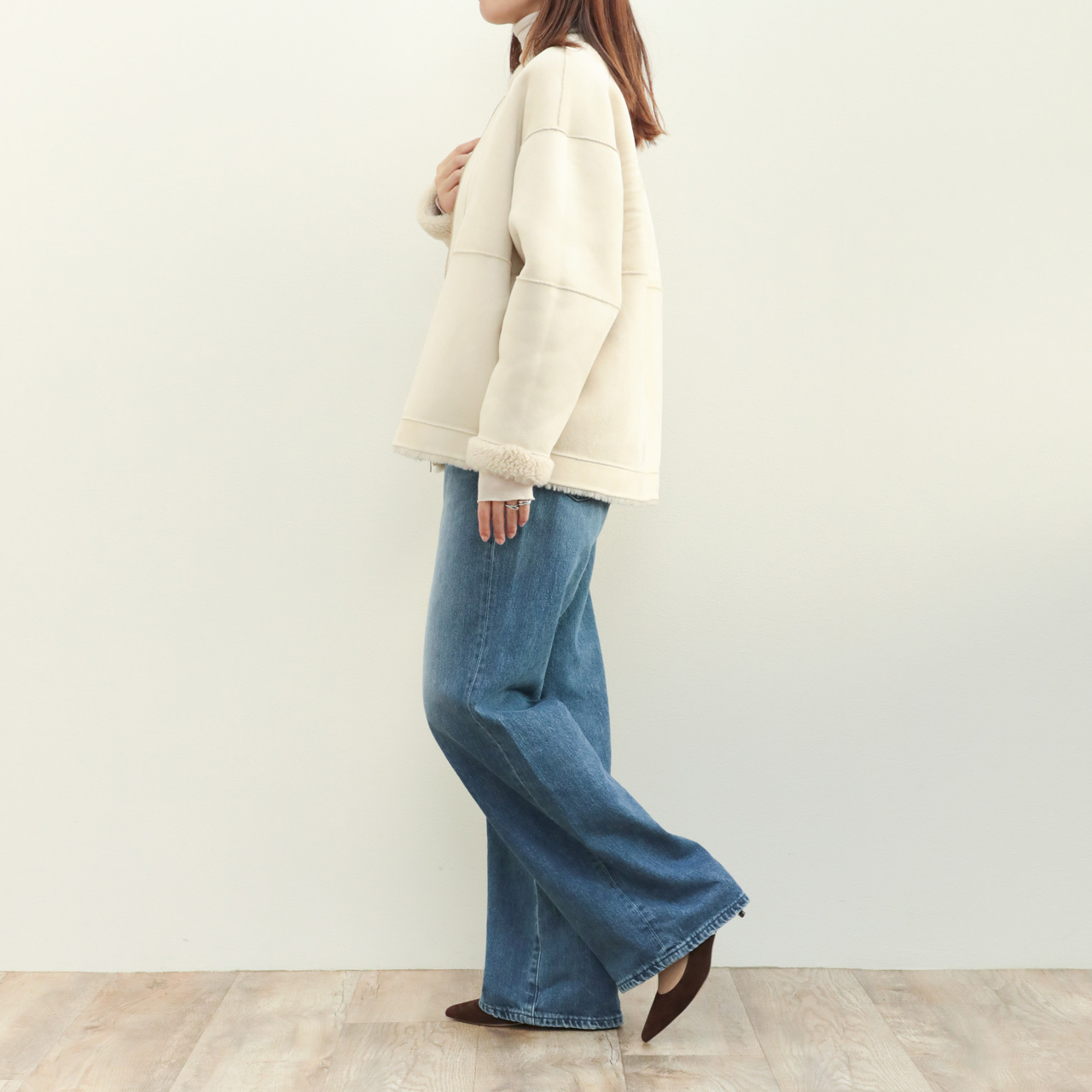 毛足の異なるボアを袖とウエスト辺りで切り替えた、表情感のある見た目になっており、スエード面を表にすると、袖口からボアが覗くところもデザインポイントです。