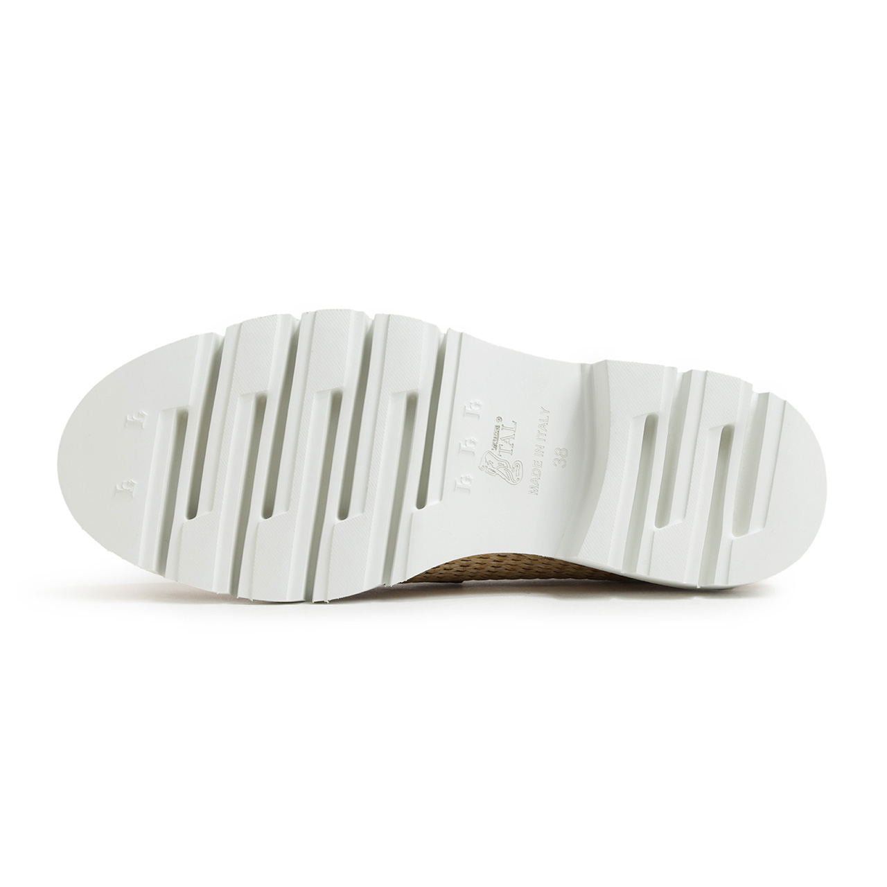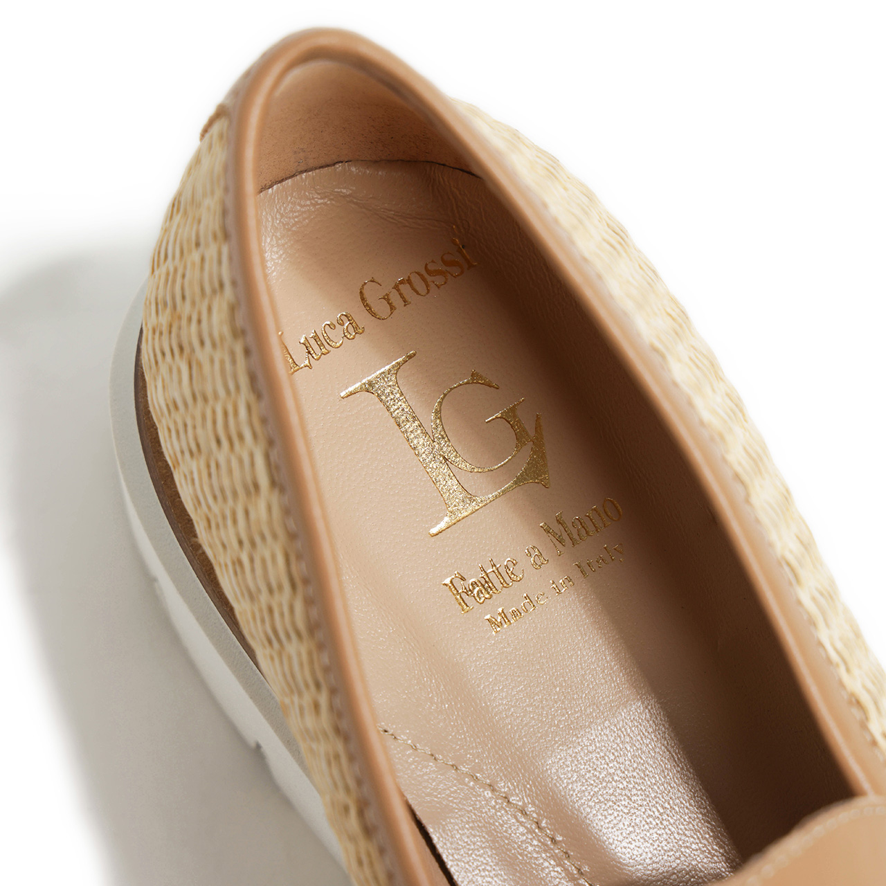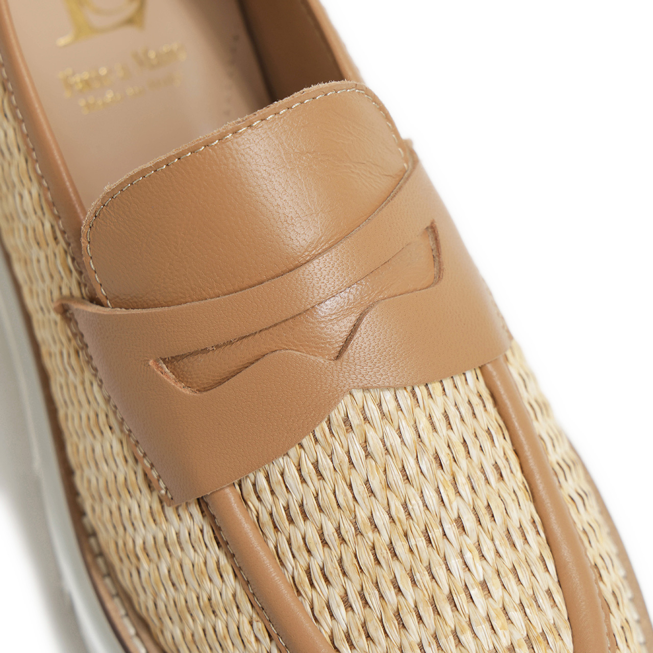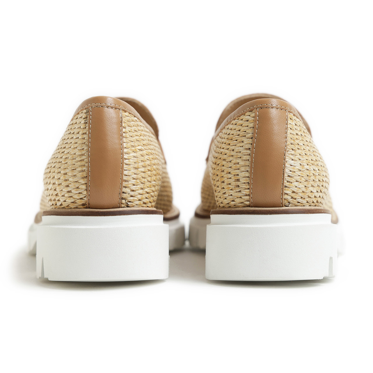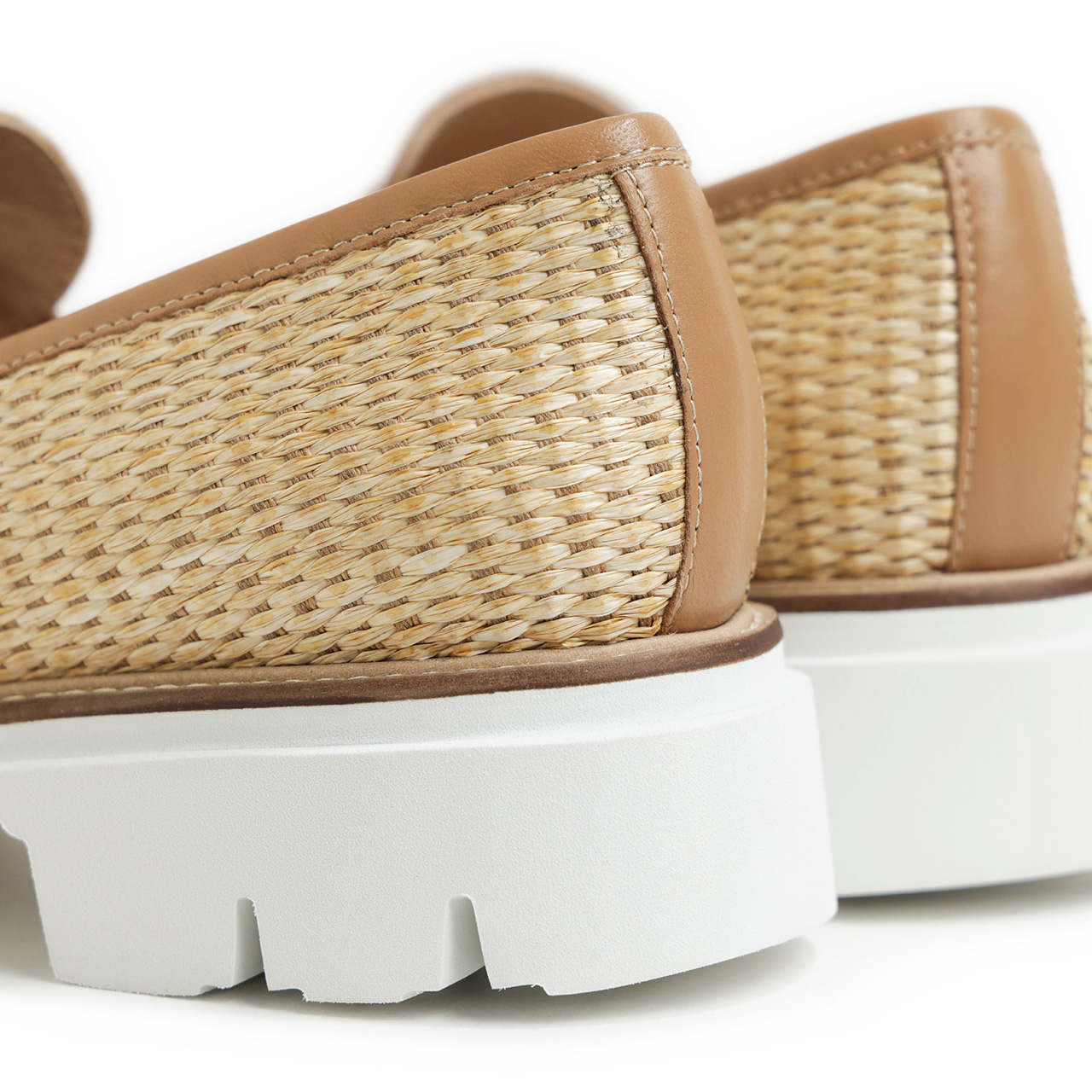 アッパーには天然素材のラフィアを織り上げたシートを使用。夏らしい軽快さの溢れる素材感に仕上がっており、切り替えに使用したベージュカラーのレザーとのバランスも絶妙。