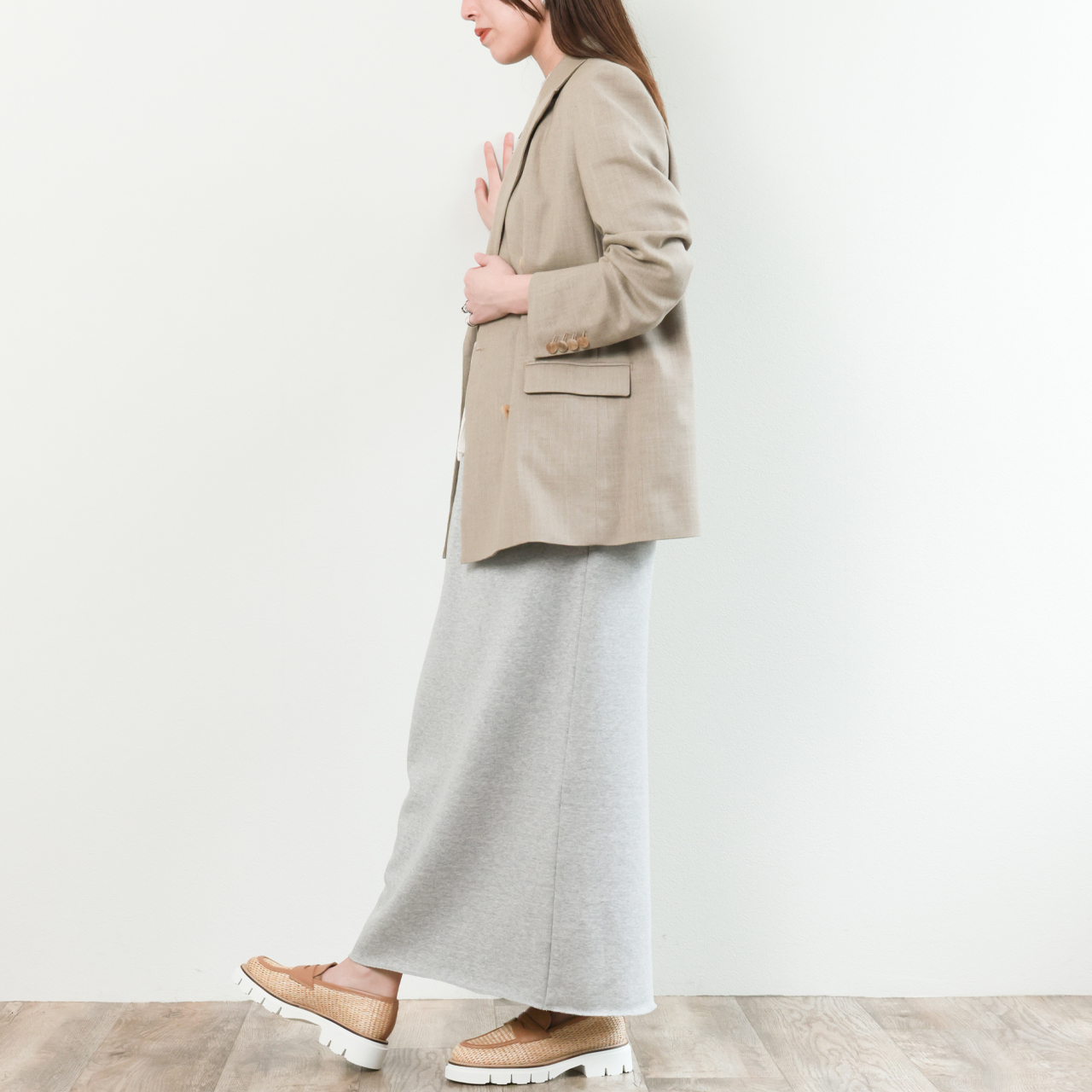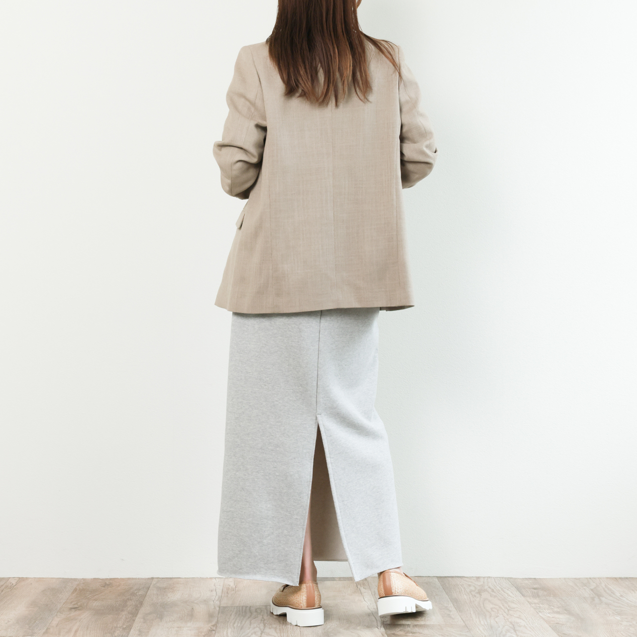 着丈を少し長めに設定し、ラペルもピークドラペルなので、縦の綺麗なラインが印象的です。