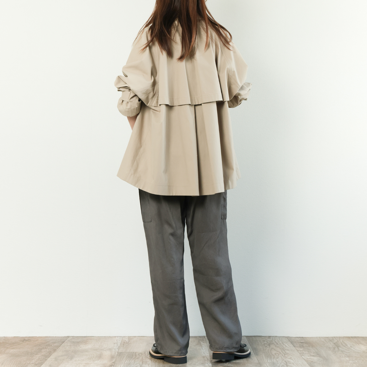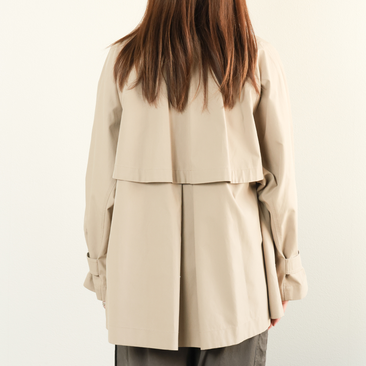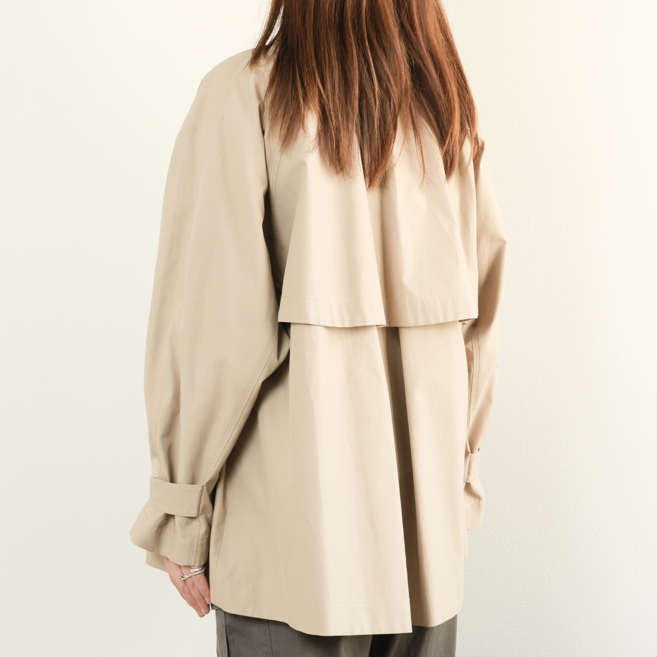 デザインはケープバックを付け、たっぷりと生地をとることでドレープが生まれ、バックシャンな一枚となっている上、袖口のタブでシルエットの調整も可能。