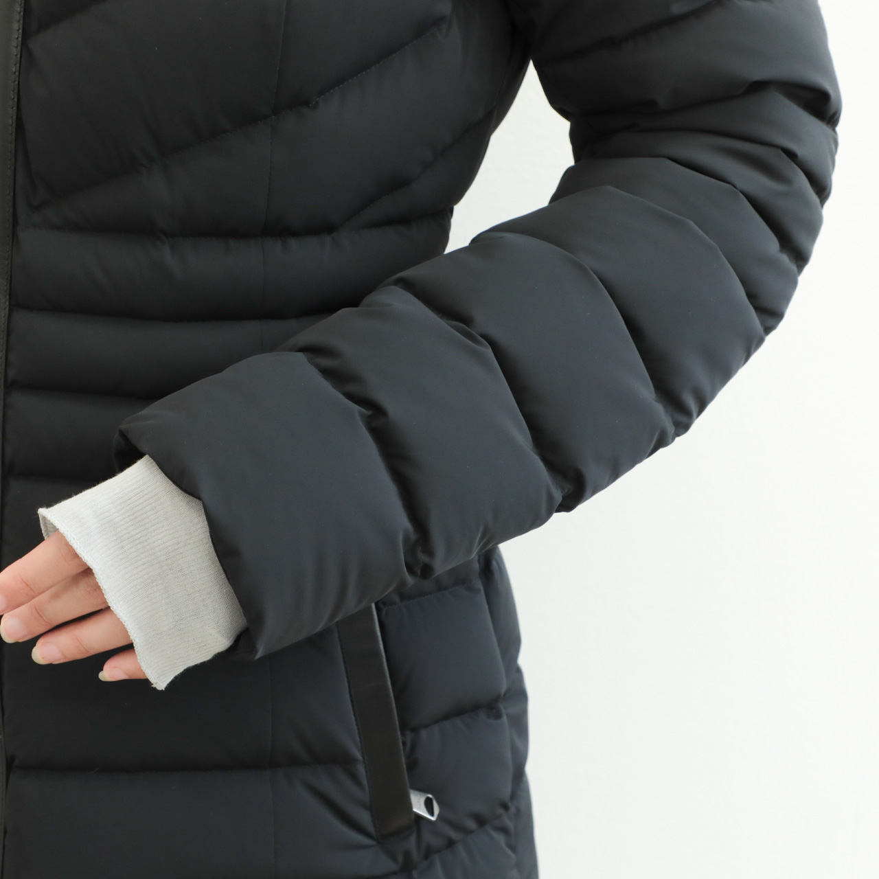 生地と共に特徴的なのがこちらのシルエット。ストレッチ素材を使用しているからこその絞りの効いたウエストシェイプ。ダウンとは思えないほど着ぶくれ感なくすっきりと着ていただけます。