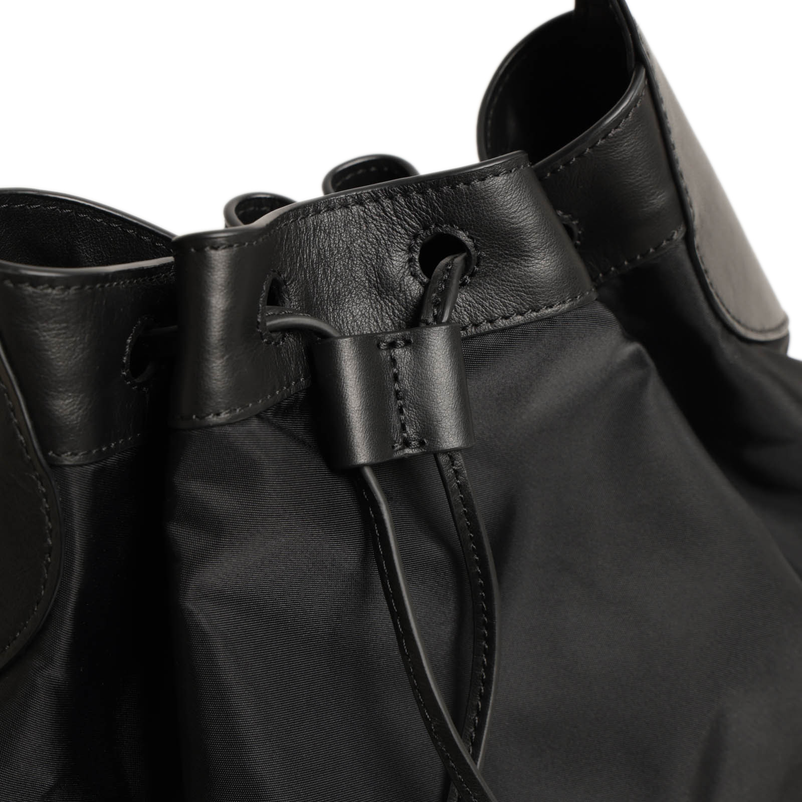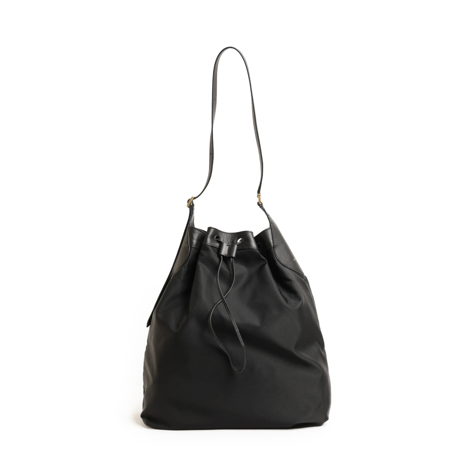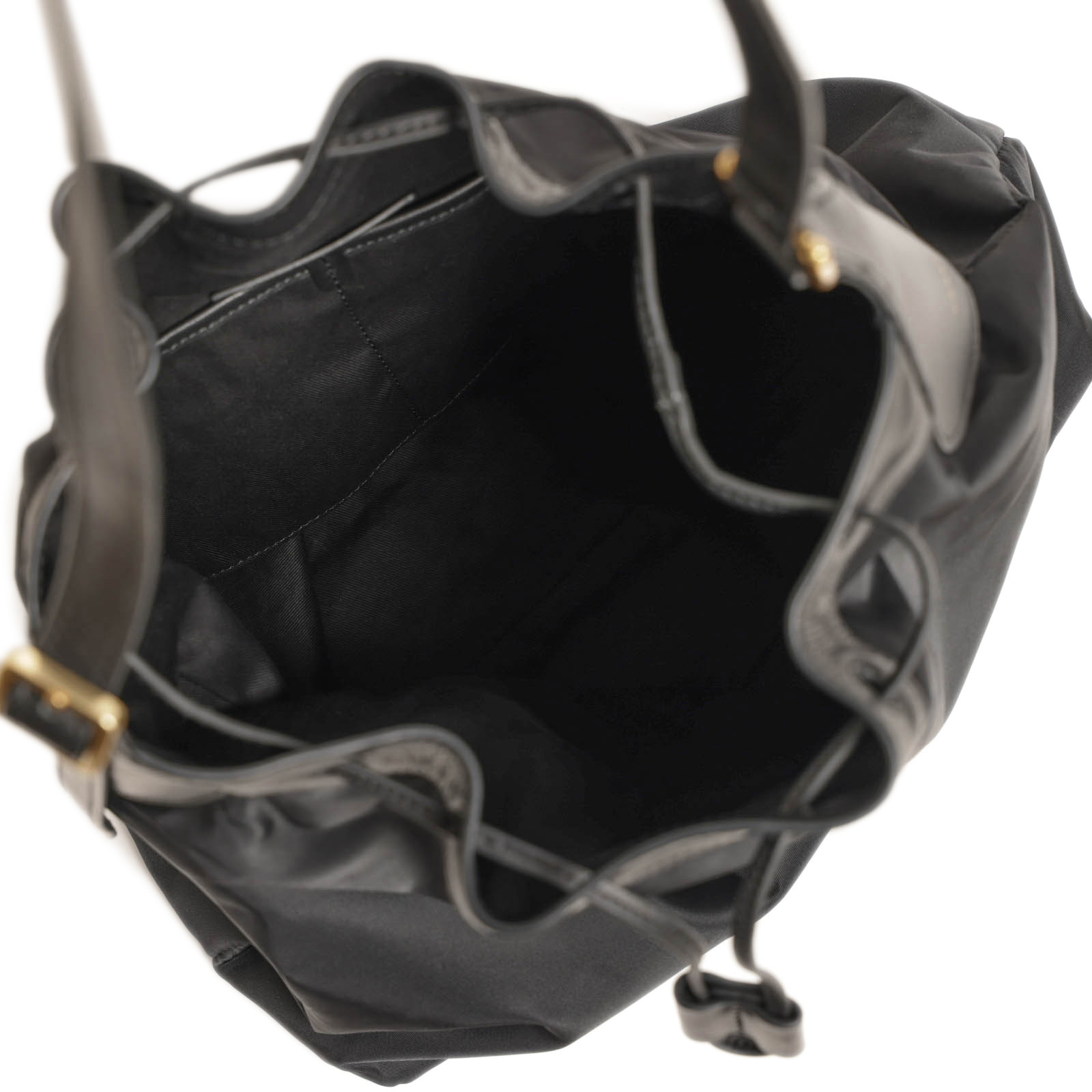 こちらは素材切り替えがポイントとなった巾着バッグ。A4サイズが納められるようなサイズ感のこちら。マチを抑えているので体に沿って馴染み、収まりの良い仕様になっております。