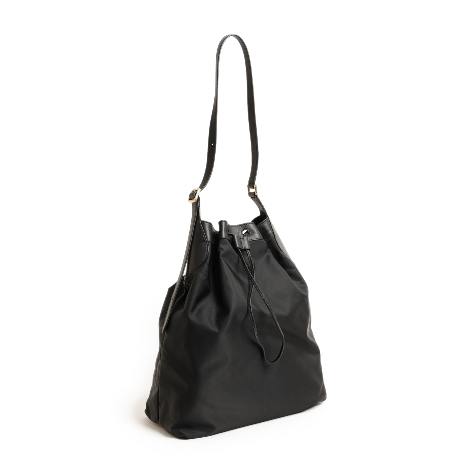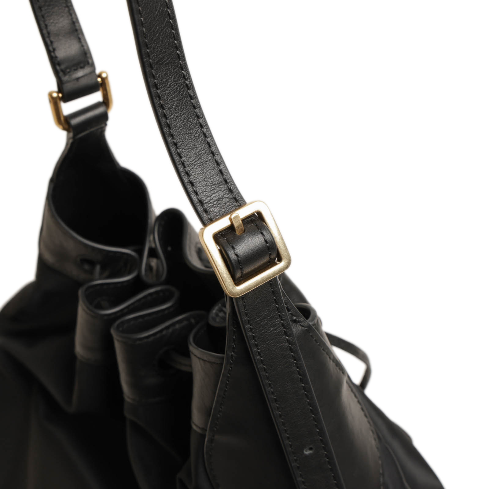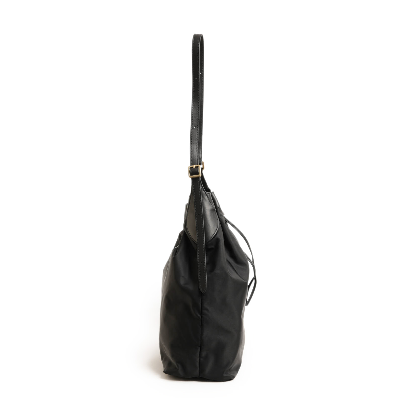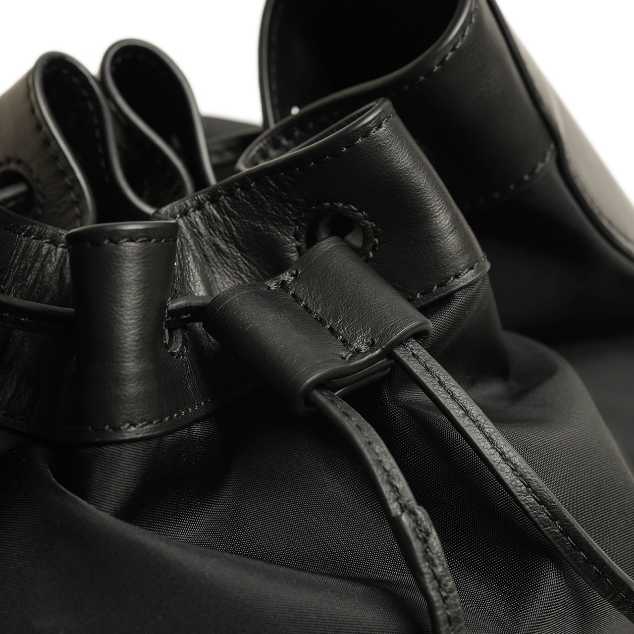 こちらは素材切り替えがポイントとなった巾着バッグ。A4サイズが納められるようなサイズ感のこちら。マチを抑えているので体に沿って馴染み、収まりの良い仕様になっております。