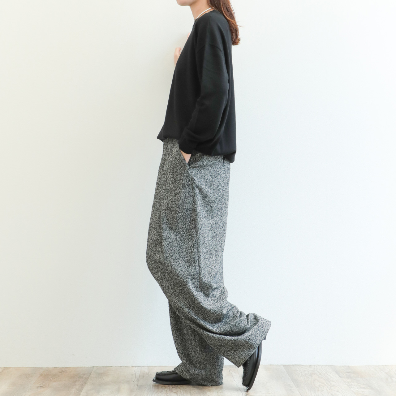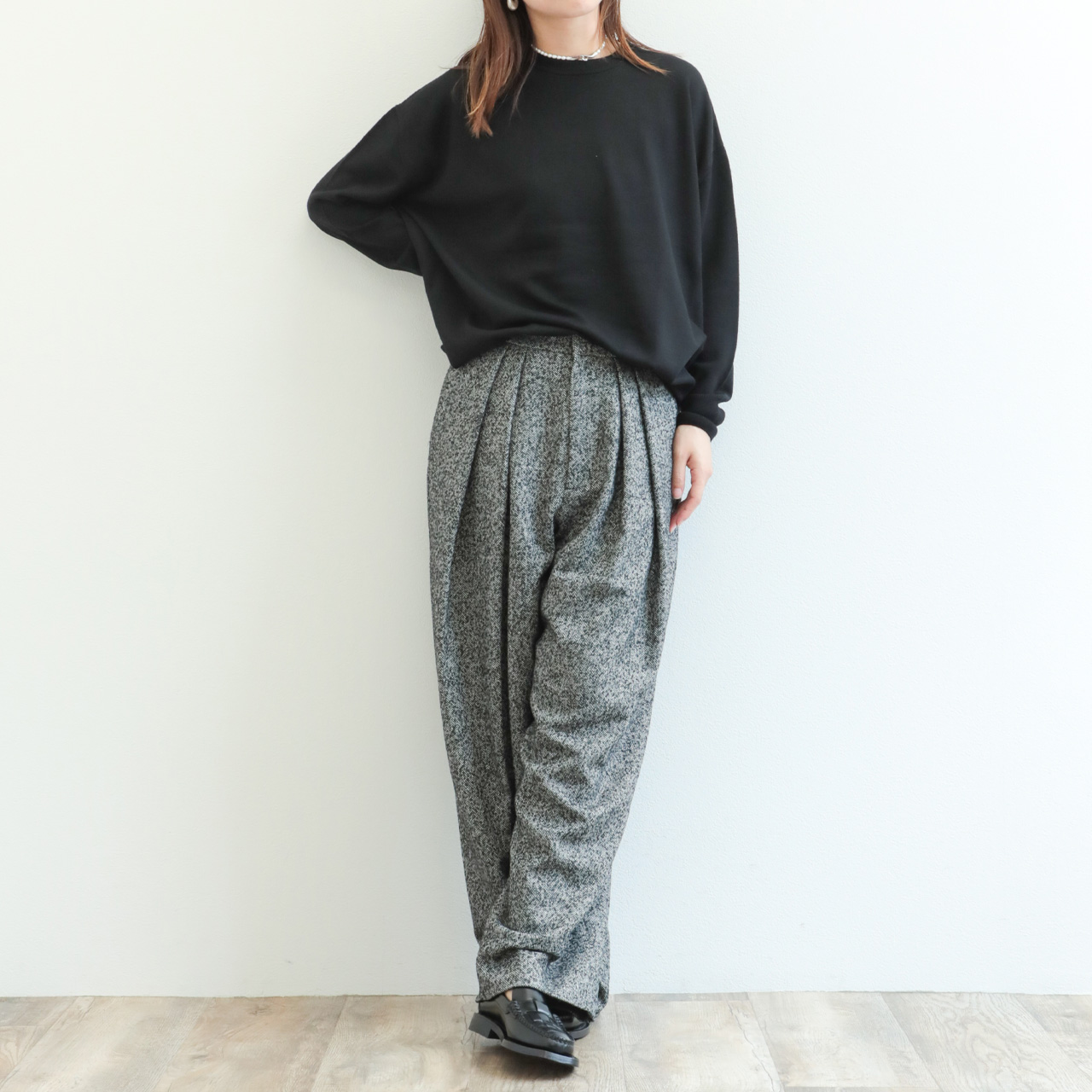深くたたんだフロントタックからなるワイドシルエットと、裾にかけてテーパードさせたラインがマニッシュな雰囲気を醸し出します。バックスタイルの尾錠付きベルテッドディテールもポイント。