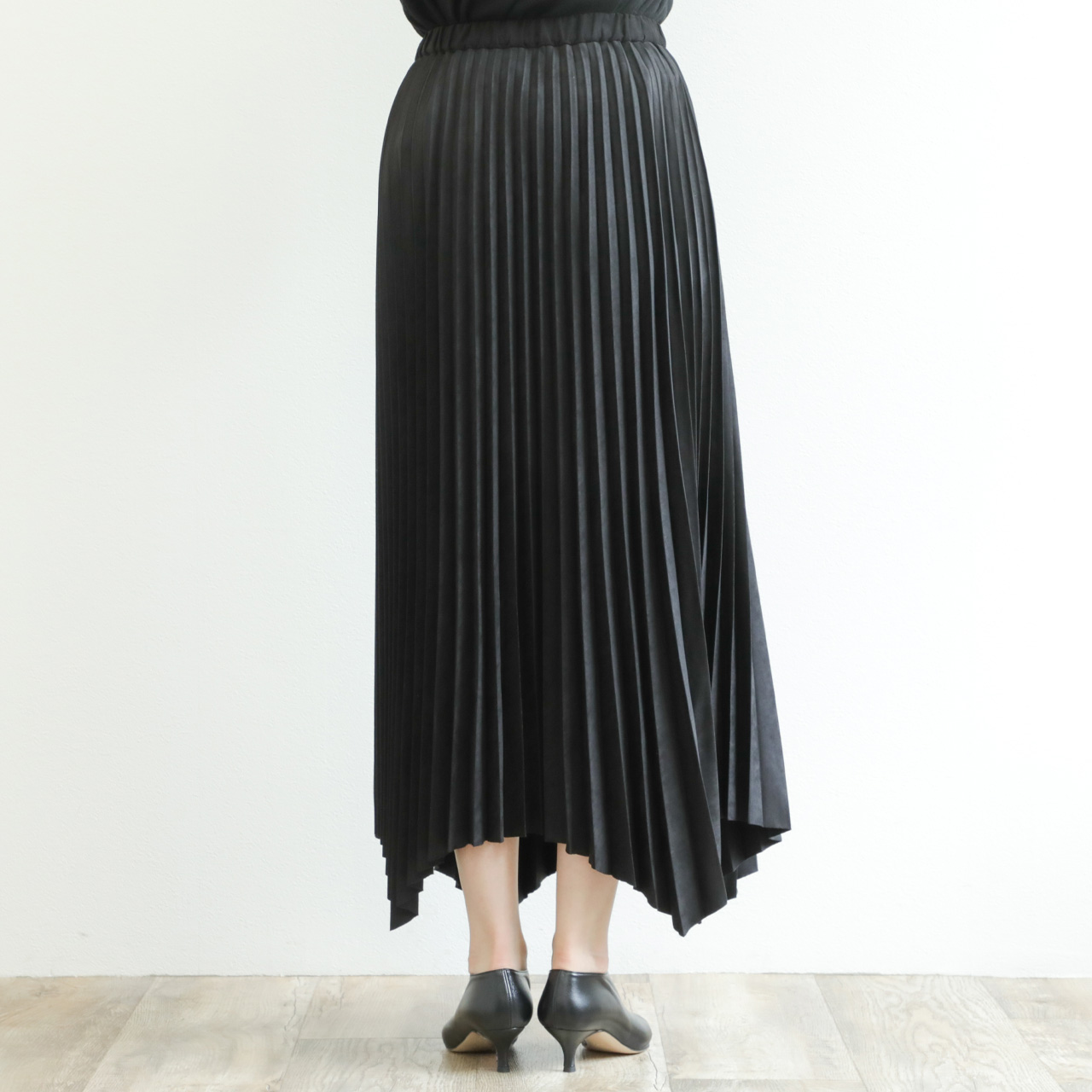 こちらはソフトな柔らかさと滑らかなタッチが特徴のスエードライク素材を使用したプリーツスカート。