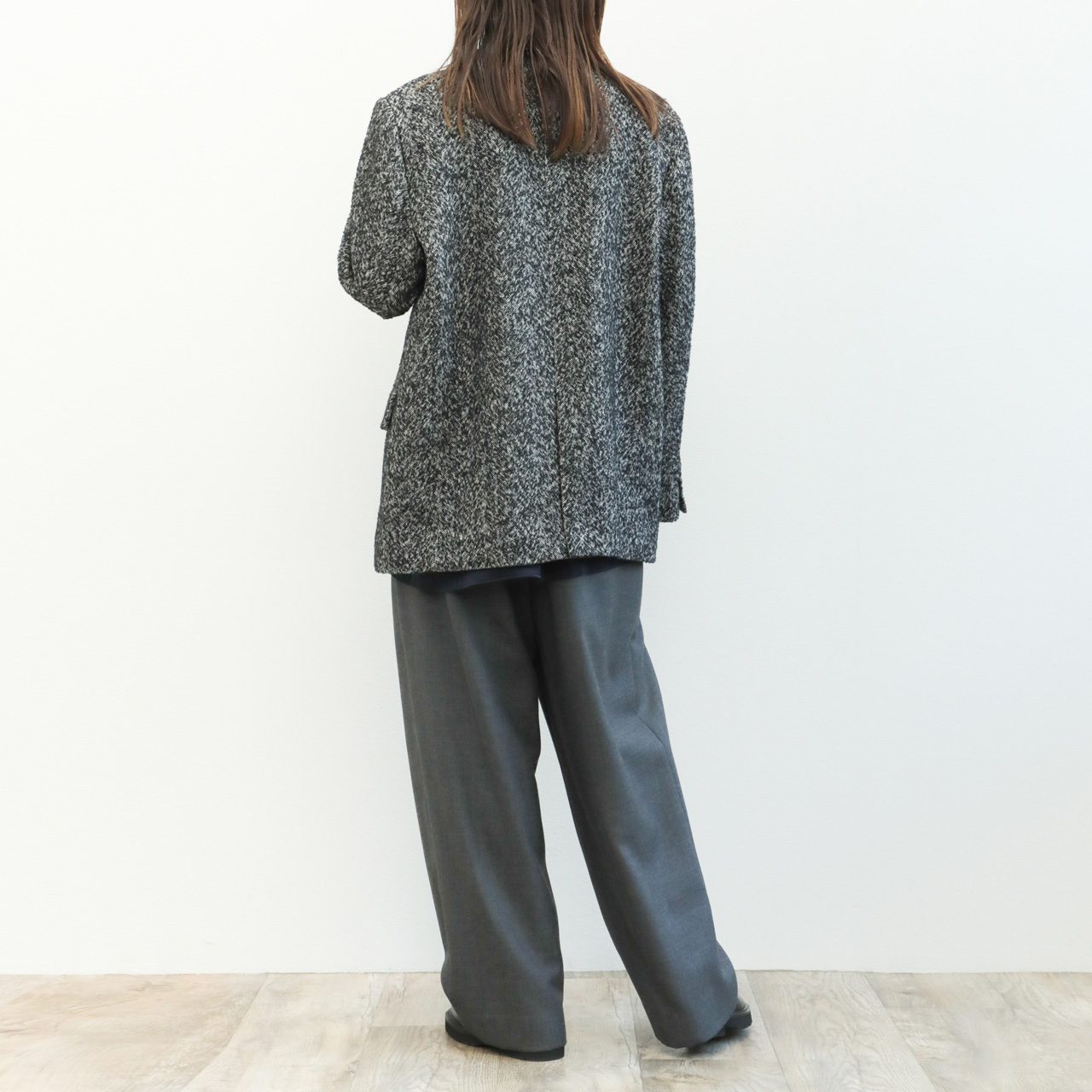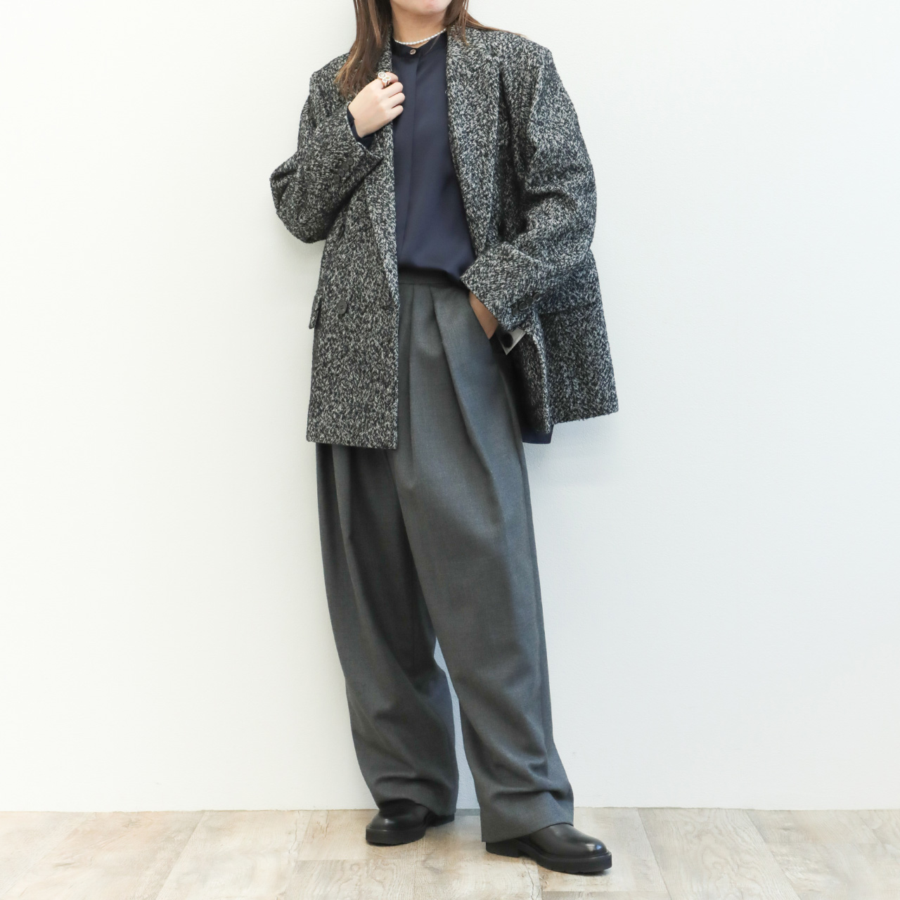 カラーはブラックをご用意。メランジ調のブラックになりますので、グレー、ホワイト、ブラックはもちろん、カラーを効かせてもOKですので、様々なスタイリングで合わせていただけます。