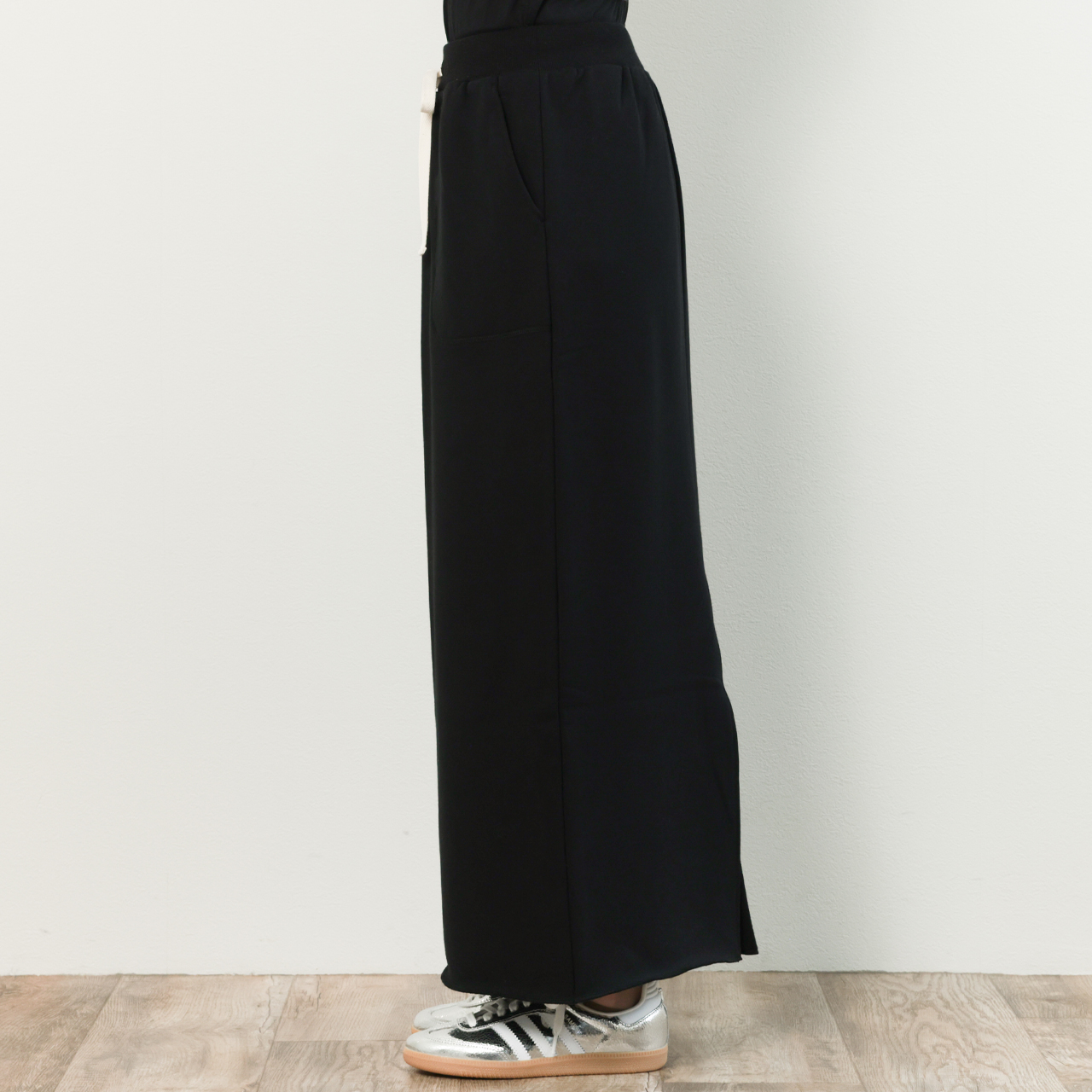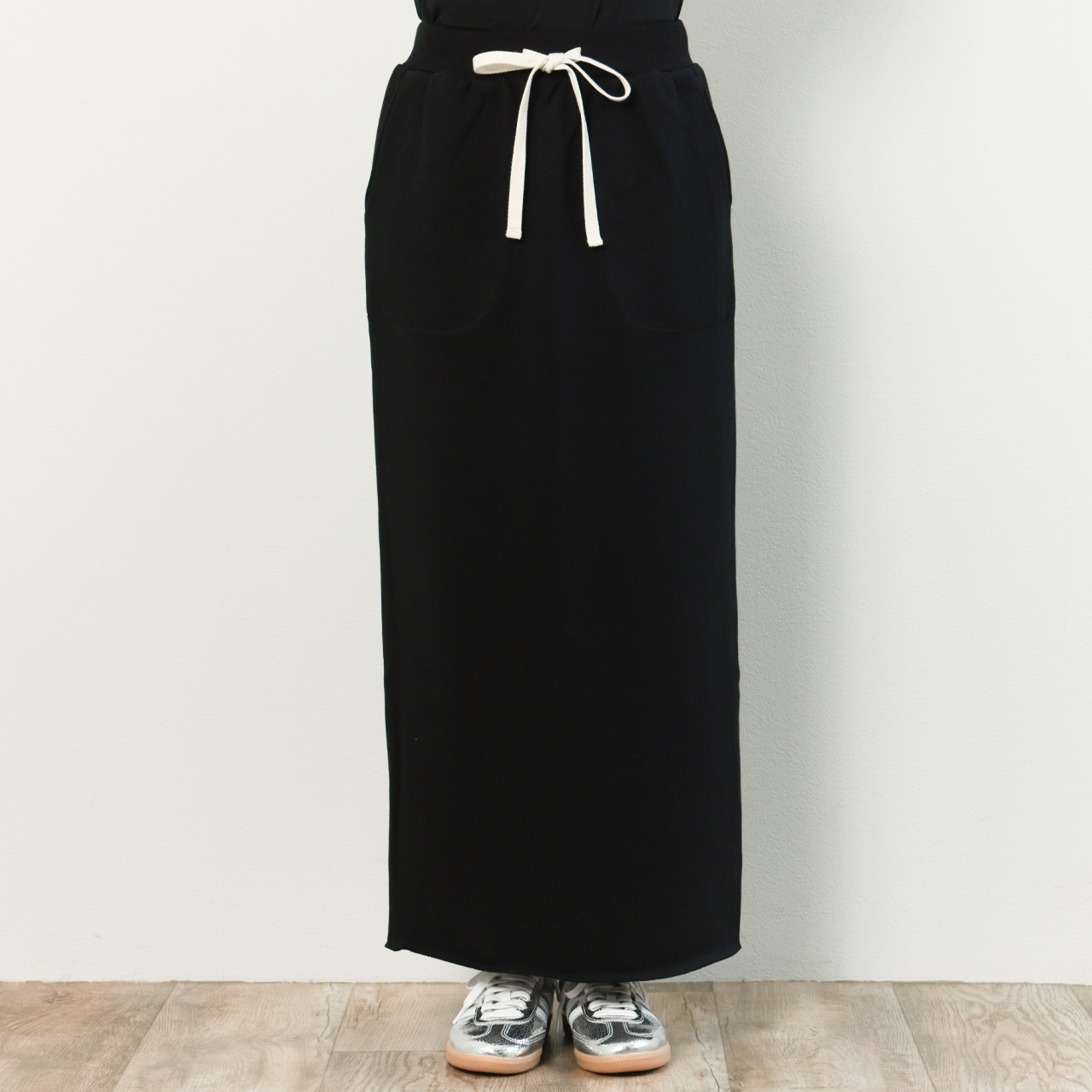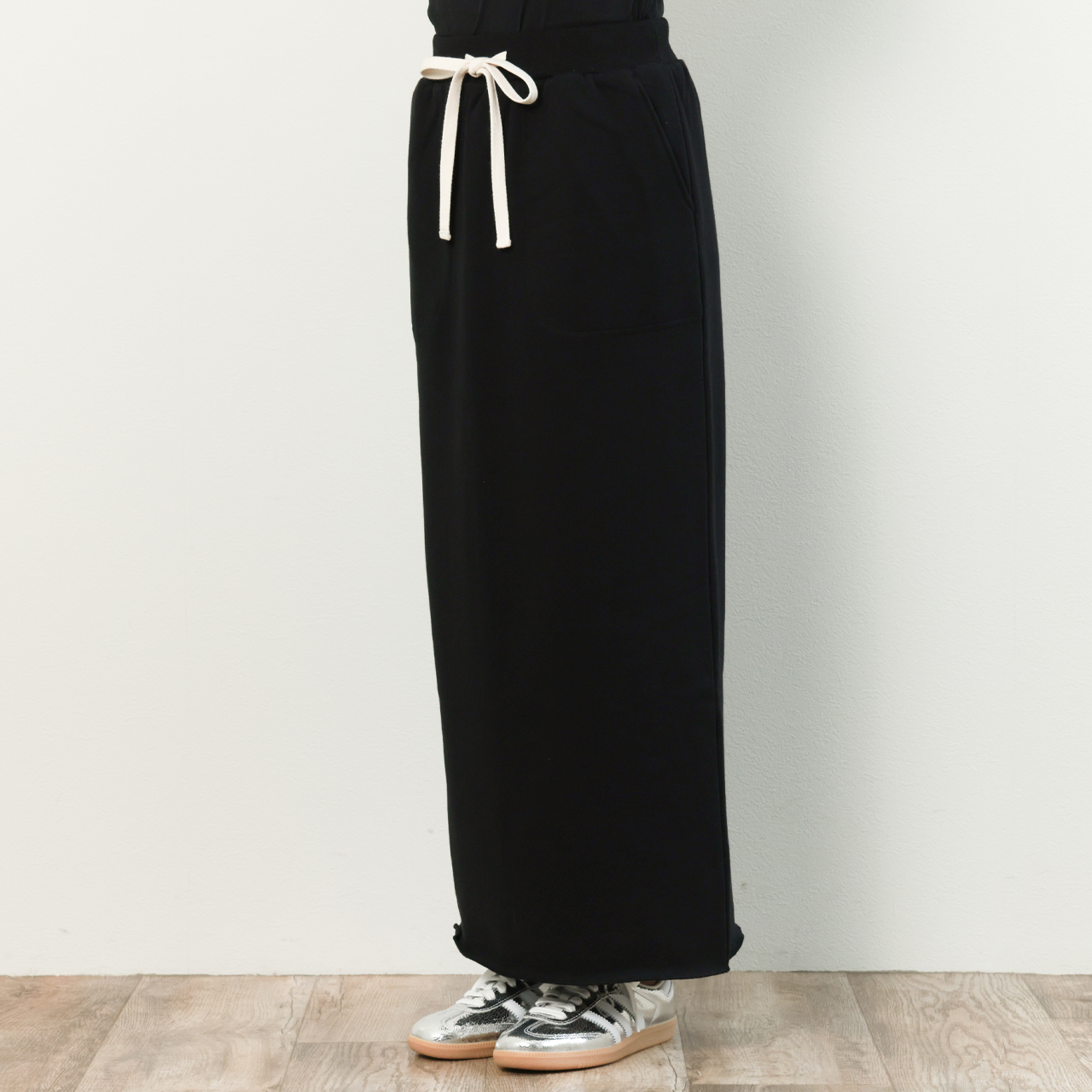 後ろ側の裾にはやや深めのスリットを入れることで裾捌きも良く、垂れさがったドローコードもそれ自体が一つのデザインとしてスタイリングにアクセントをプラスしてくれます。
