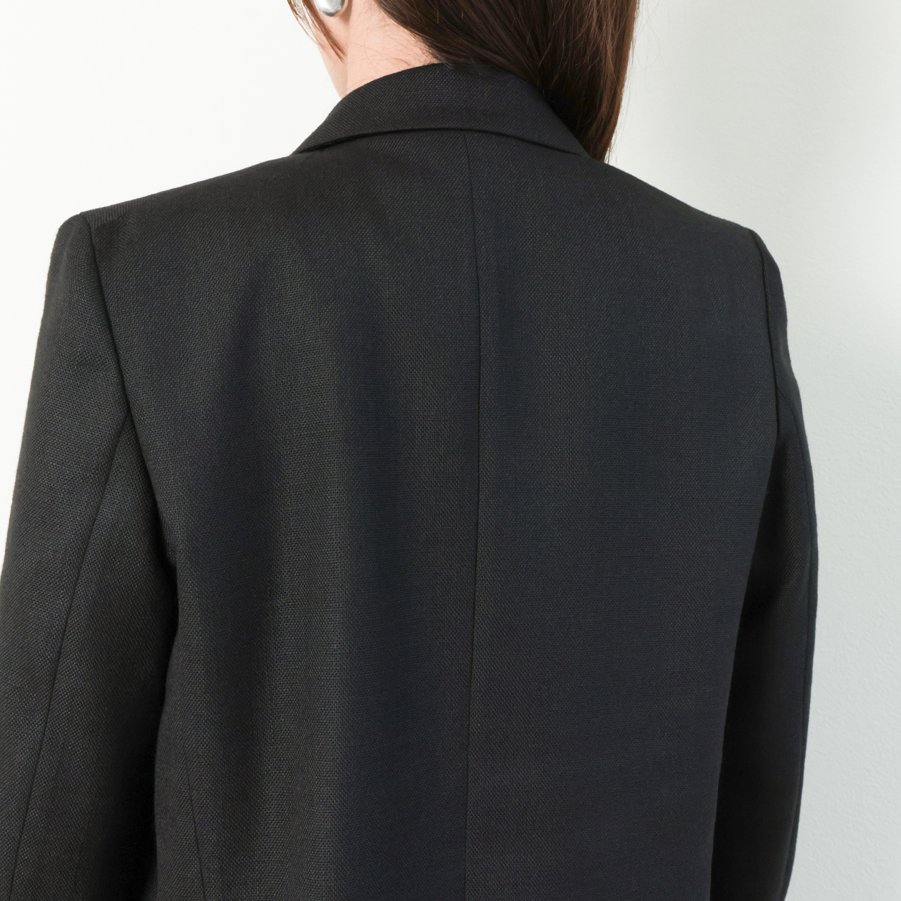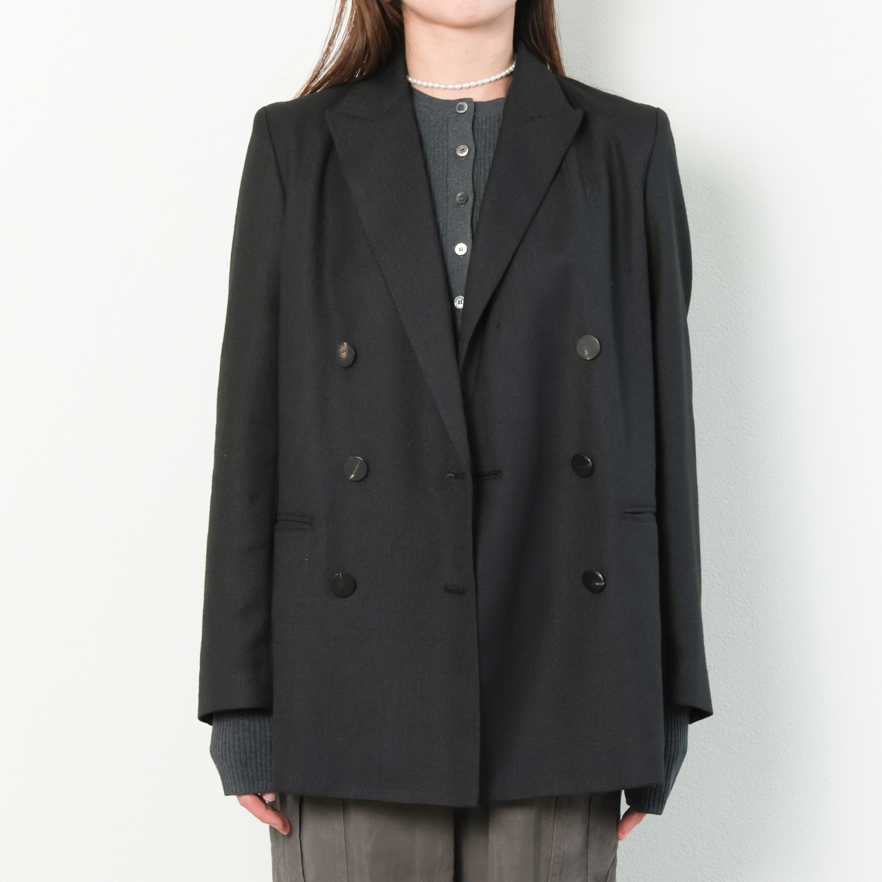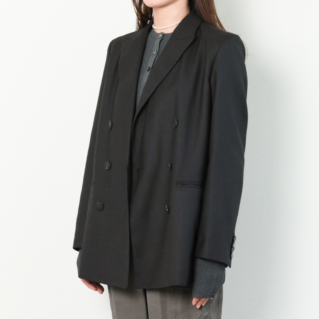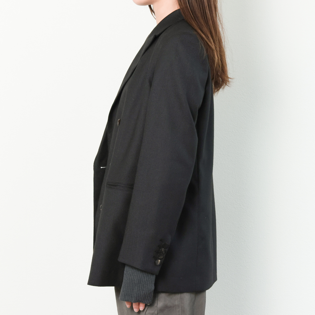 着丈を少し長めに設定し、ラペルもピークドラペルなので、縦の綺麗なラインが印象的です。