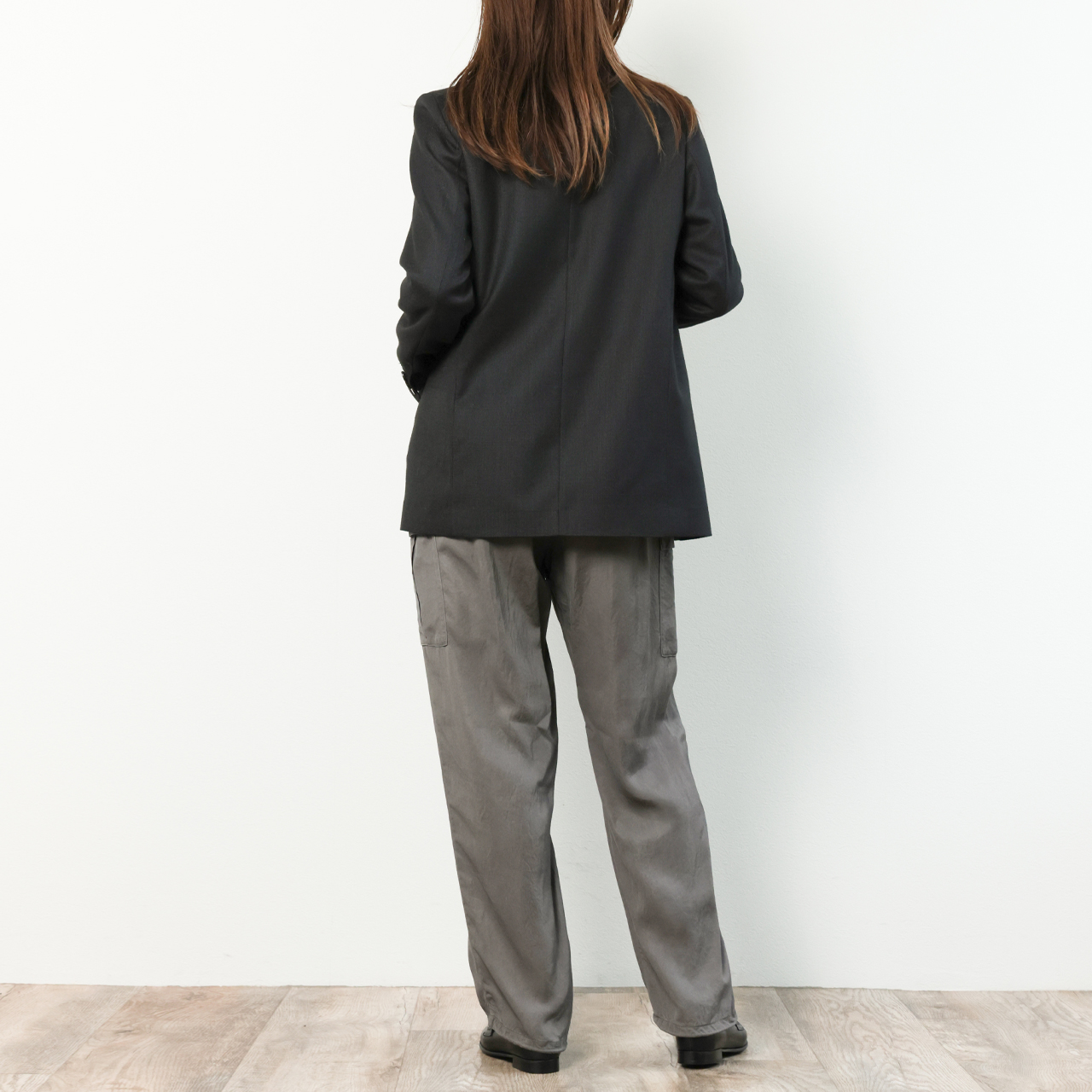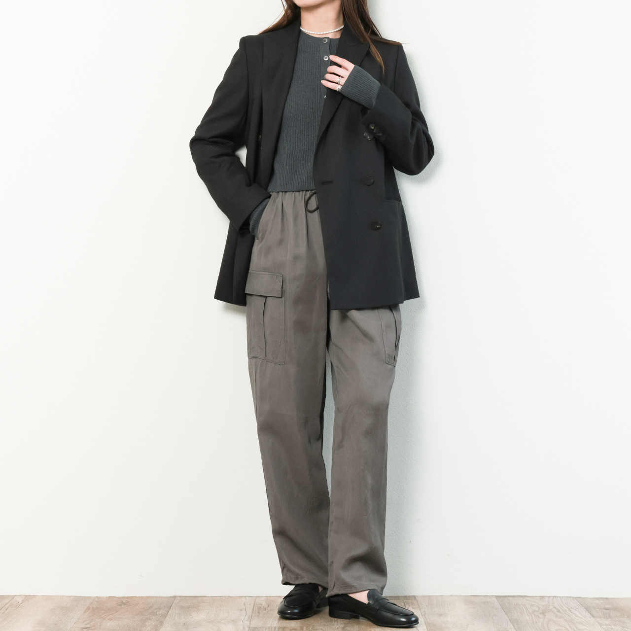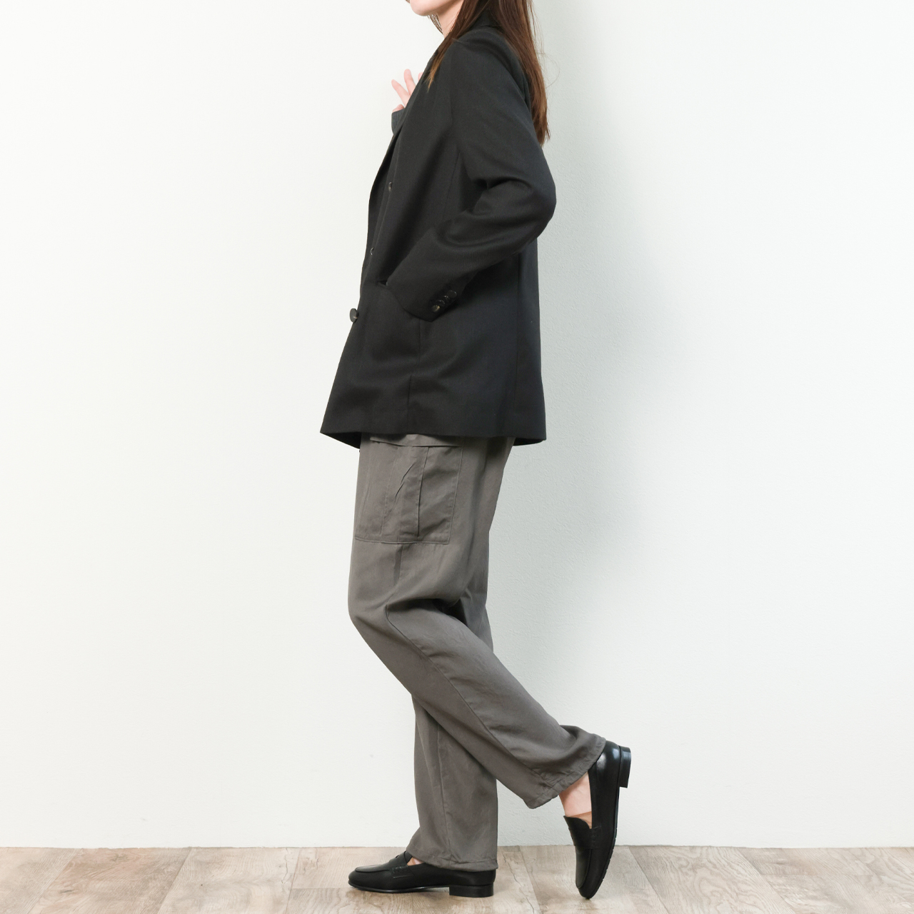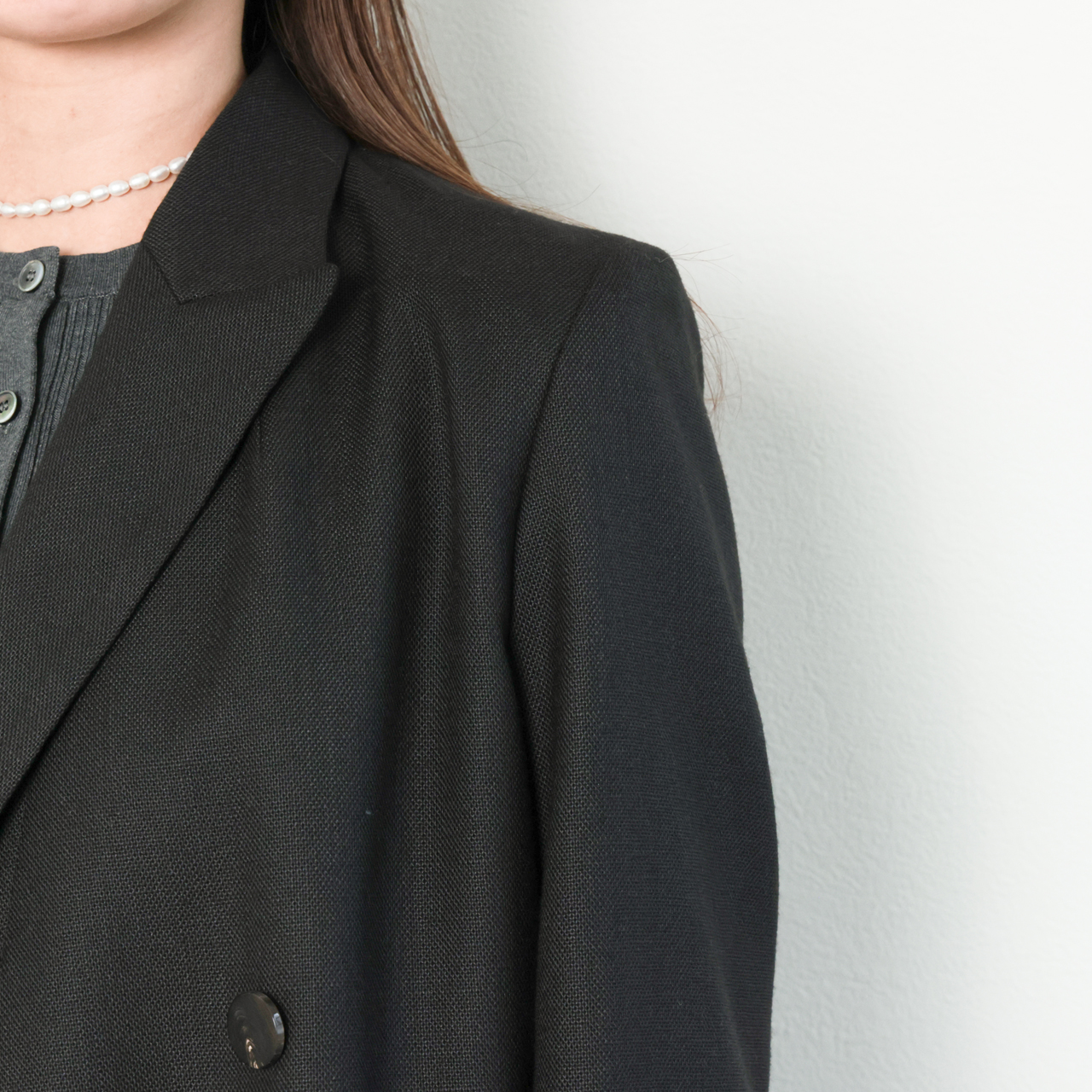 着丈を少し長めに設定し、ラペルもピークドラペルなので、縦の綺麗なラインが印象的です。