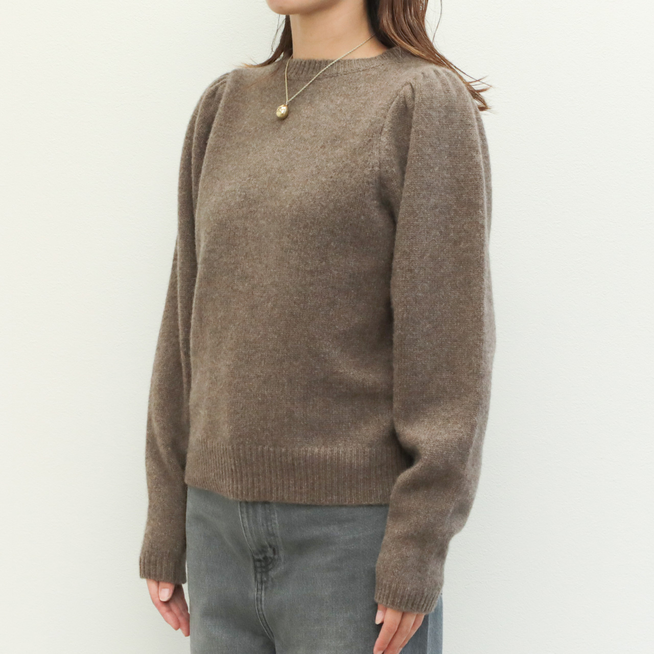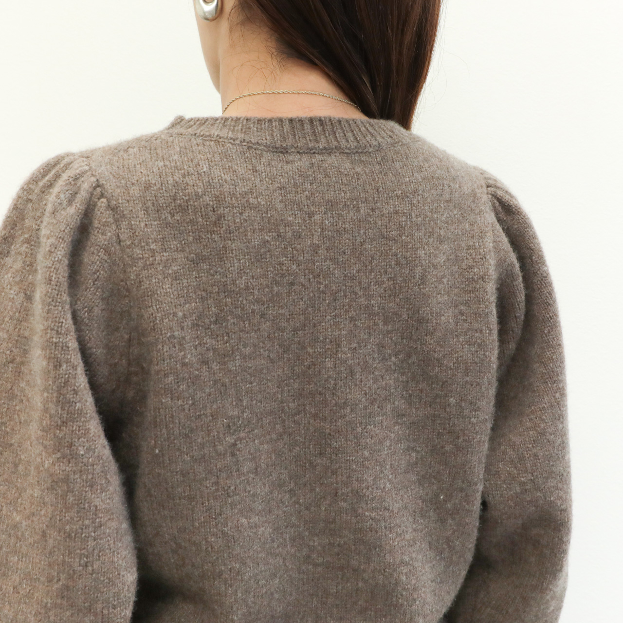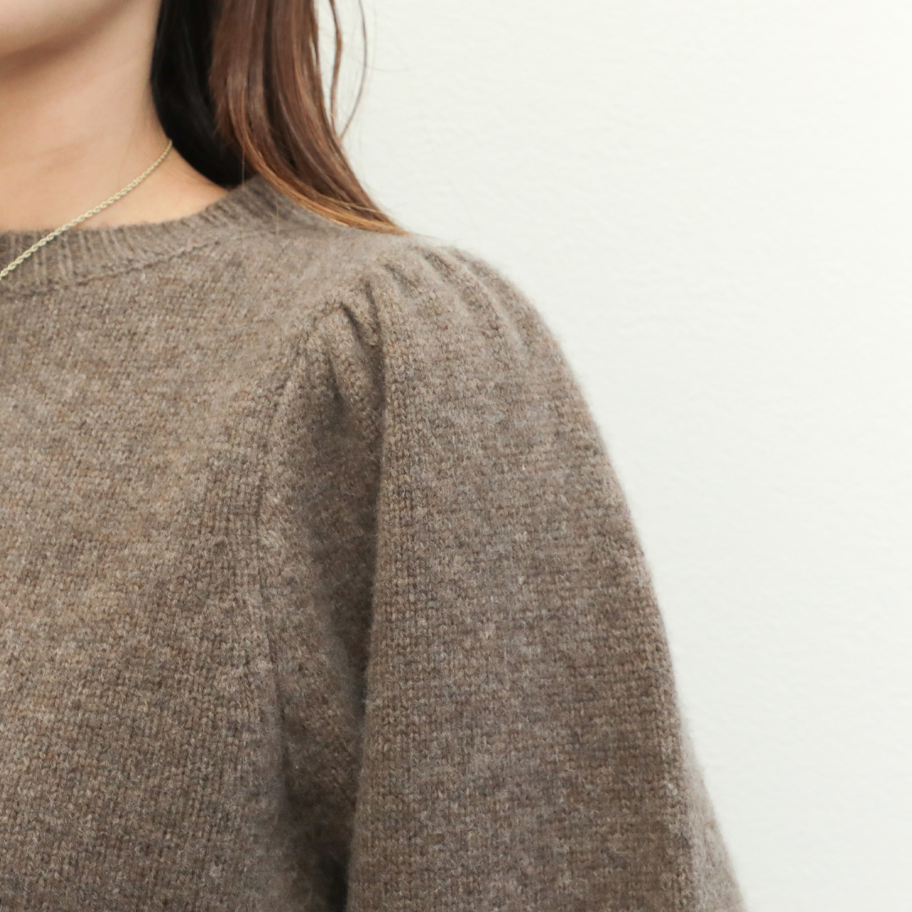 こちらは肩部分にギャザーを入れたパフスリーブデザインが大人の可愛らしさを引き出してくれるクルーネックニット。