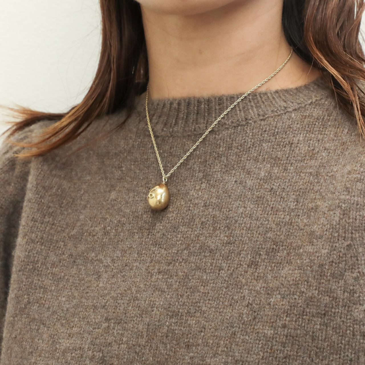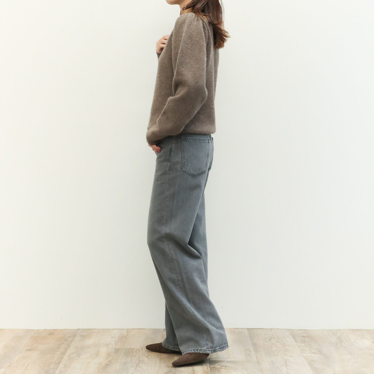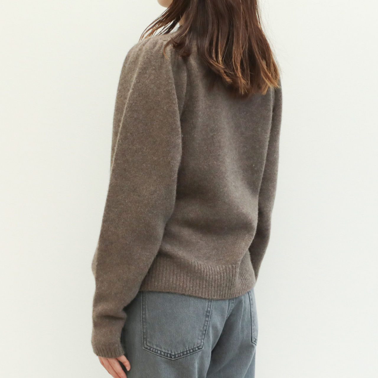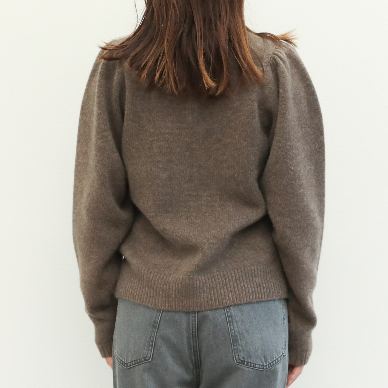 こちらは肩部分にギャザーを入れたパフスリーブデザインが大人の可愛らしさを引き出してくれるクルーネックニット。