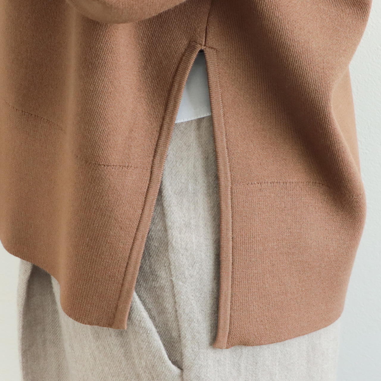 シルエットはドロップショルダー、ゆとりのある身幅でリラックスさが引き立っています。ショート丈のコンパクトな作りながら深めのスリットを入れており、レイヤードスタイルにも合わせやすいデザインです。