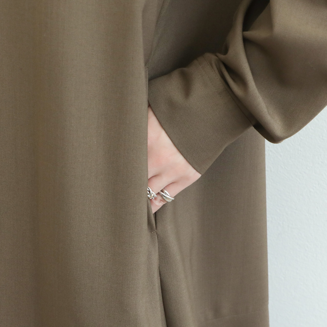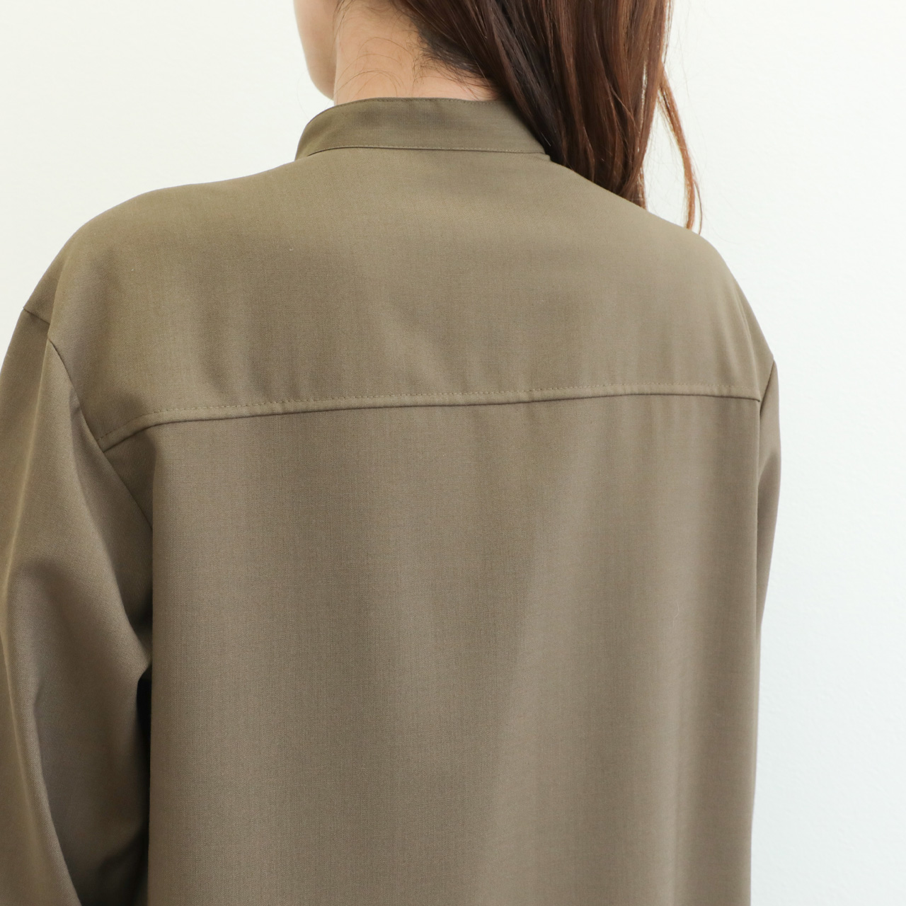 ドライタッチで程よい軽さのポリエステルウール生地は、強撚にすることでナチュラルなストレッチ性が生まれ、着心地の良さが魅力。
