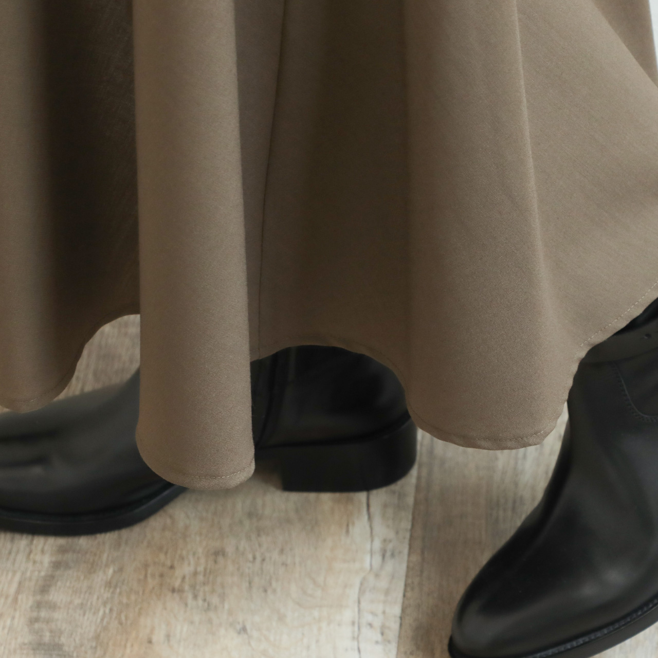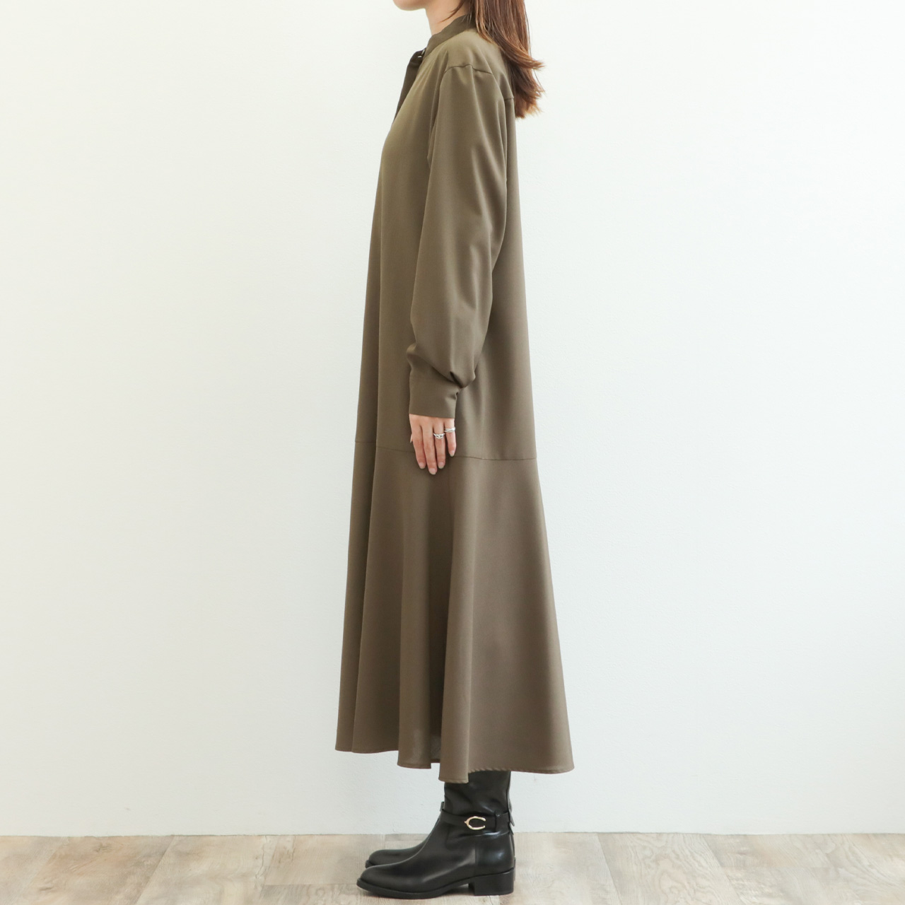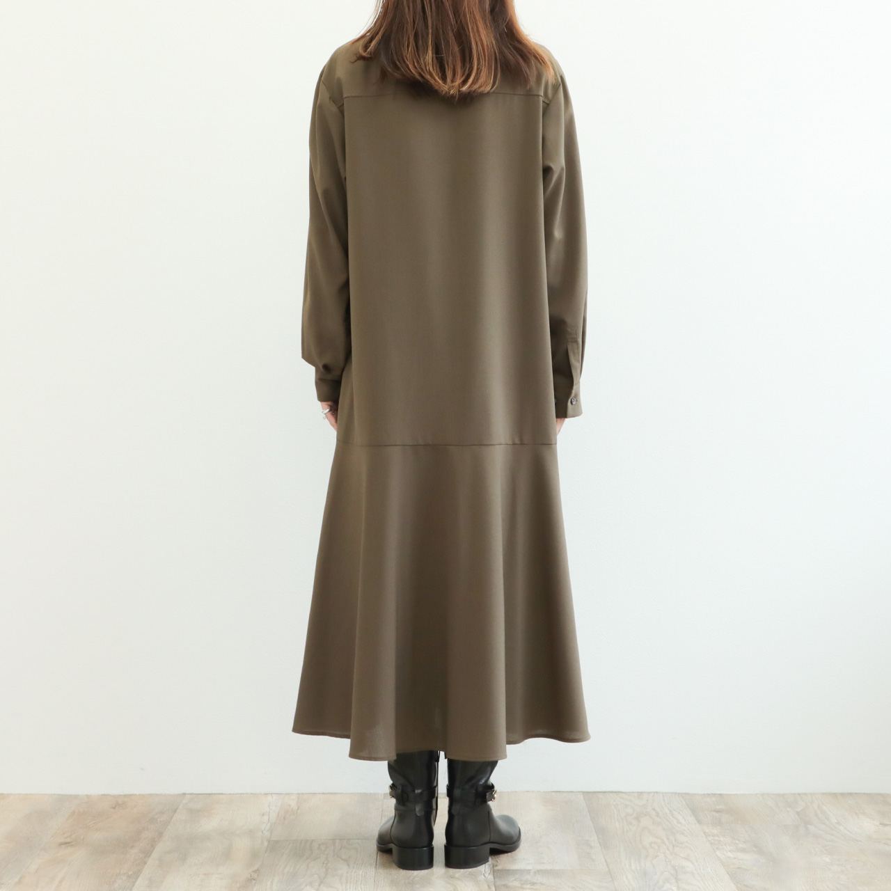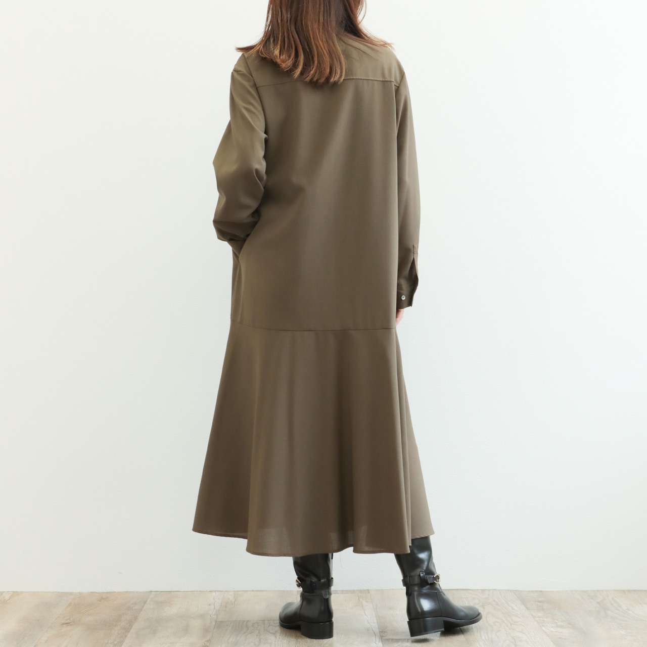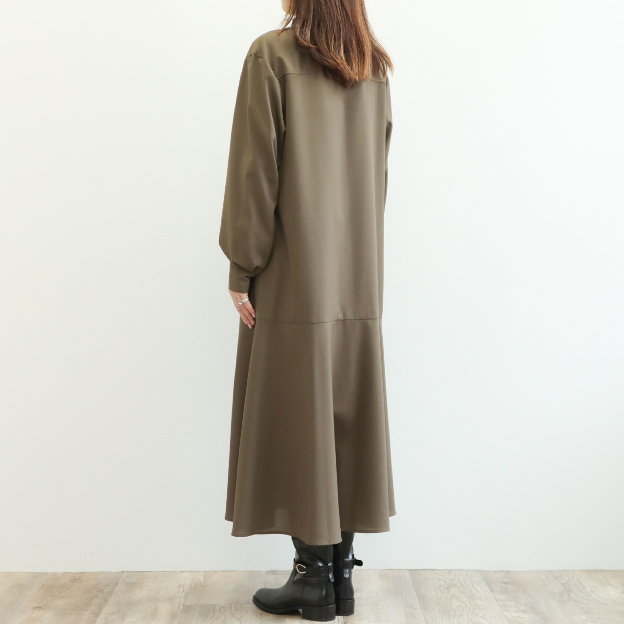 マニッシュな雰囲気の生地をフレアシルエットに落とし込み、バスト周りはスッキリとさせて、動きのあるヘムフレアのメリハリに拘った一枚です。