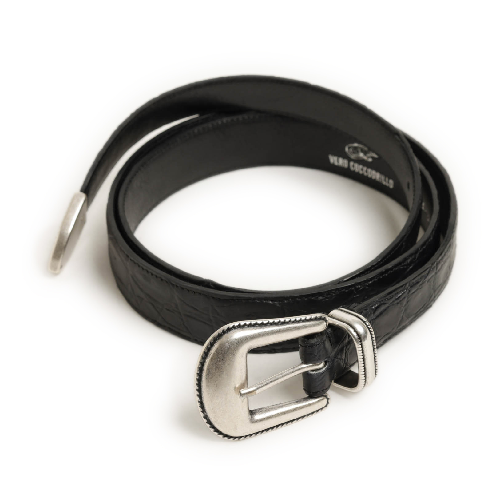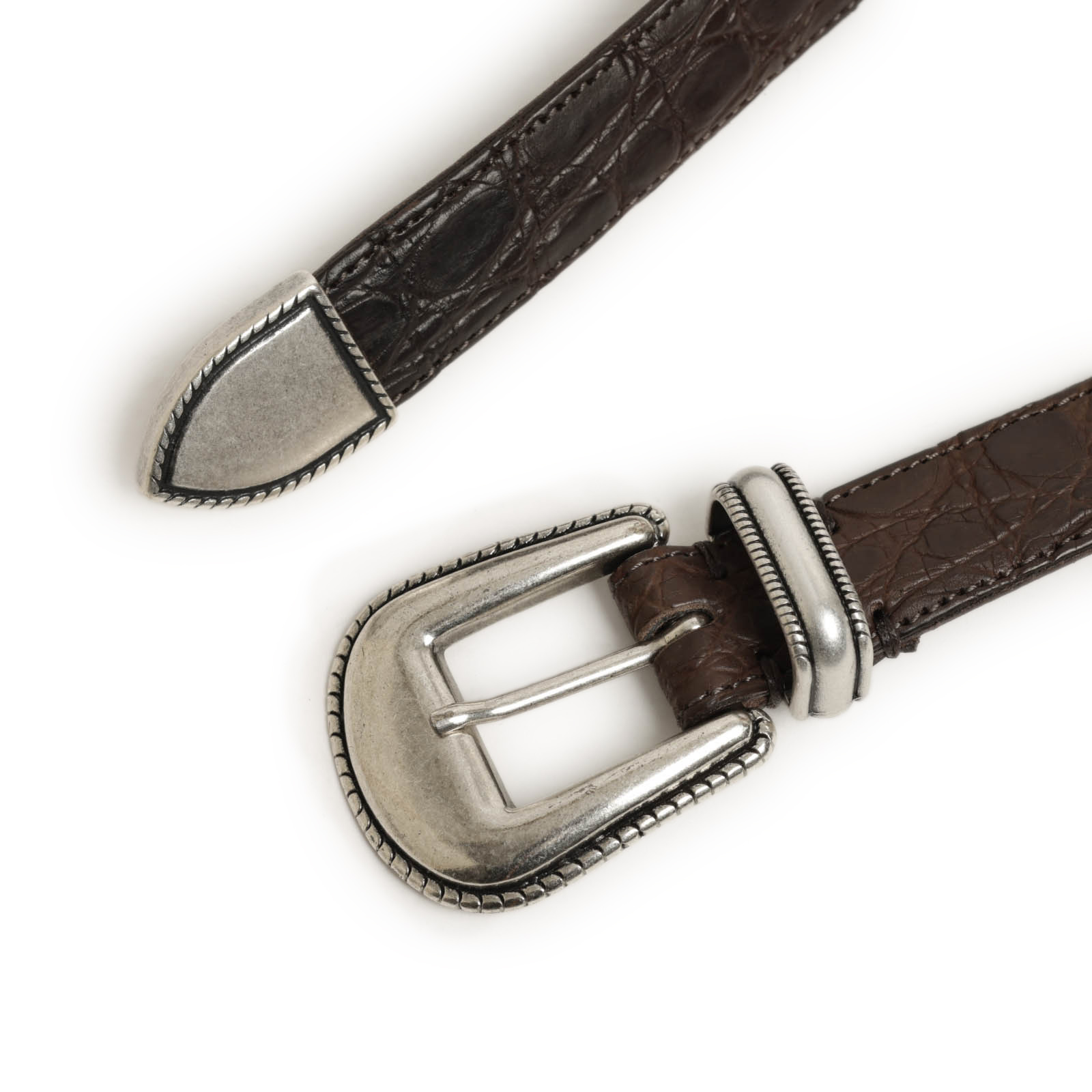 ブラック、ブラウンのクロコダイルレザーに対して同社のオリジナリティあふれるウエスタン調のバックル、遊革、プンターレを合わせたデザイン。