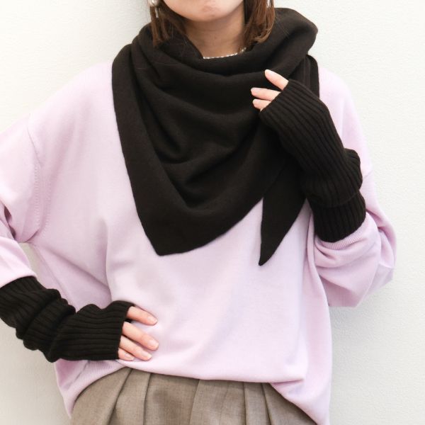 こちらはカシミヤ100%使用のストール。トライアングル型のユニークな形状で、スカーフ・ストールどちらの要素も泡得持った万能な巻物が欲しいという思いから生まれたモデル。