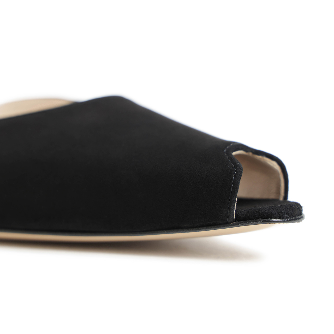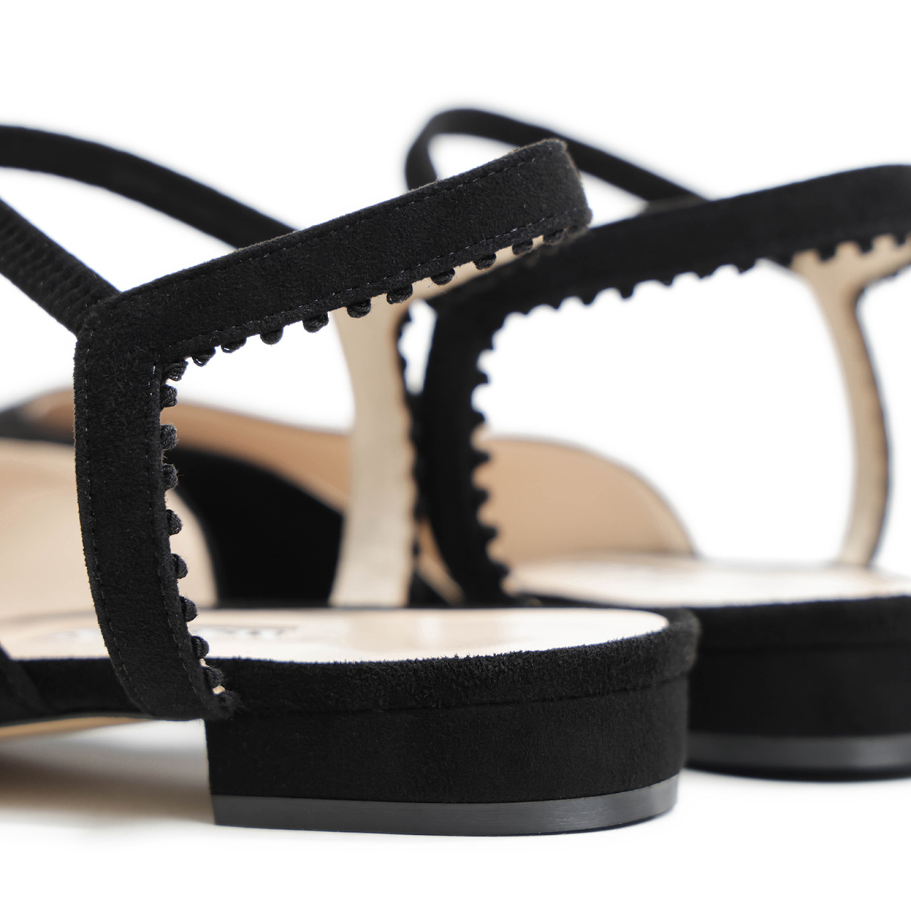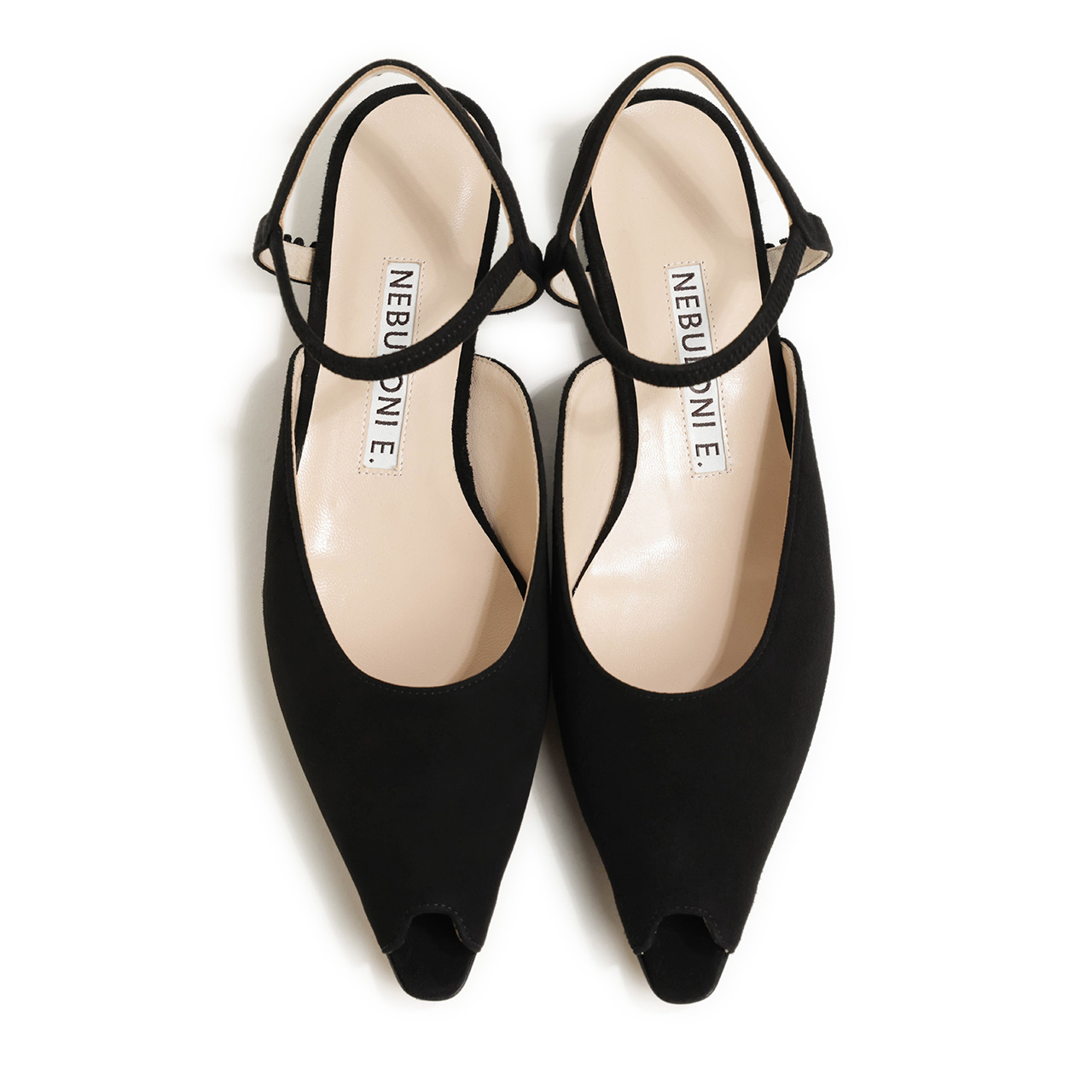カバーの多いフロント部分のストラップと、華奢なアンクルストラップのバランスが絶妙なデザイン。トゥの部分はカットワークデザインを施し、軽やかで抜け感のある表情に。