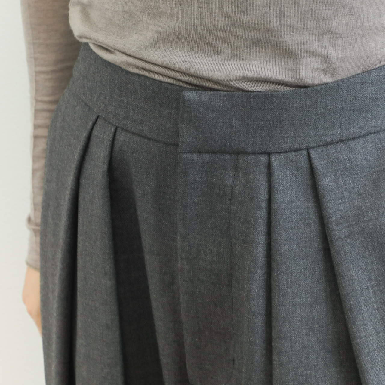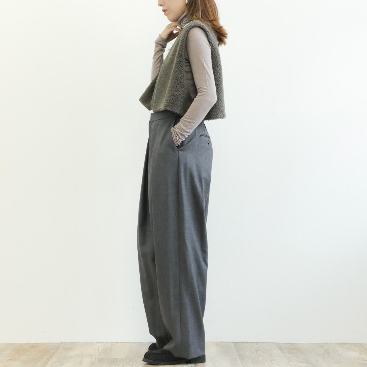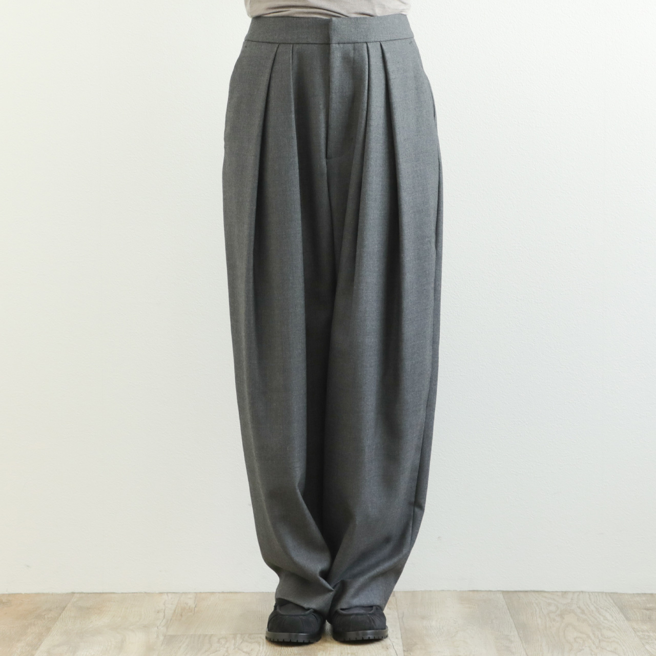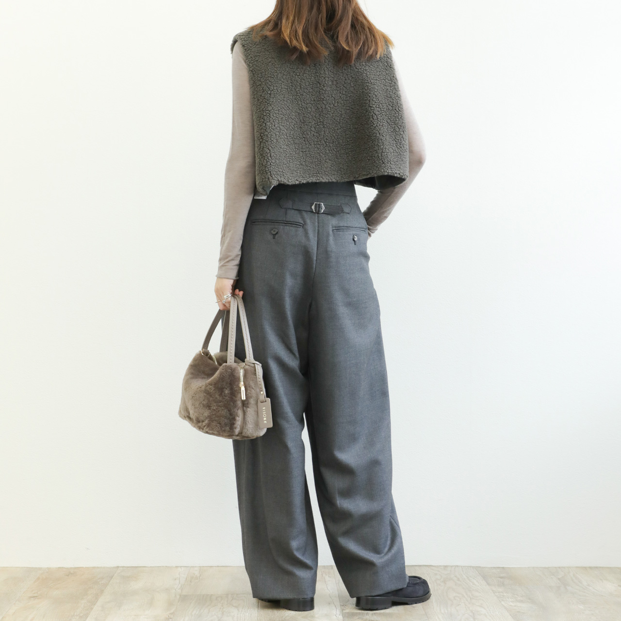 深くたたんだフロントタックからなるワイドシルエットと、裾にかけてテーパードさせたラインがマニッシュな雰囲気を醸し出します。バックスタイルの尾錠付きベルテッドディテールもポイント。