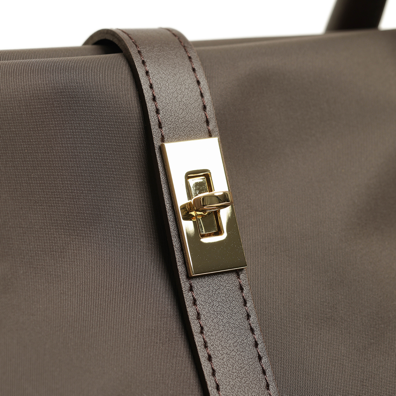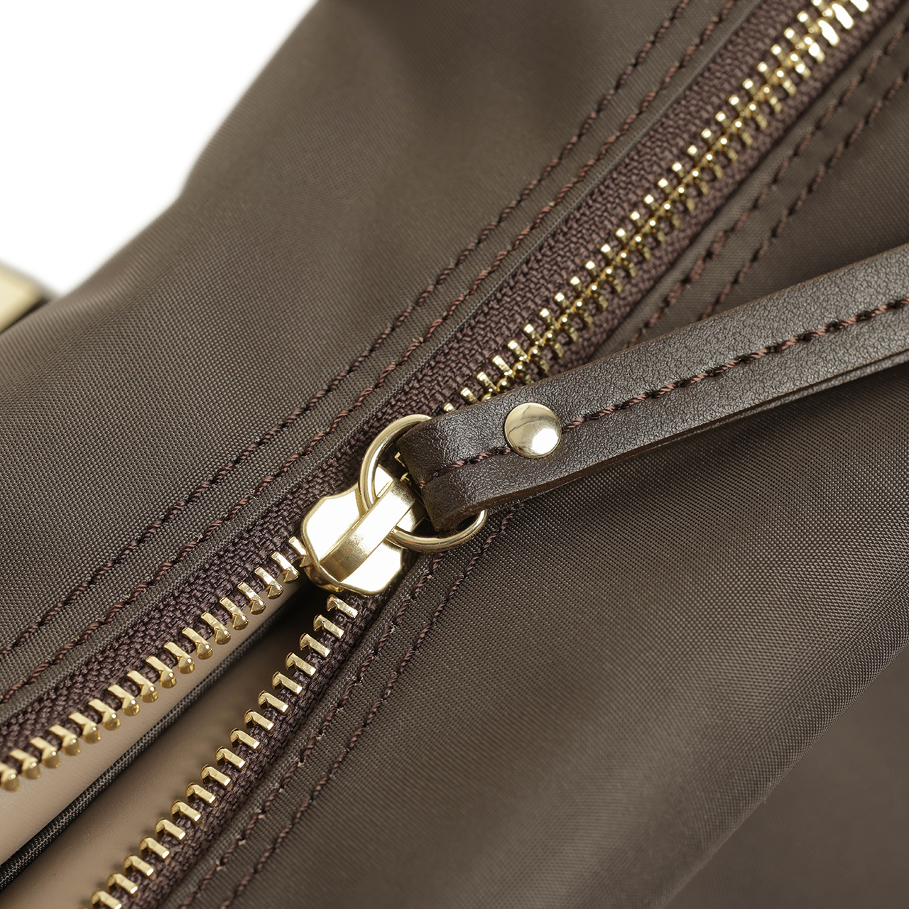 ハンドル、ベルト、ファスナーの引手にはおなじみのイタリアンレザーを使用。しっとりとした感触ときめ細かな革が特徴的です。