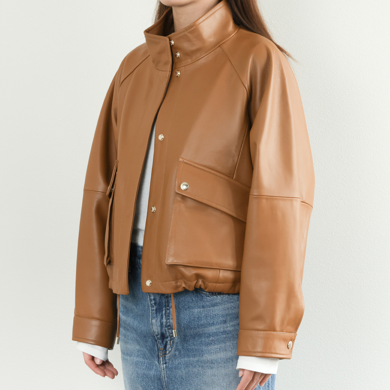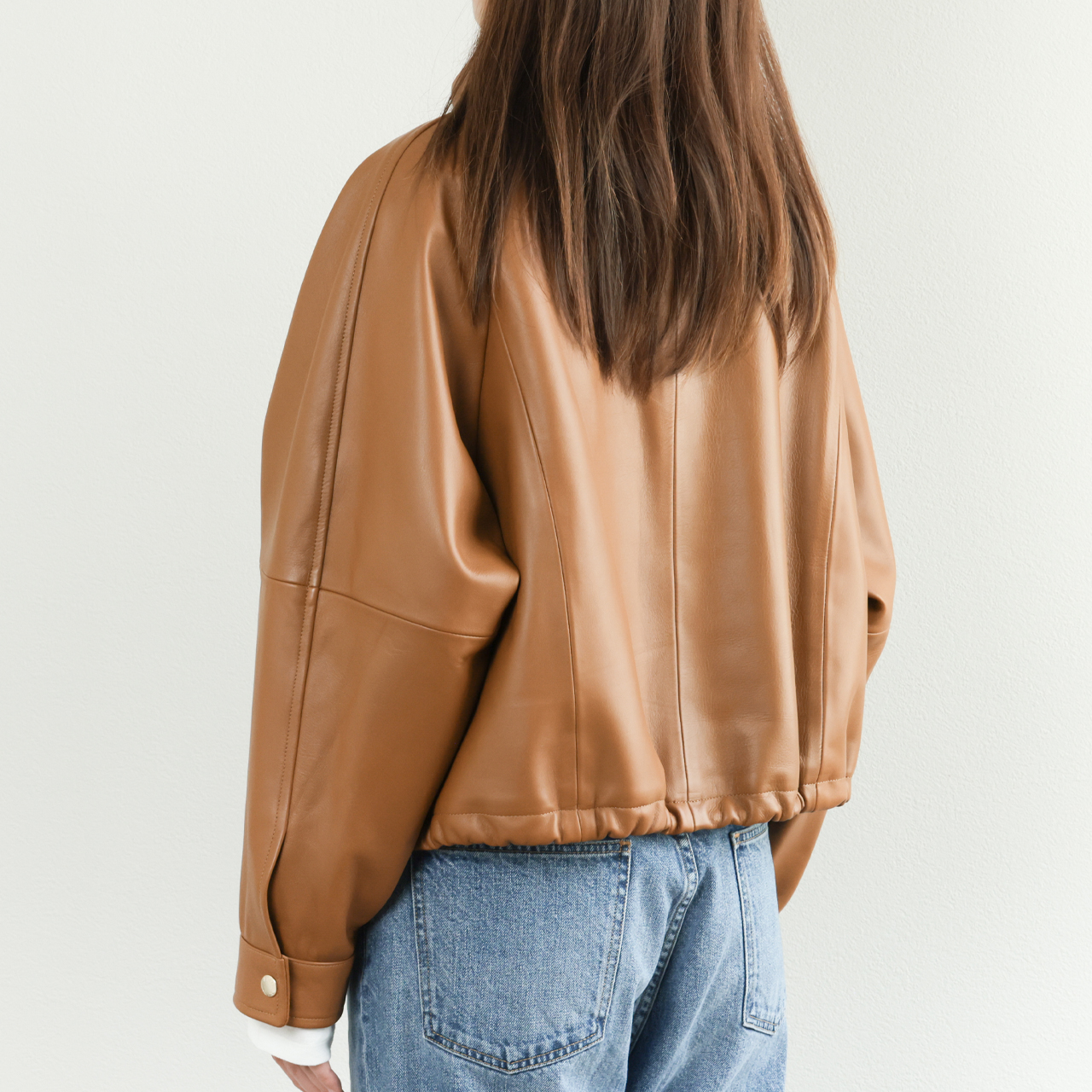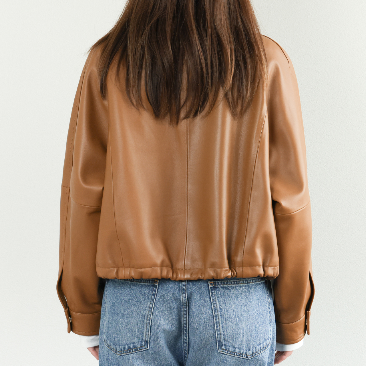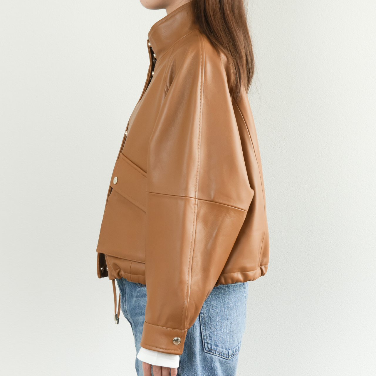 オリジナルのフライトジャケットは襟、袖、裾をリブで切り替えますが、本モデルはスタンドカラー、スナップボタンのカフス、裾はレザーのドローコードを通す仕様に。オールレザーで表現することで非常に上品な一着となっております。
