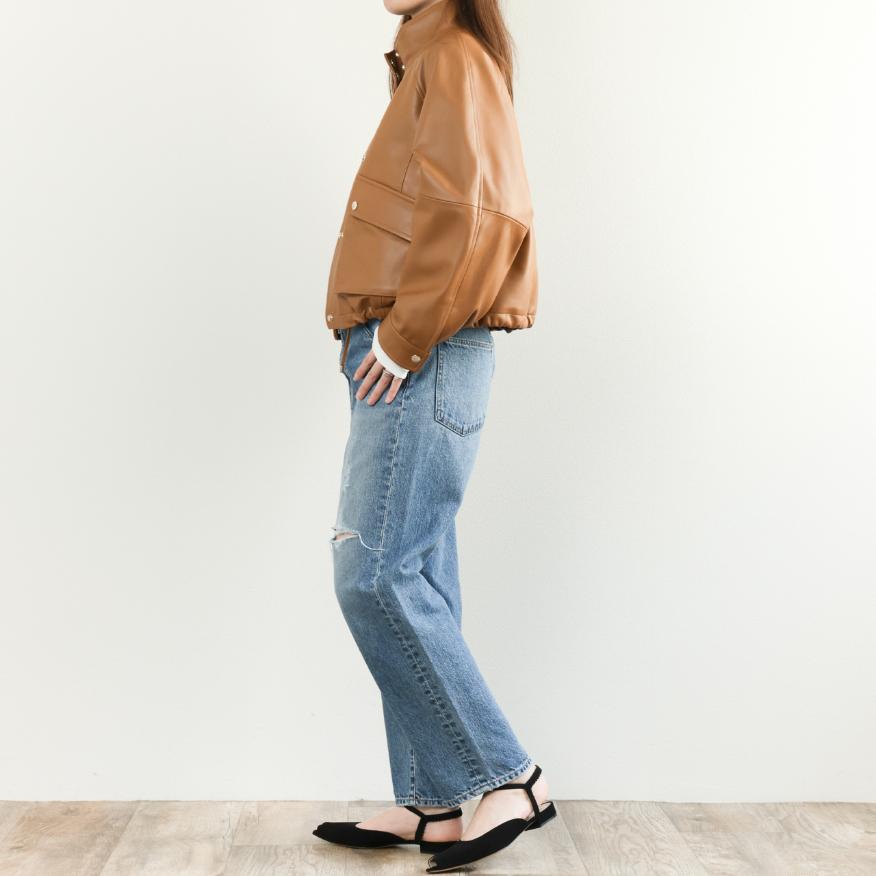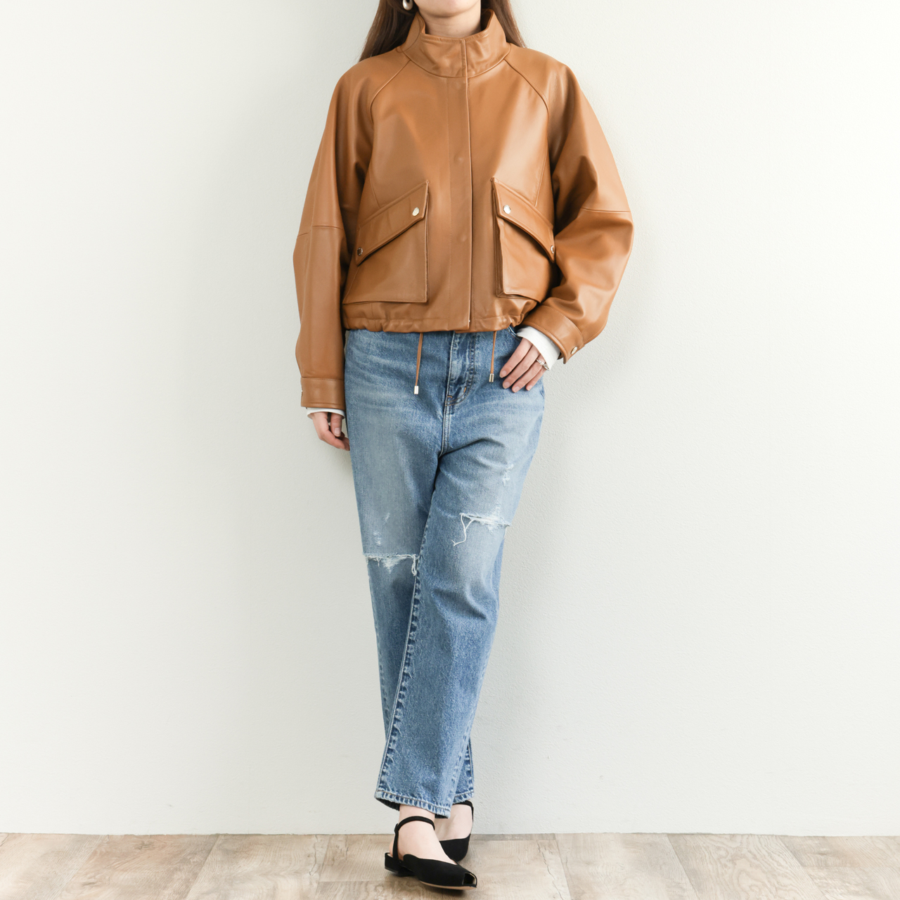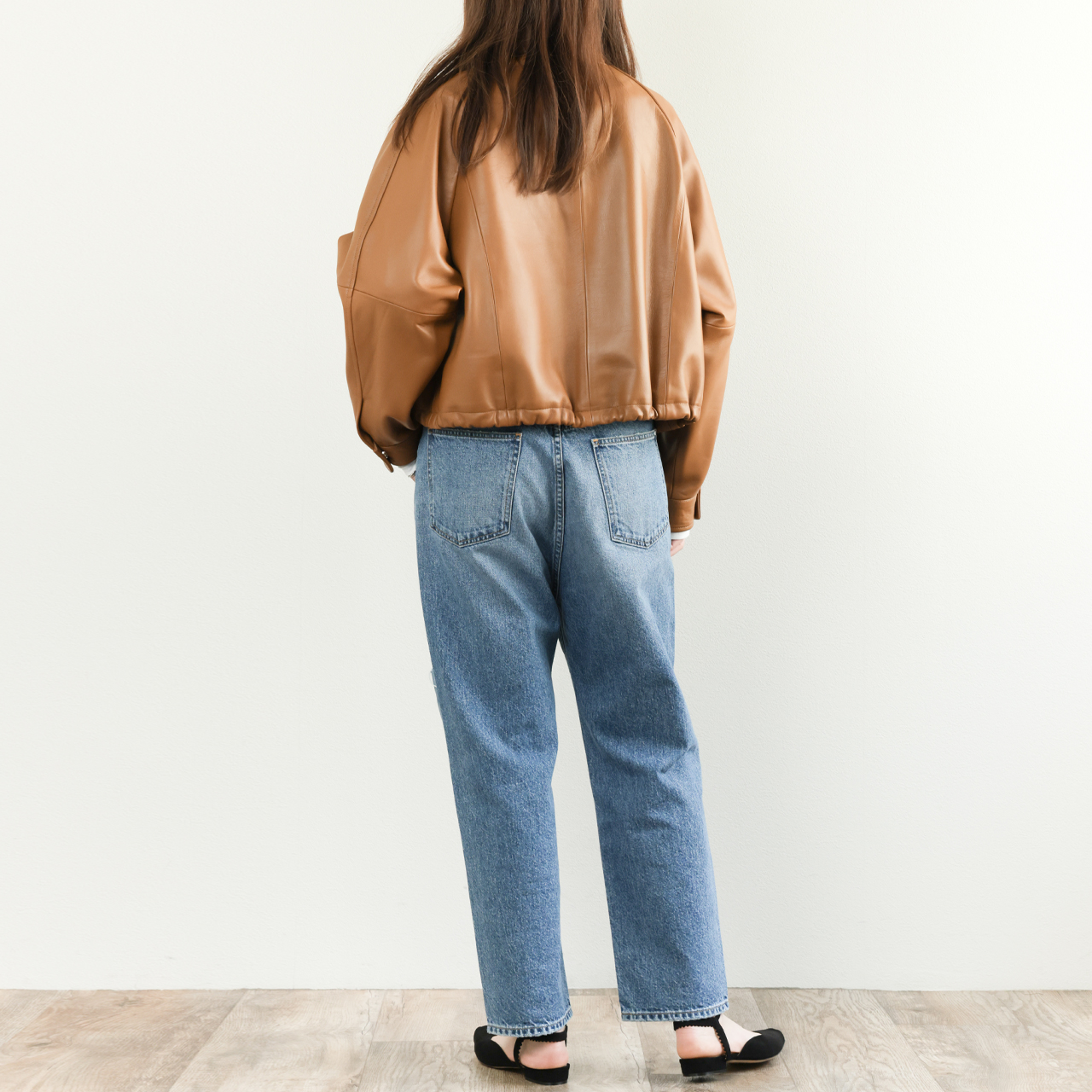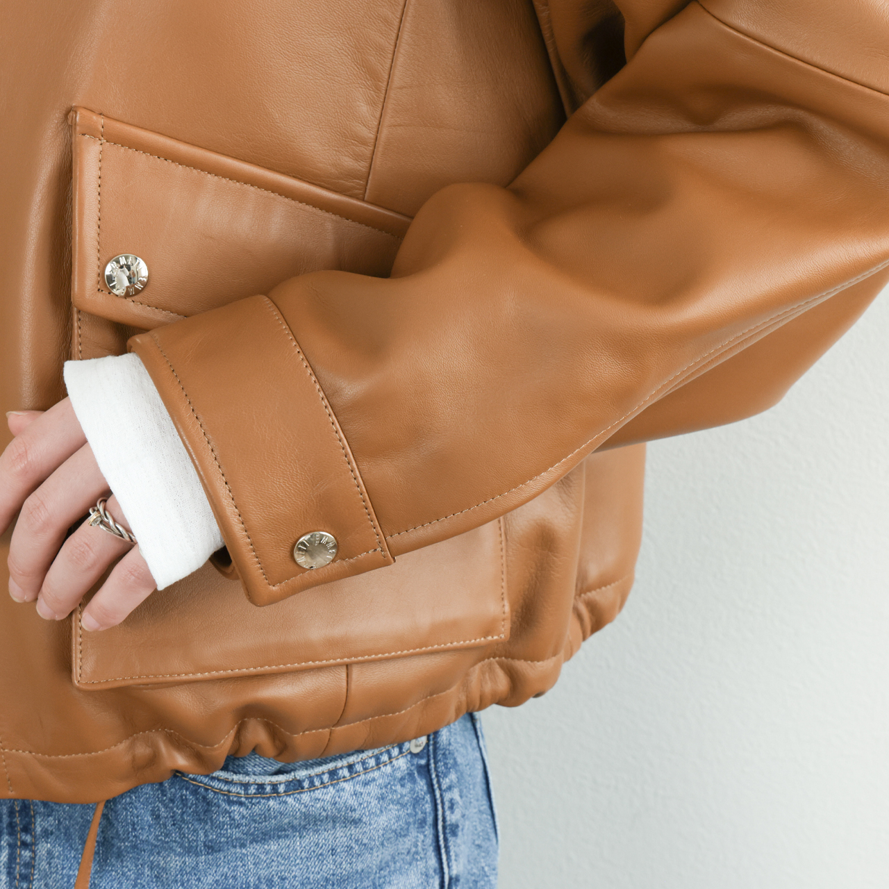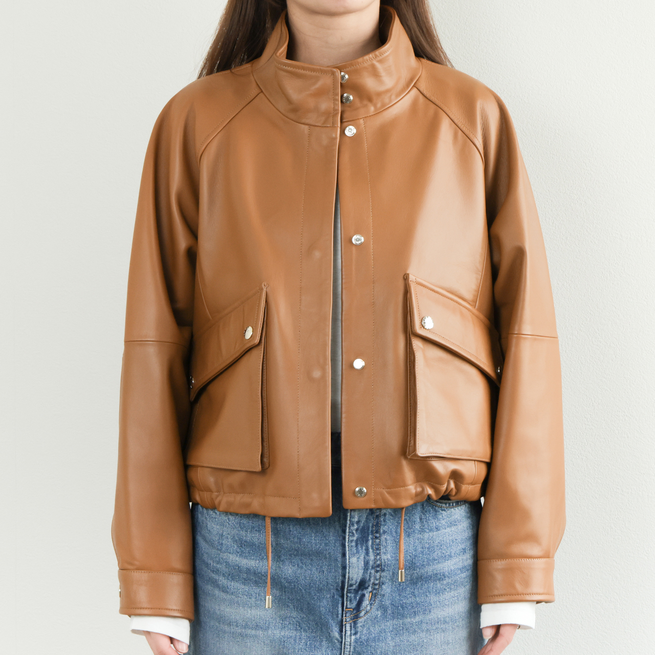 オリジナルのフライトジャケットは襟、袖、裾をリブで切り替えますが、本モデルはスタンドカラー、スナップボタンのカフス、裾はレザーのドローコードを通す仕様に。オールレザーで表現することで非常に上品な一着となっております。