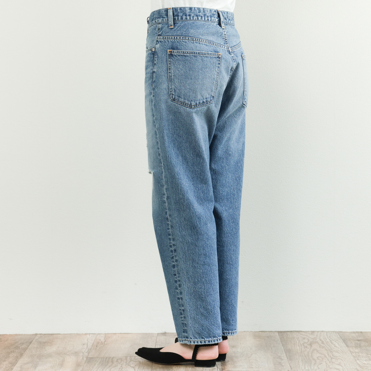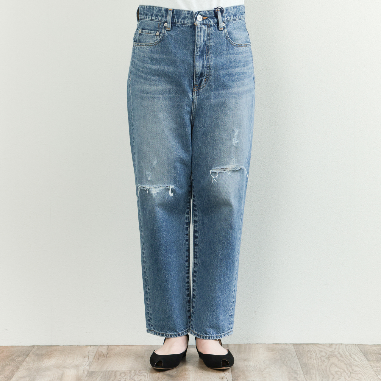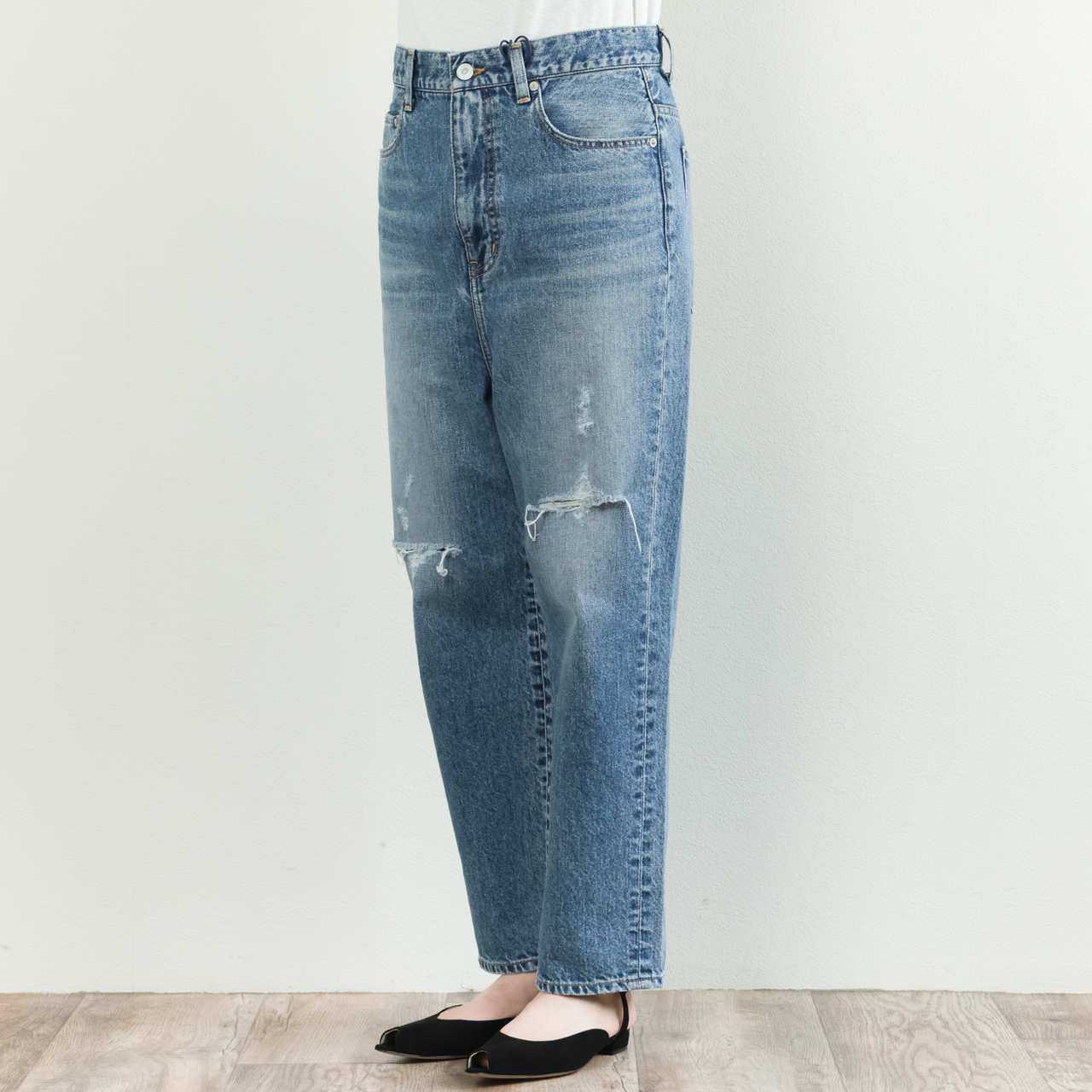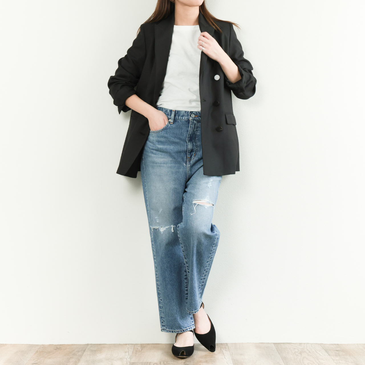 カラーはダメージ加工を施したブルーでご用意しました。ダメージの加工具合も大人の女性が合わせても違和感のない絶妙さで、坪田氏の流石のセンスを感じられます。