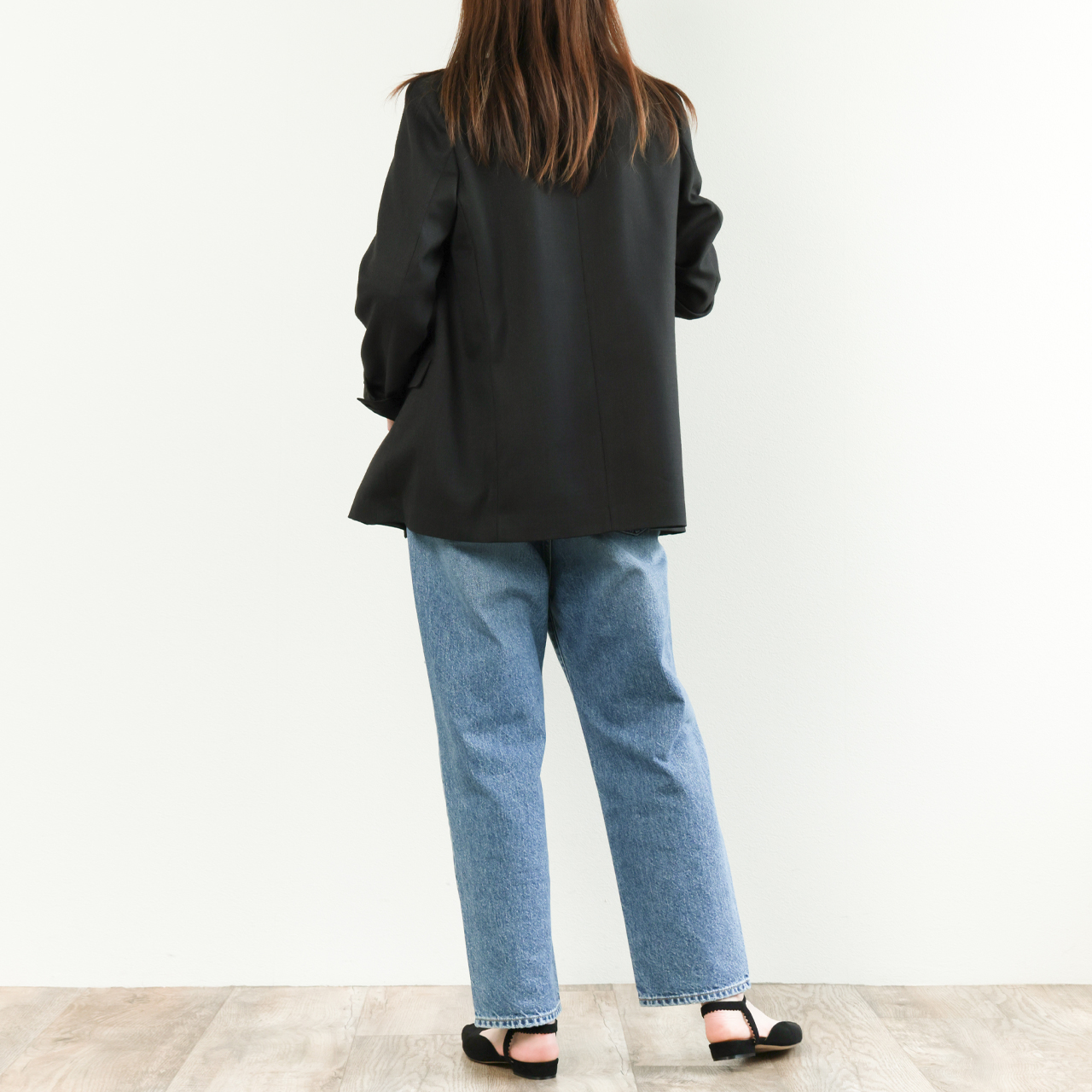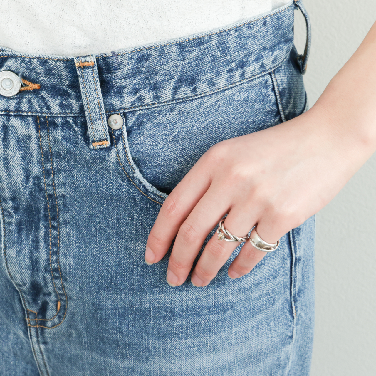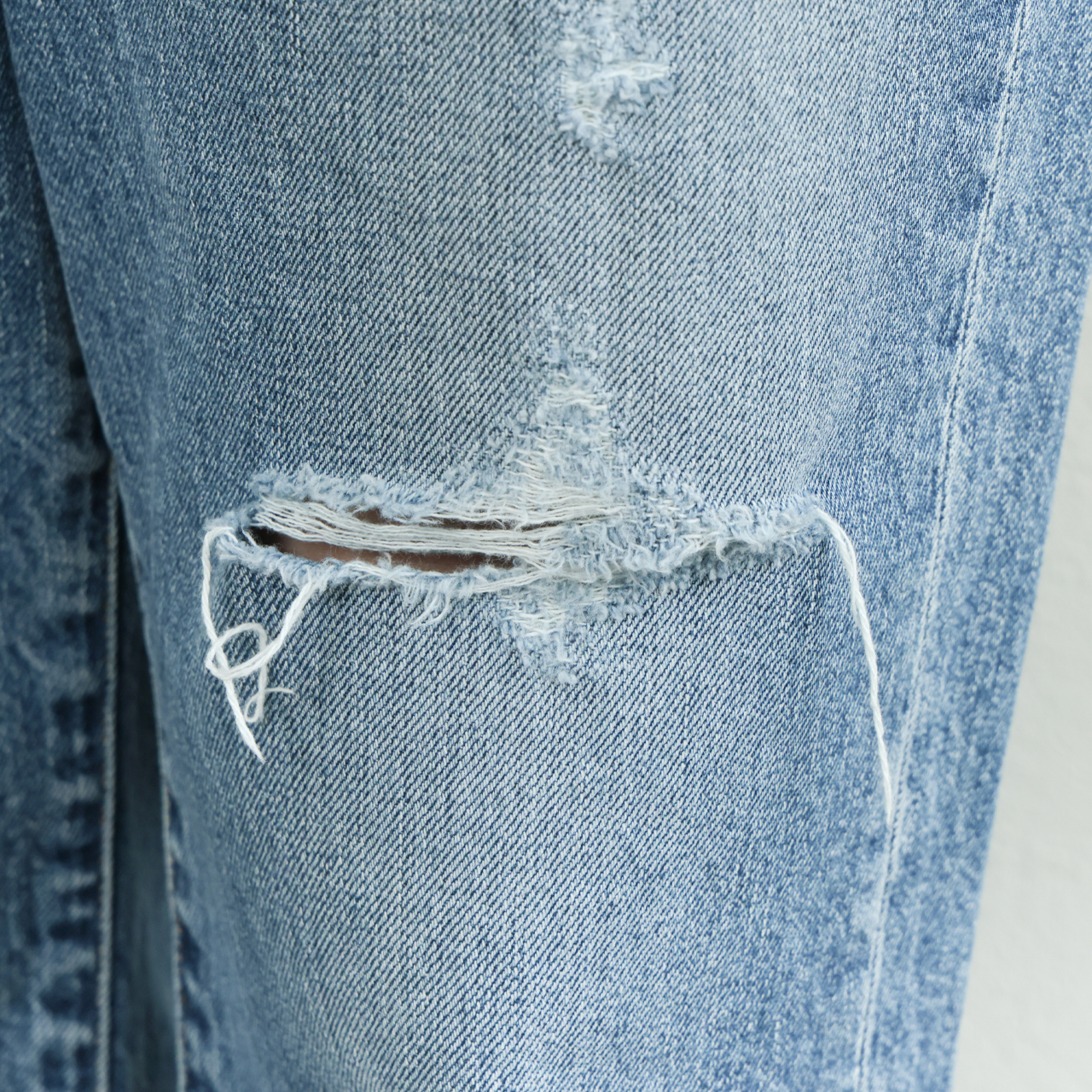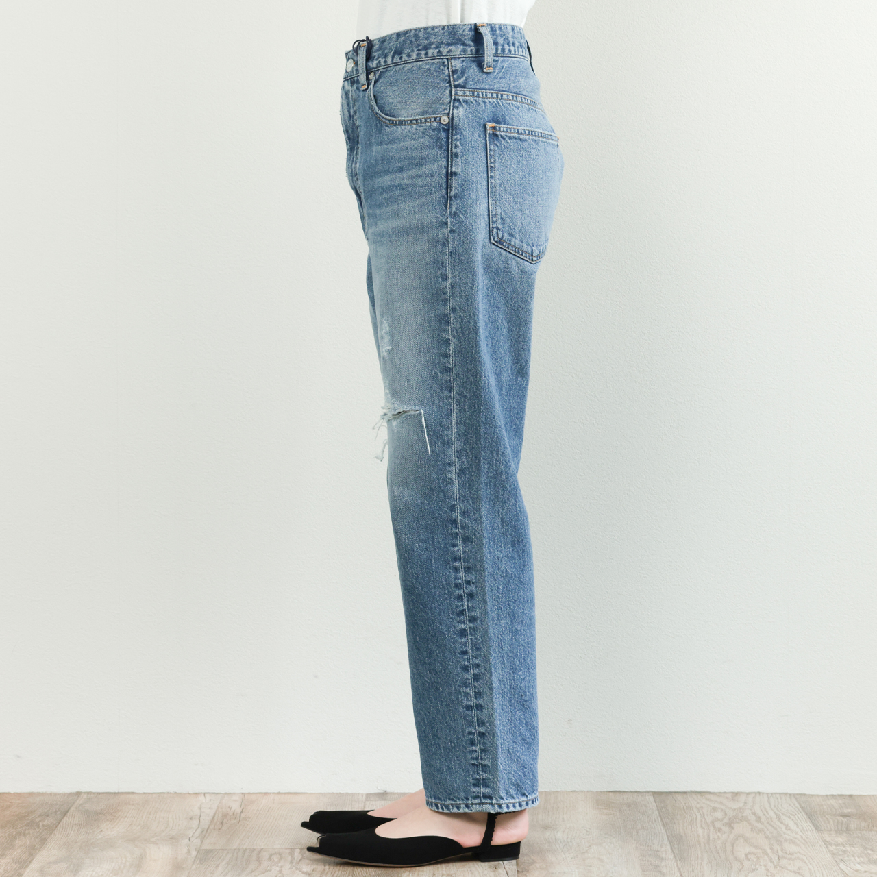 カラーはダメージ加工を施したブルーでご用意しました。ダメージの加工具合も大人の女性が合わせても違和感のない絶妙さで、坪田氏の流石のセンスを感じられます。