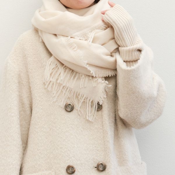 90×210の大判サイズですので、肩からショールの様にかけてもいいですし、クシュクシュとまとめて巻き、首元にボリュームを出すのもオススメ。