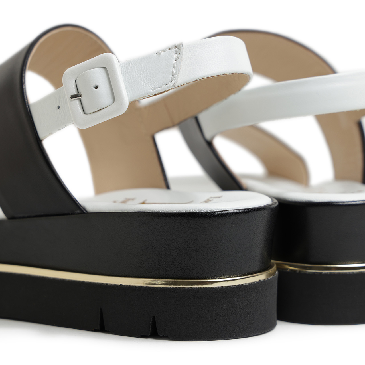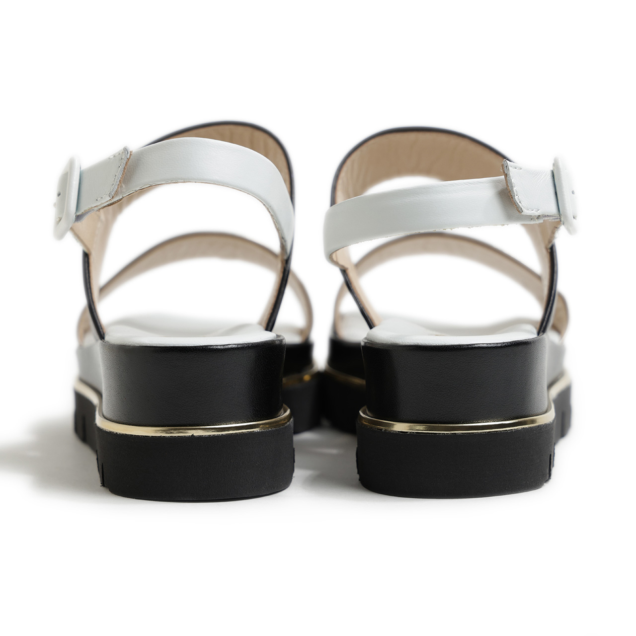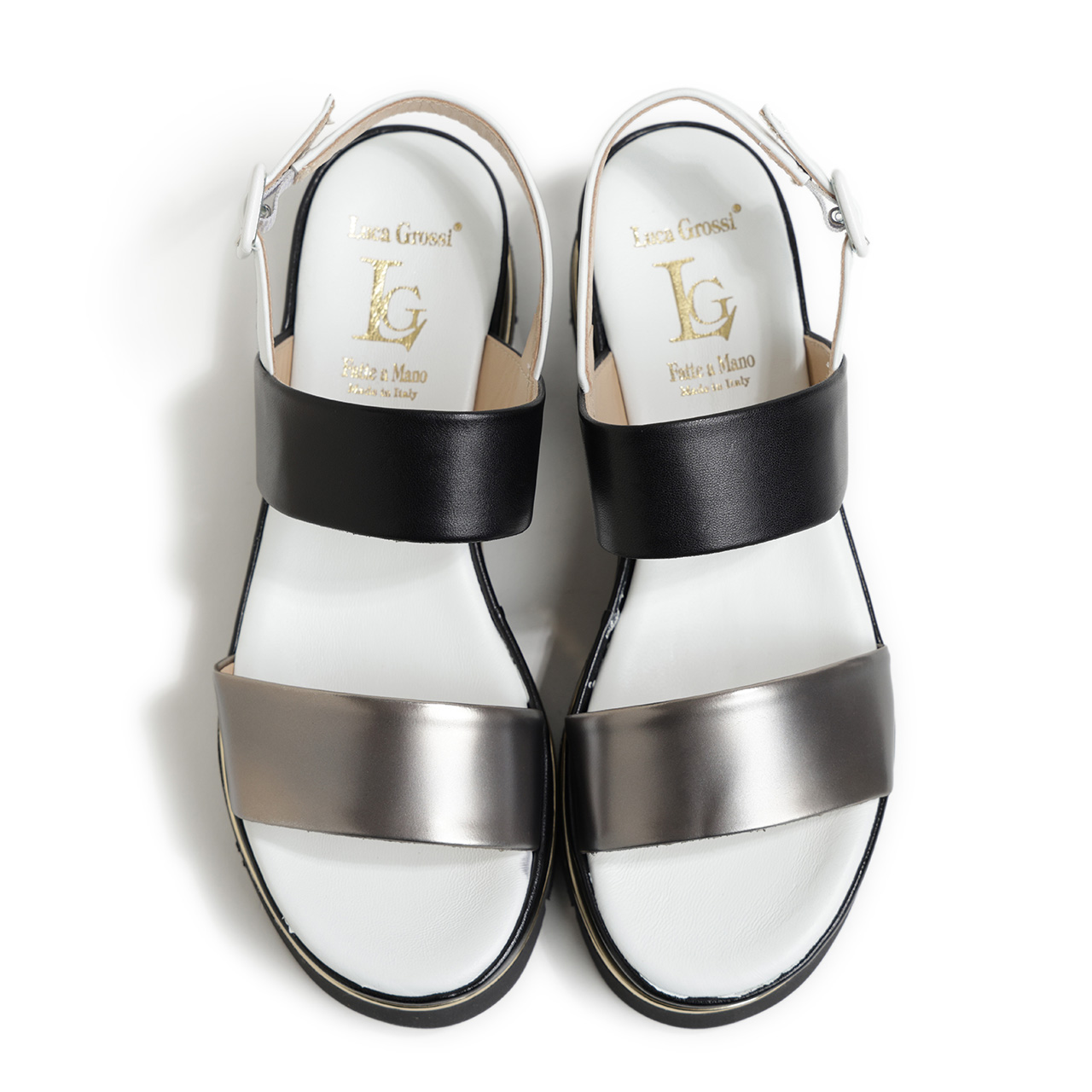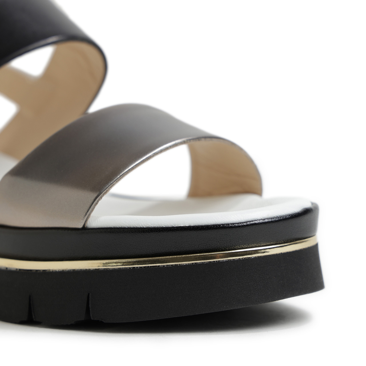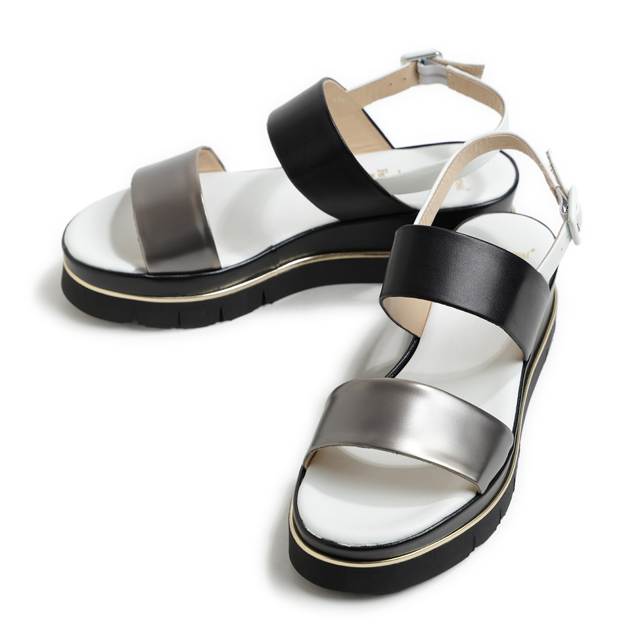 前足部のレザーはシルバーカラーのメタリックレザーを使用し、甲の部分はブラック、ヒールストラップ、フットベッドはホワイトとカラーを切り替え。コントラストの効いたカラーで切り替えることで、足元に絶妙なアクセントを加えてくれます。