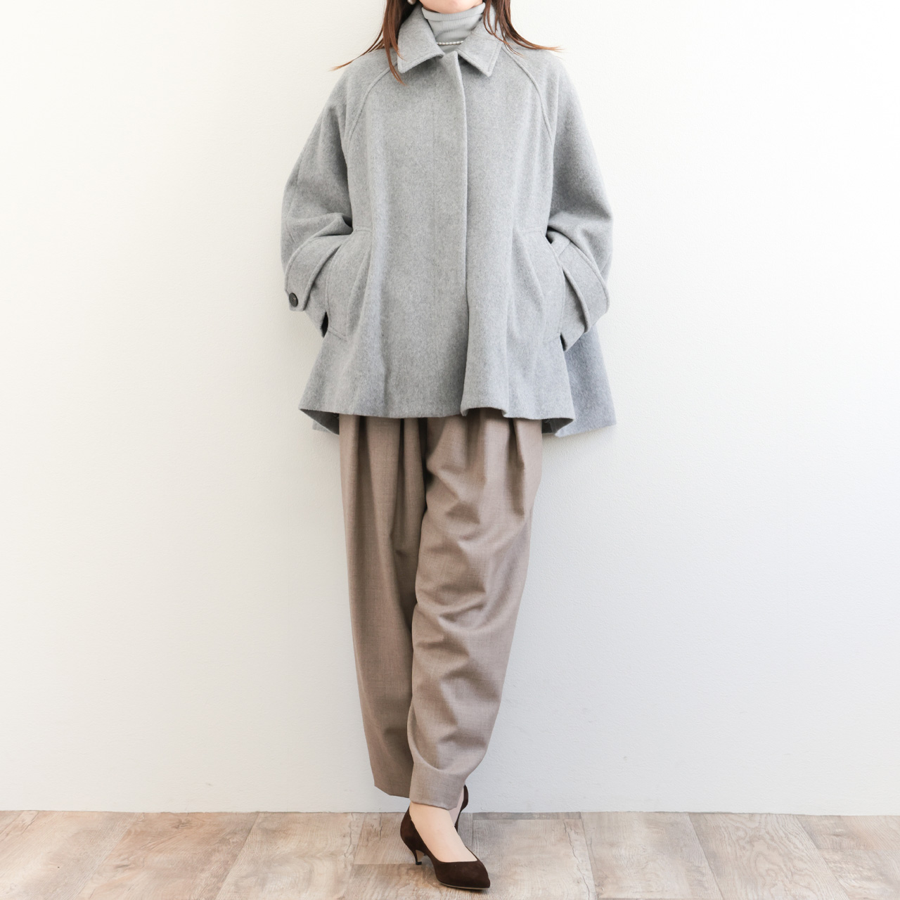 ミドル丈で全体のバランスがとりやすく、フレアシルエットでパンツやスカートとの相性も抜群。