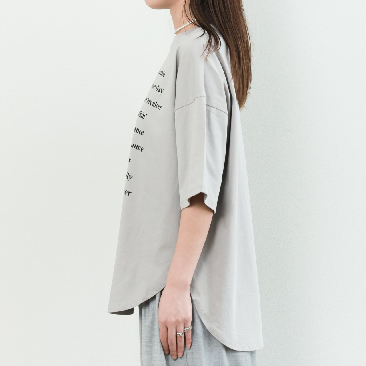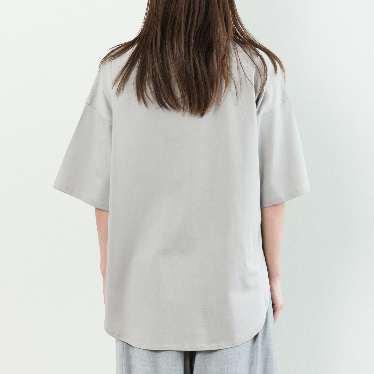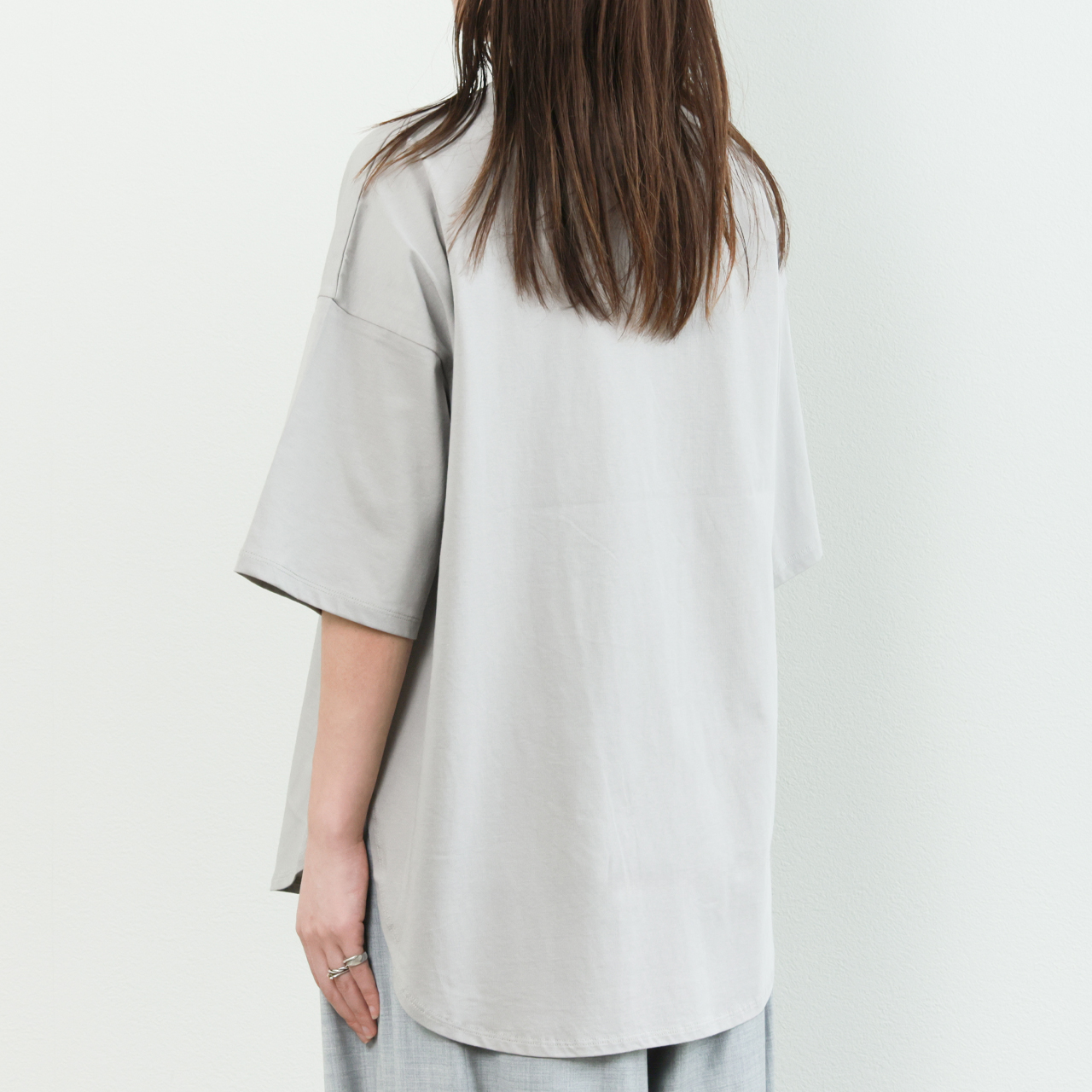 春夏の素肌にも心地よく、品のあるカジュアルスタイルを叶えます。ゆとりのあるオーバーサイズと、丸首・ラウンドヘムの柔らかなシルエットが、抜け感を演出しながらも女性らしさをキープ。