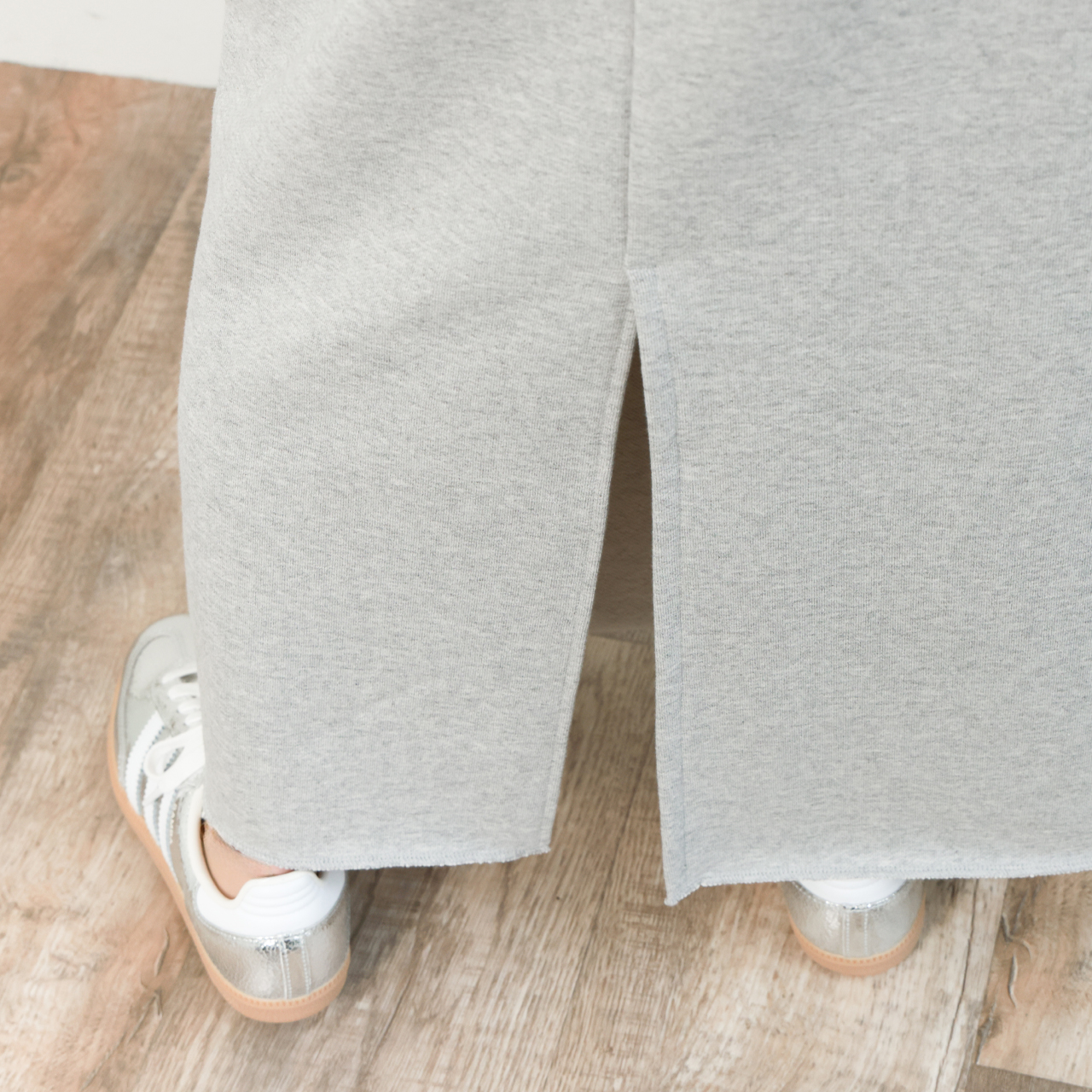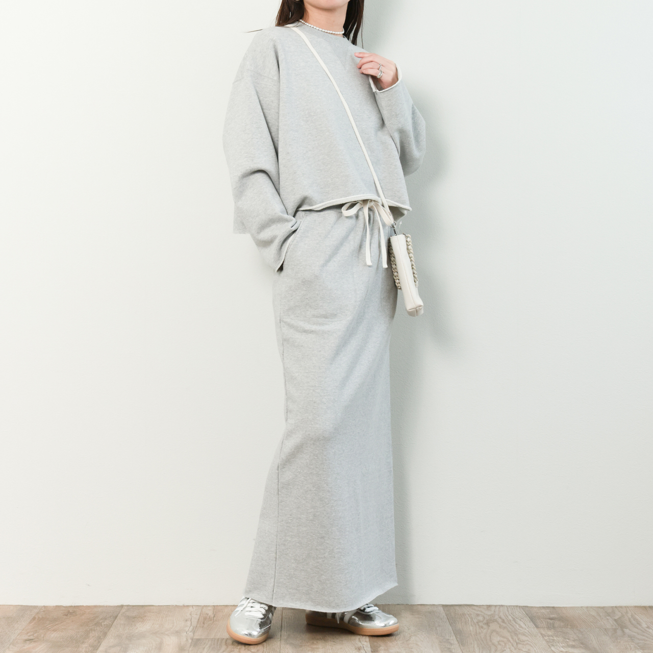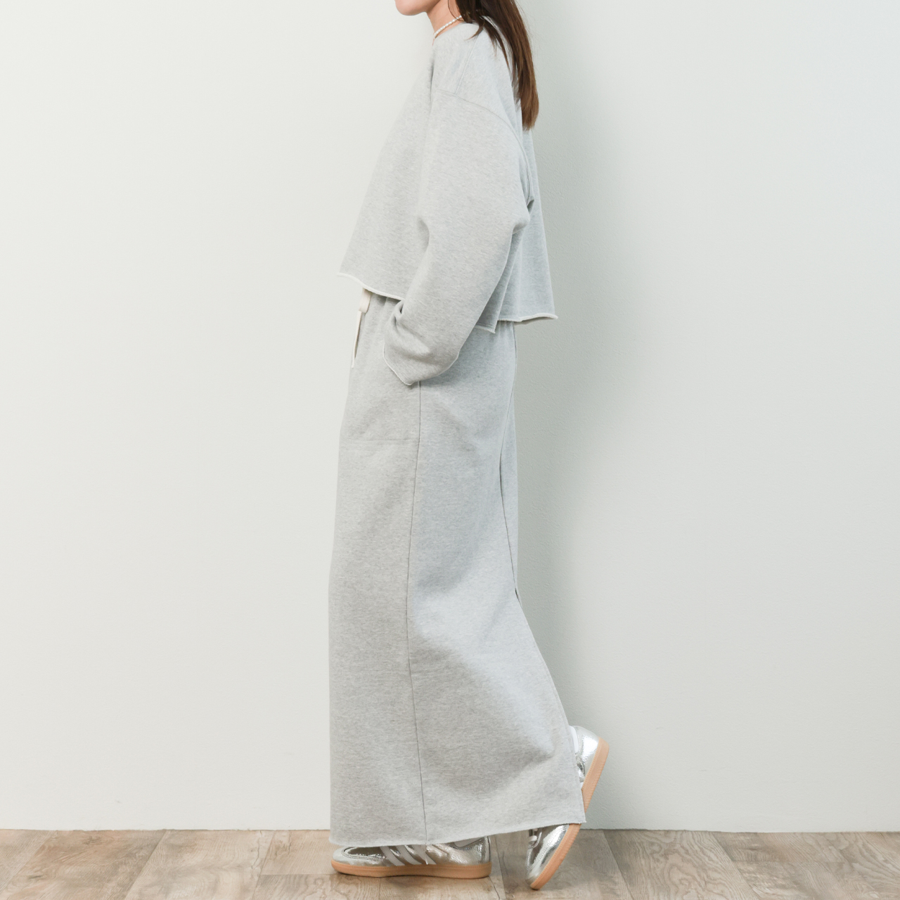 希少な編み機で編み上げられた国産裏毛素材を使用したスウェット素材のスカートはナローシルエットでありながらも、ふんわりと柔らかな生地感と、高い伸縮性からくる穿き心地の良さが魅力的。