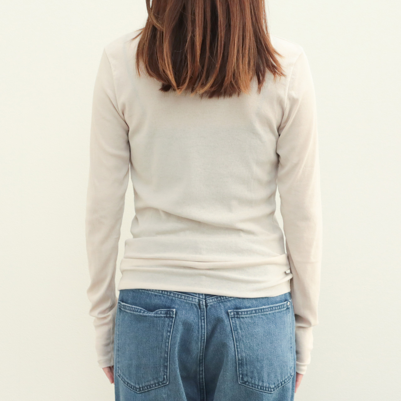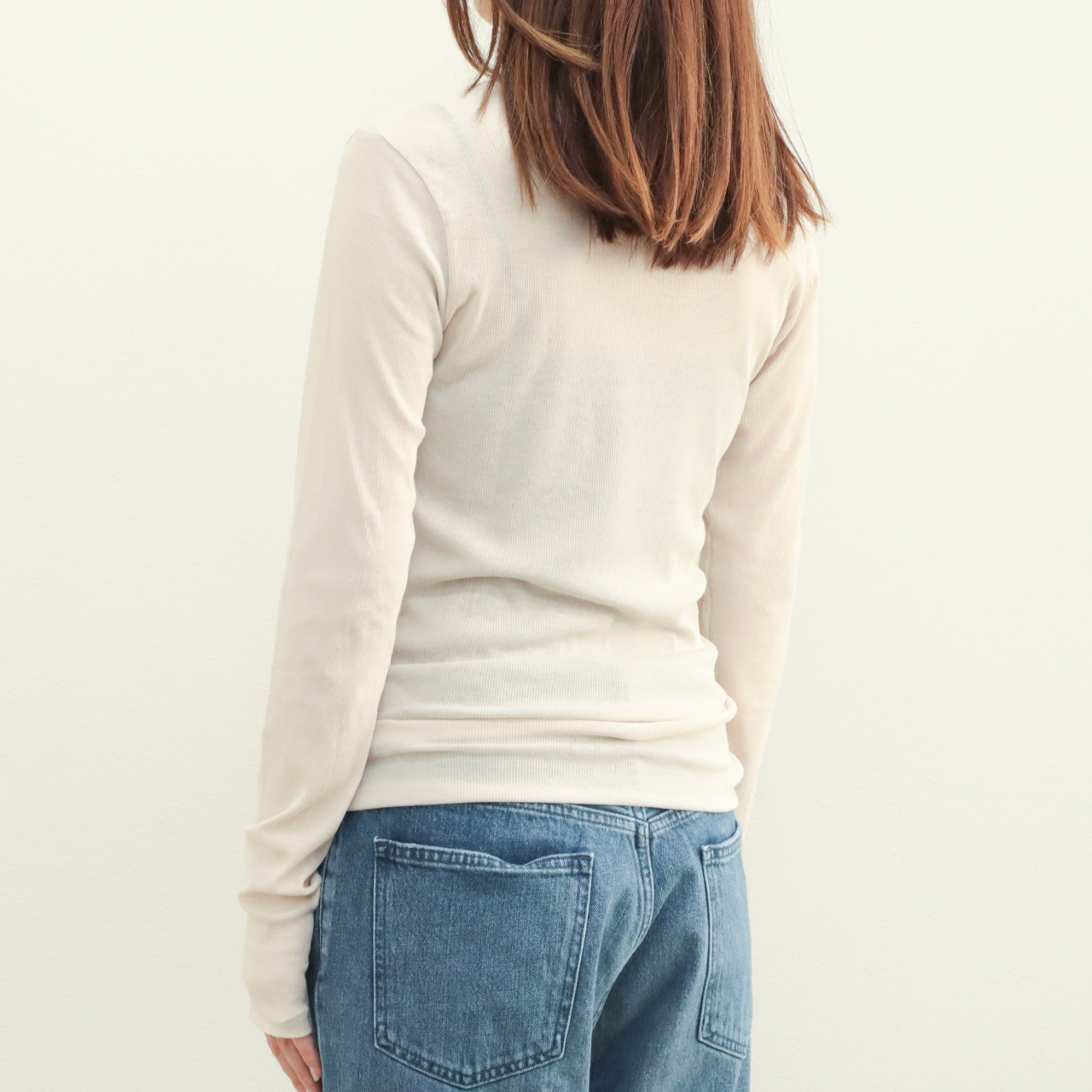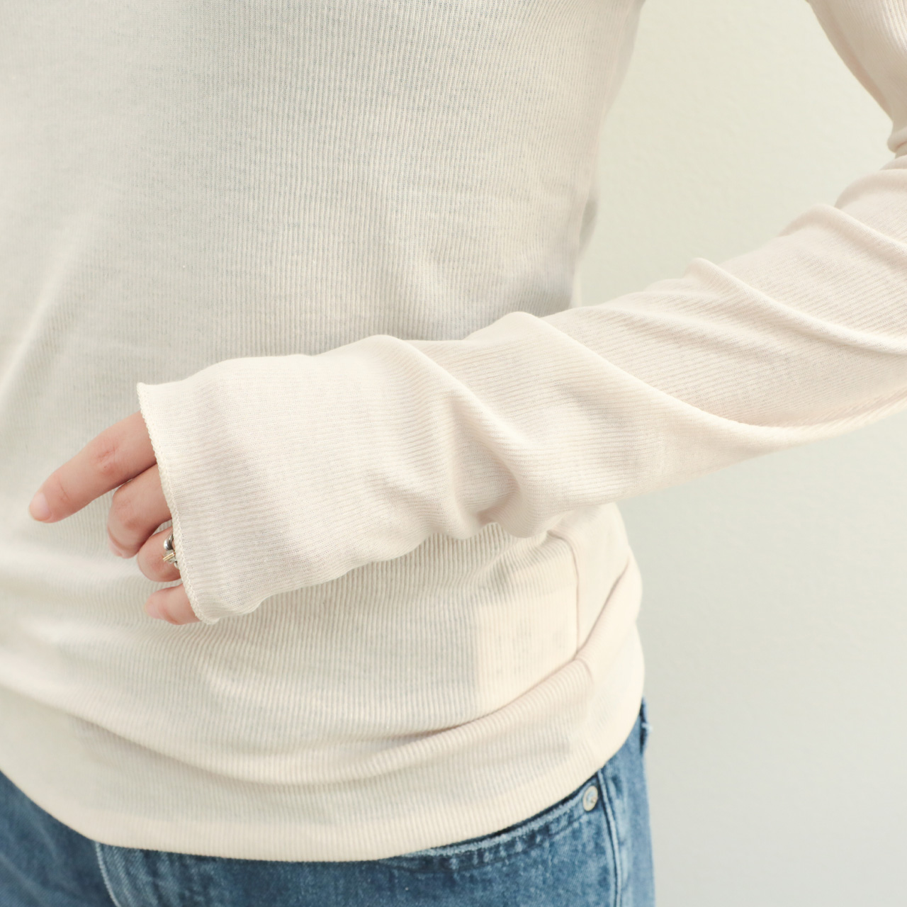 薄手の生地感ですので、着ぶくれ感を気にせず着用いただけます。一枚での着用はもちろん、テーラード、レザージャケットのインナーにもOK。時期によってはダウンベストのインの一枚ととしてもオススメ。
