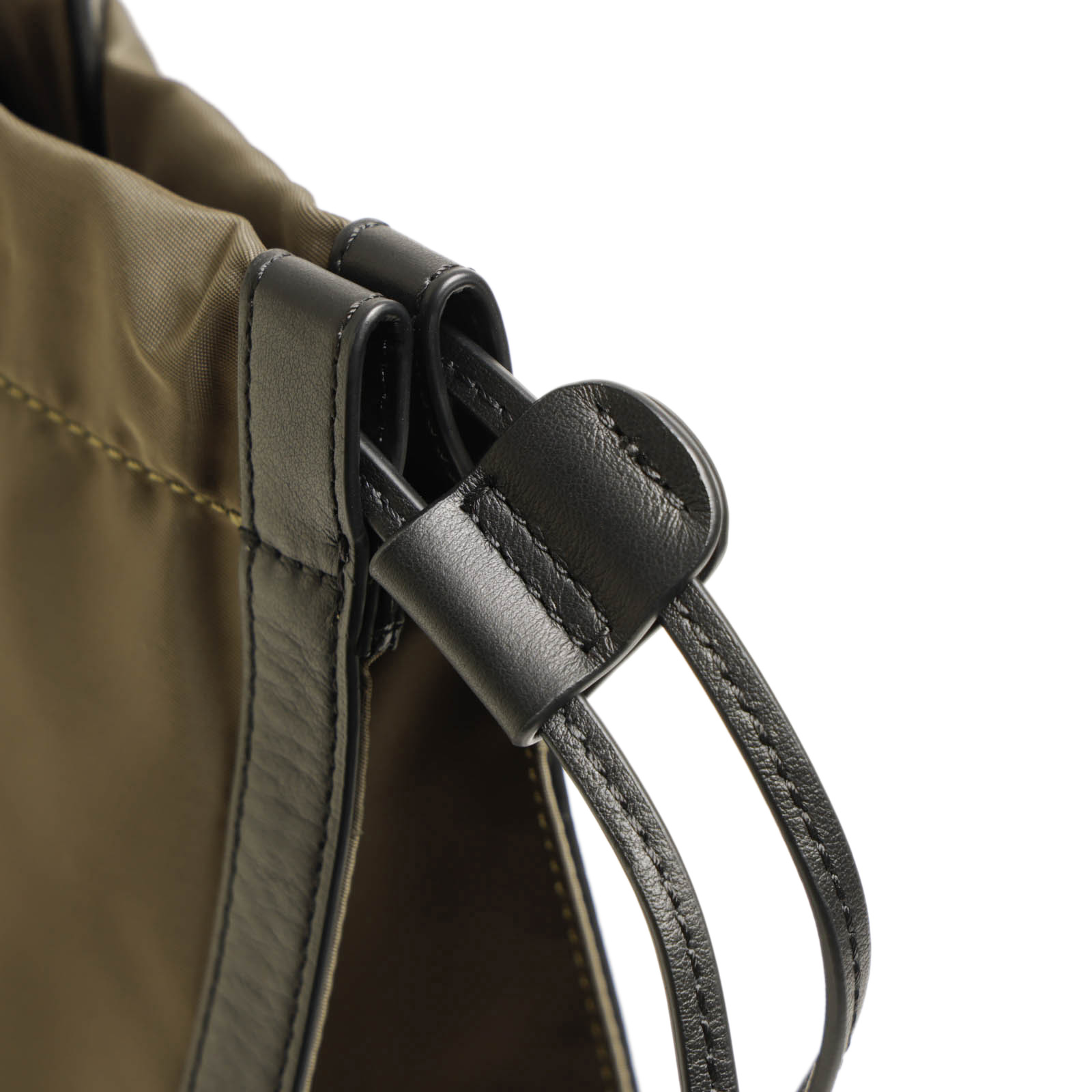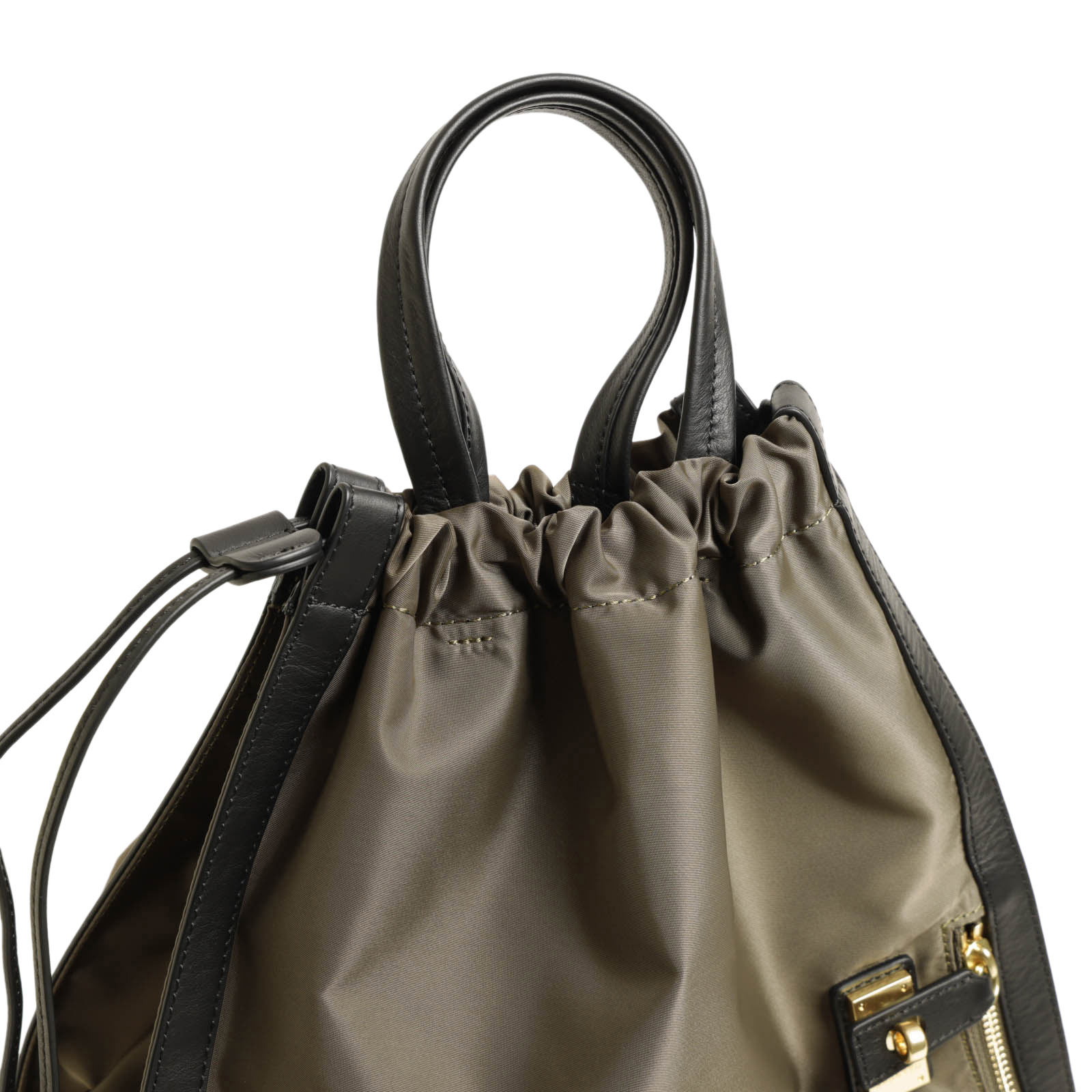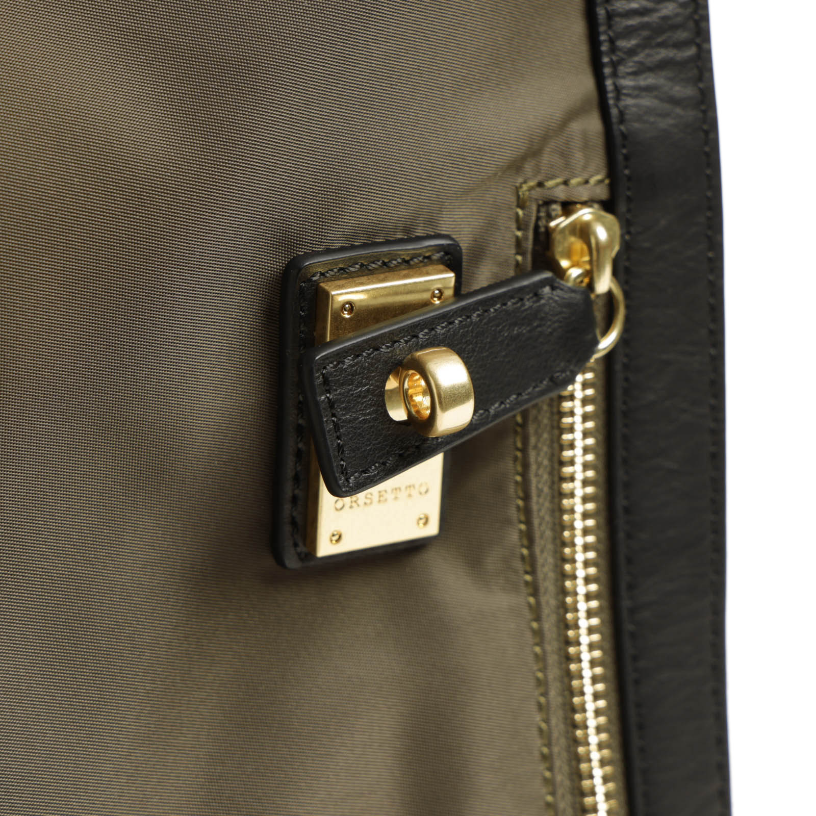 ベースのナイロンは程よい光沢感があり、自然な艶が感じられるレザーとのマッチングが◎。ORSETTOのアイコン的ヒネリ金具がアクセントになり、カジュアル感を程よく抑えてくれます。