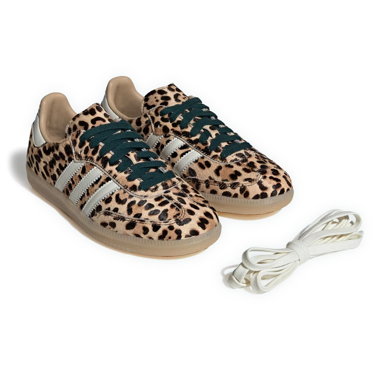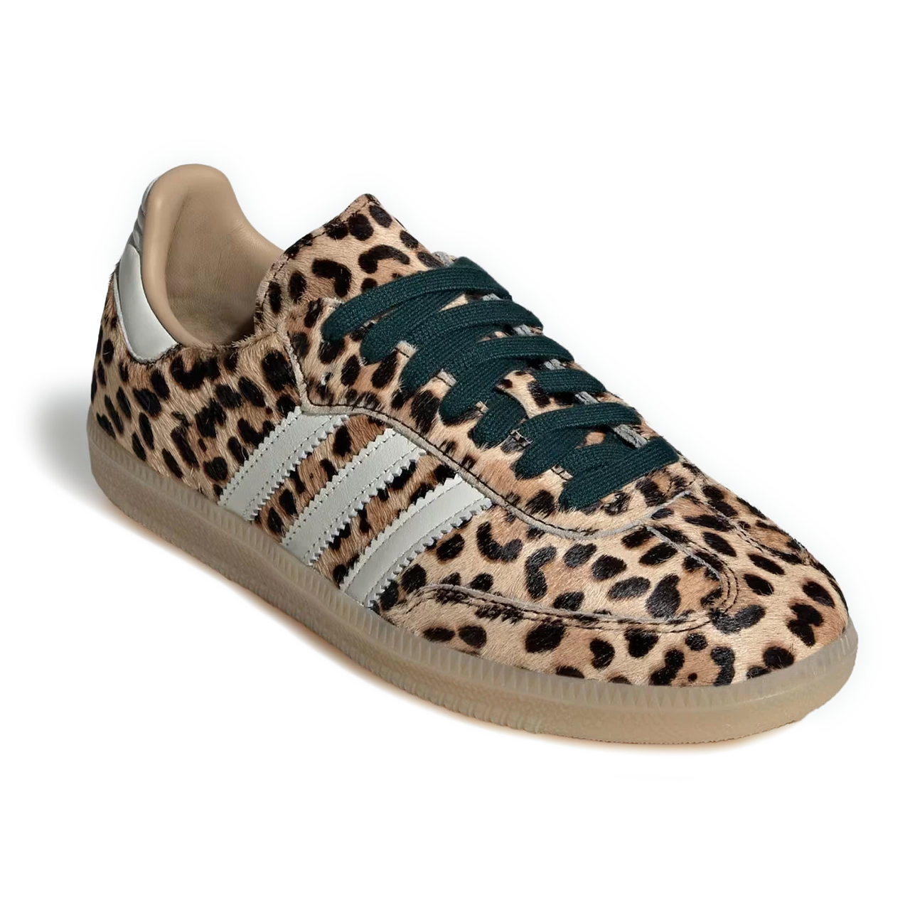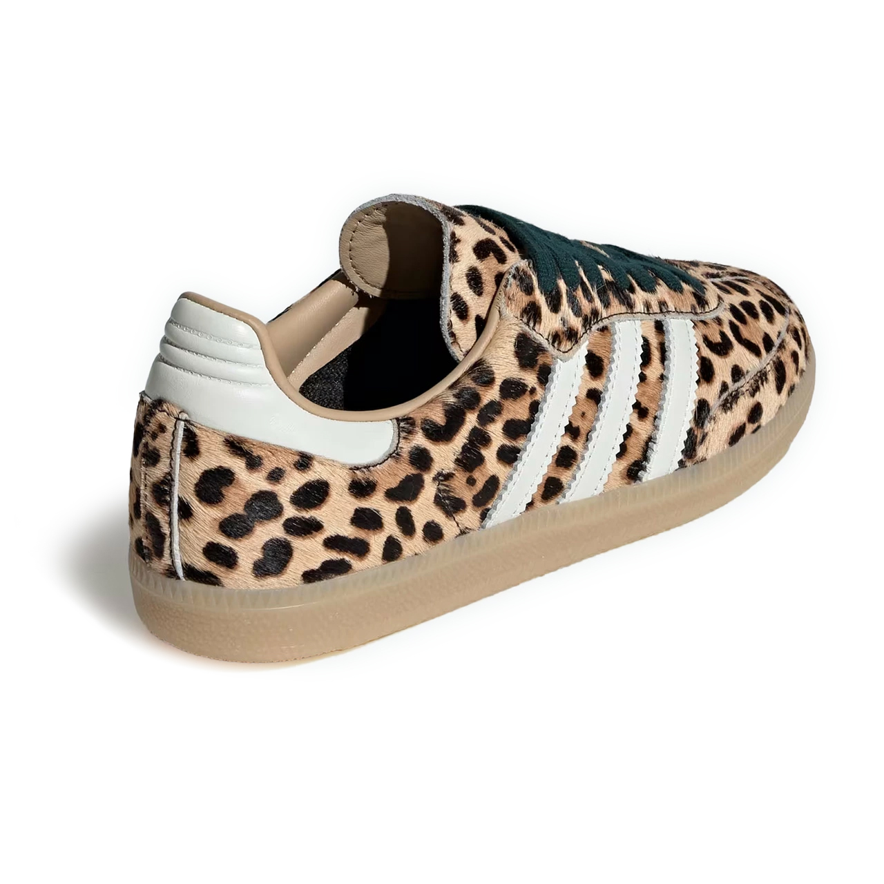 アッパー全体に質感豊かなポニーヘアを採用し、大胆なレオパードの斑点模様をプリントした。
