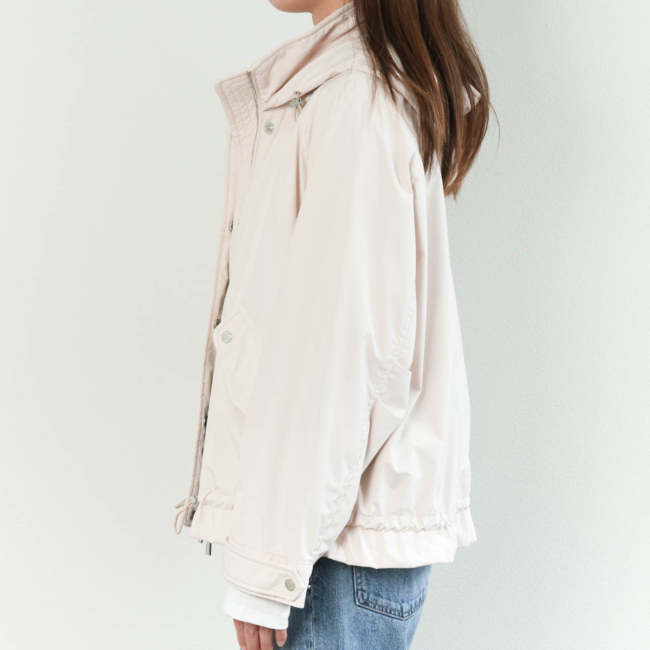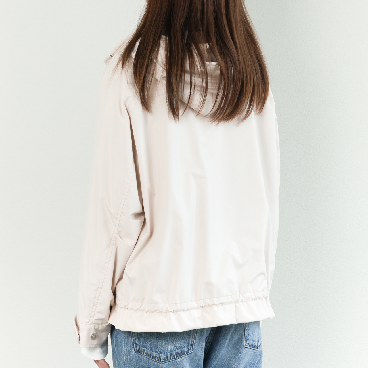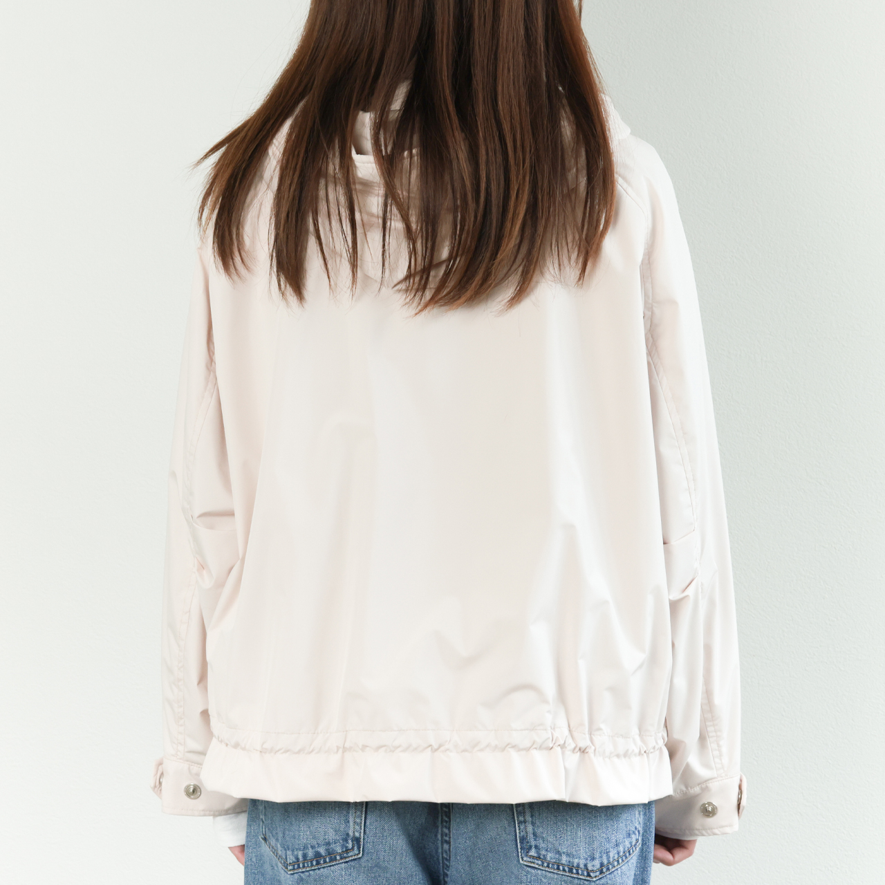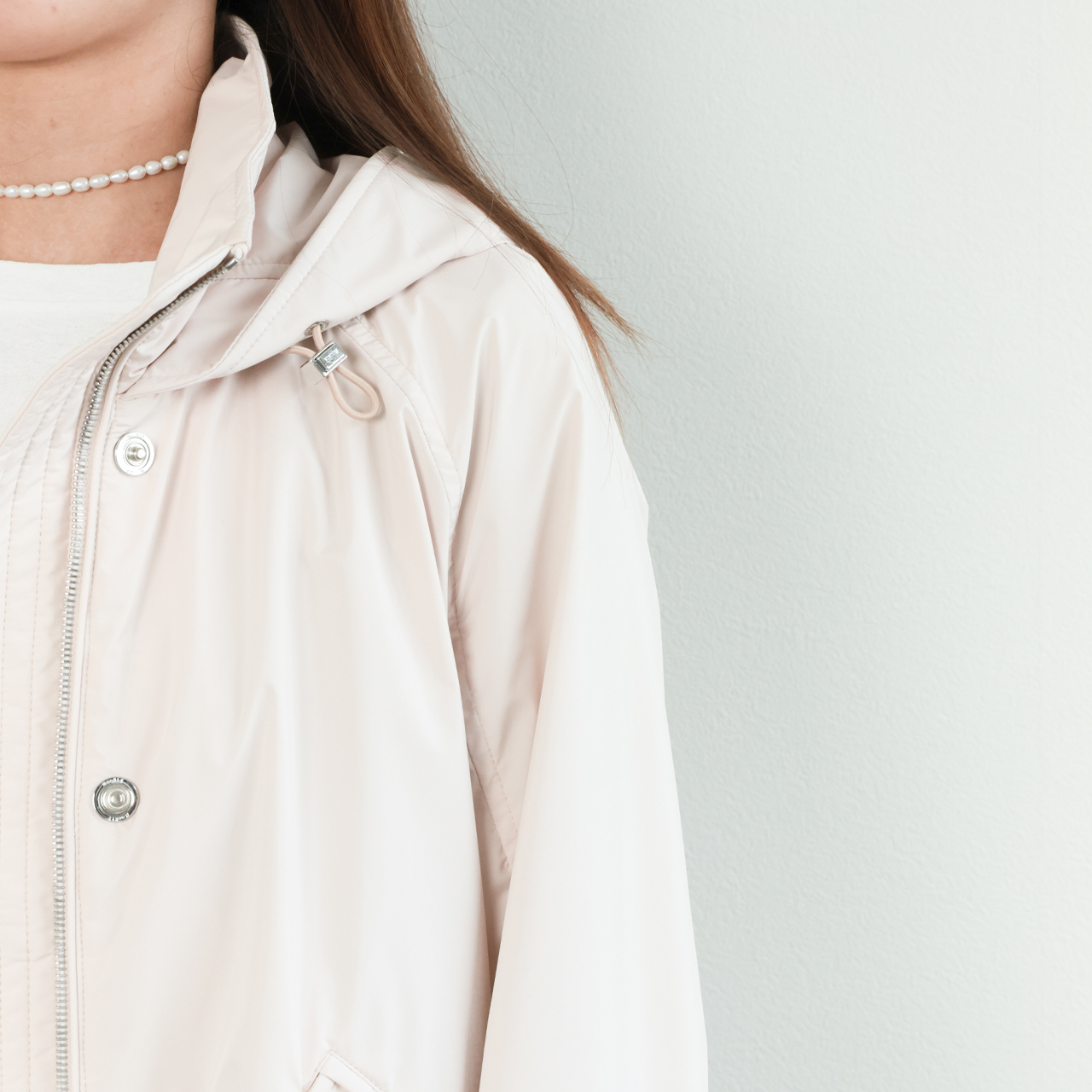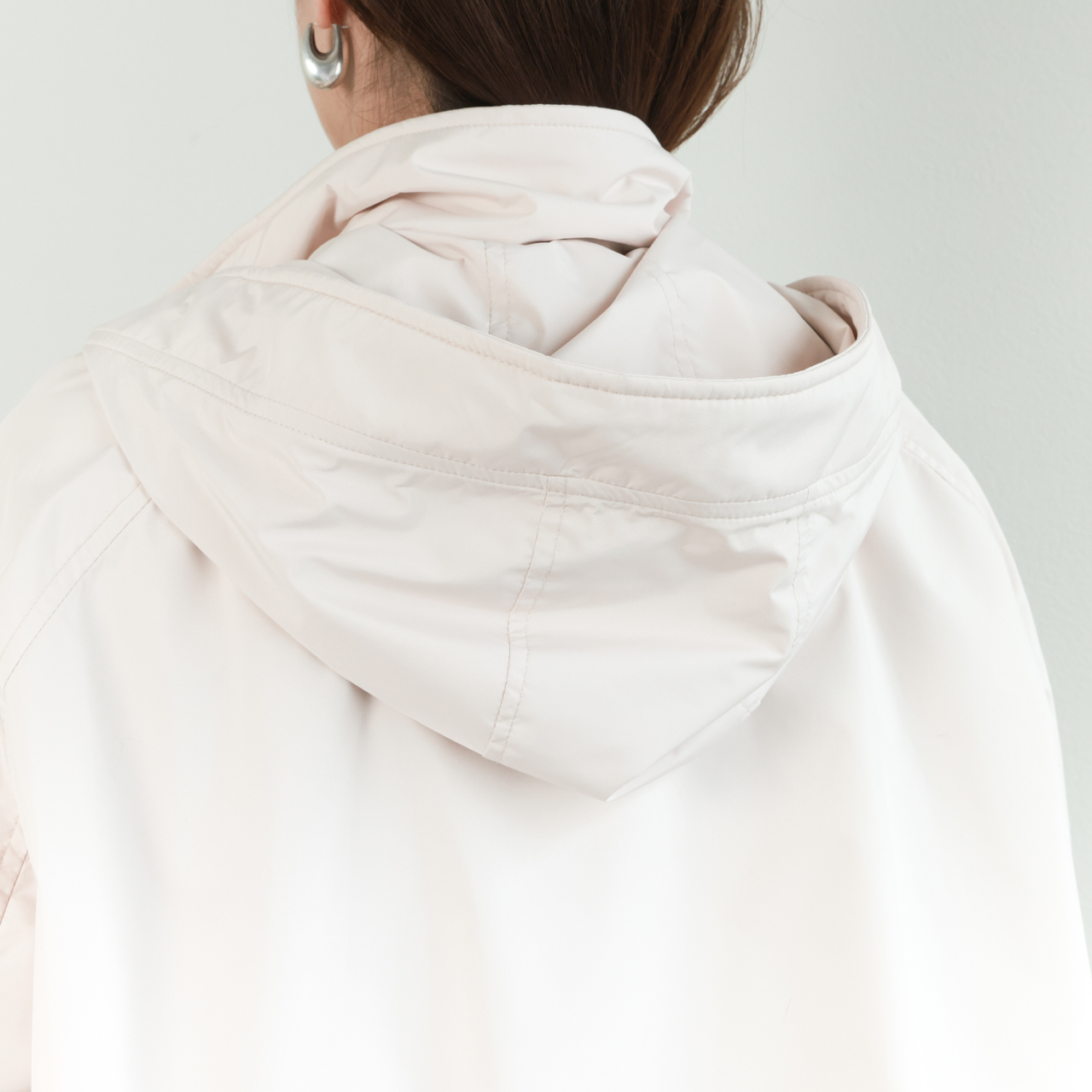 肩付けはラグランスリーブを採用することで、動かしやすさを確保。フード周りは内側にスタンドカラーを付けることで品の良さをプラスしています。