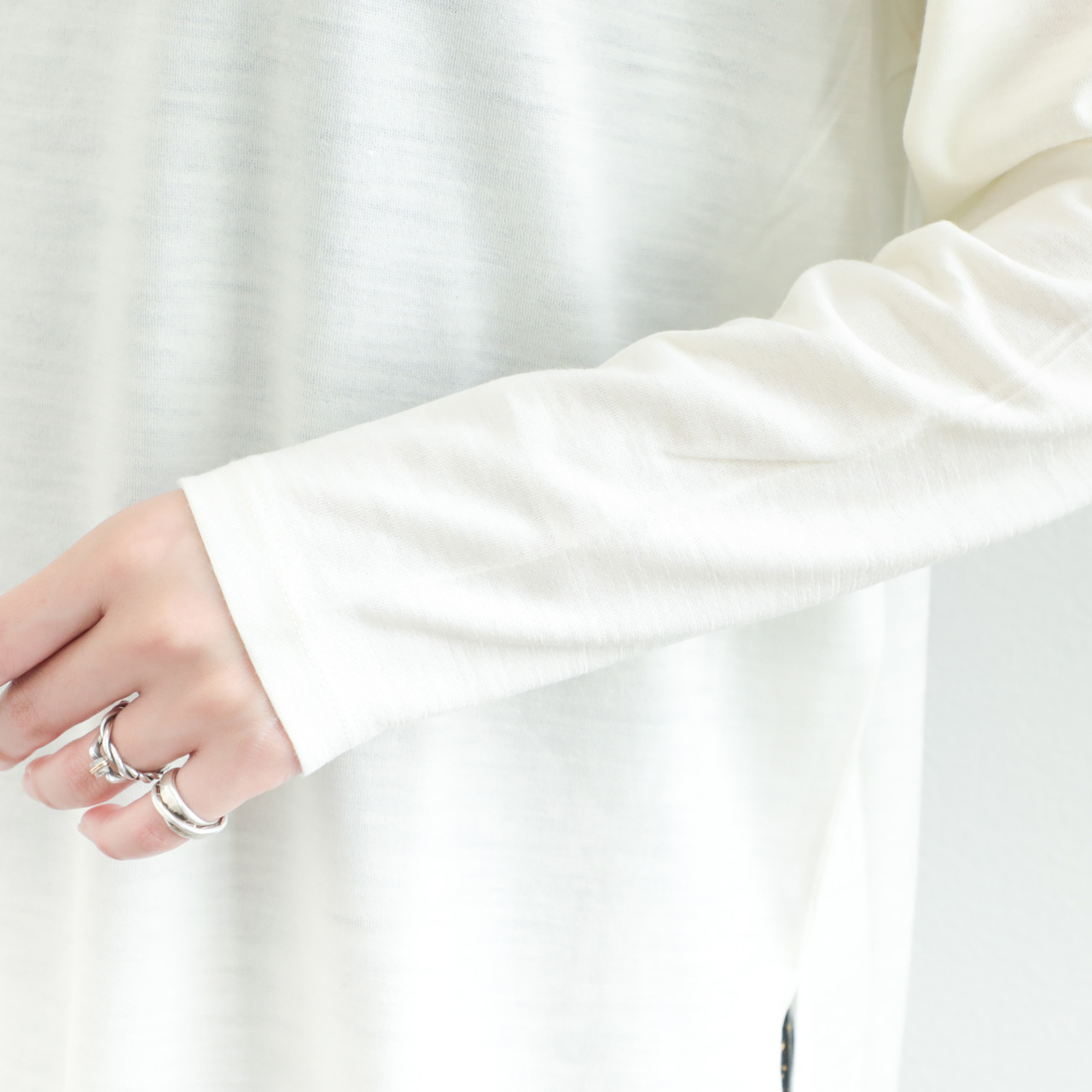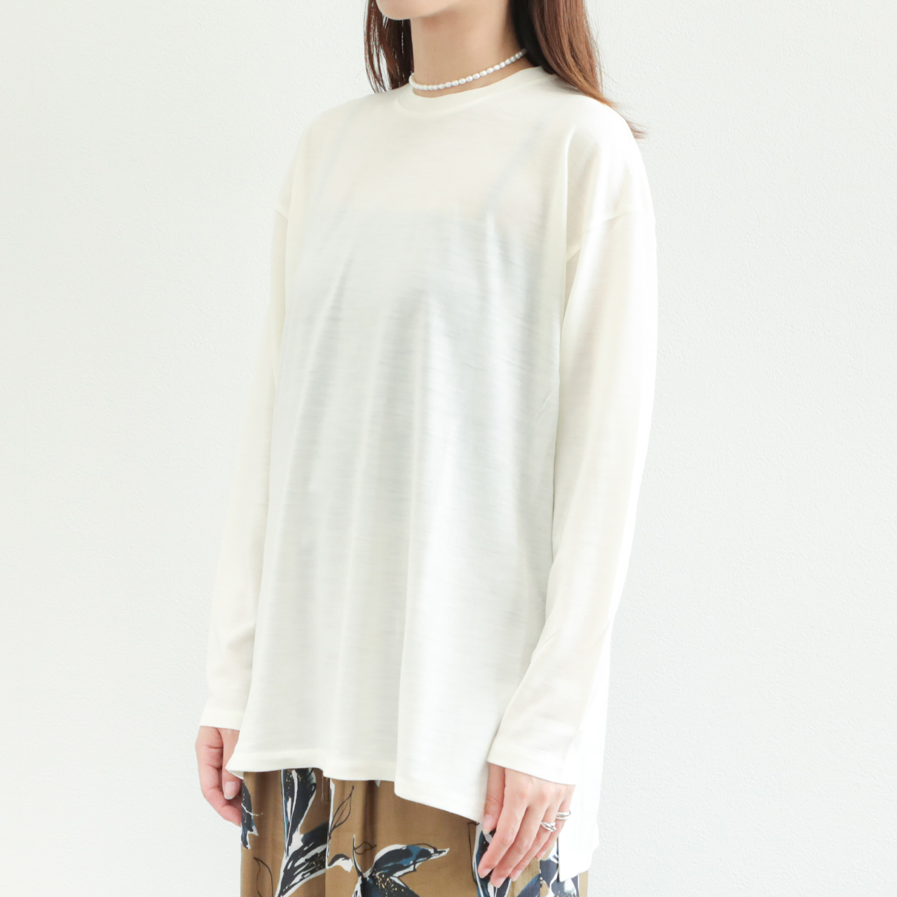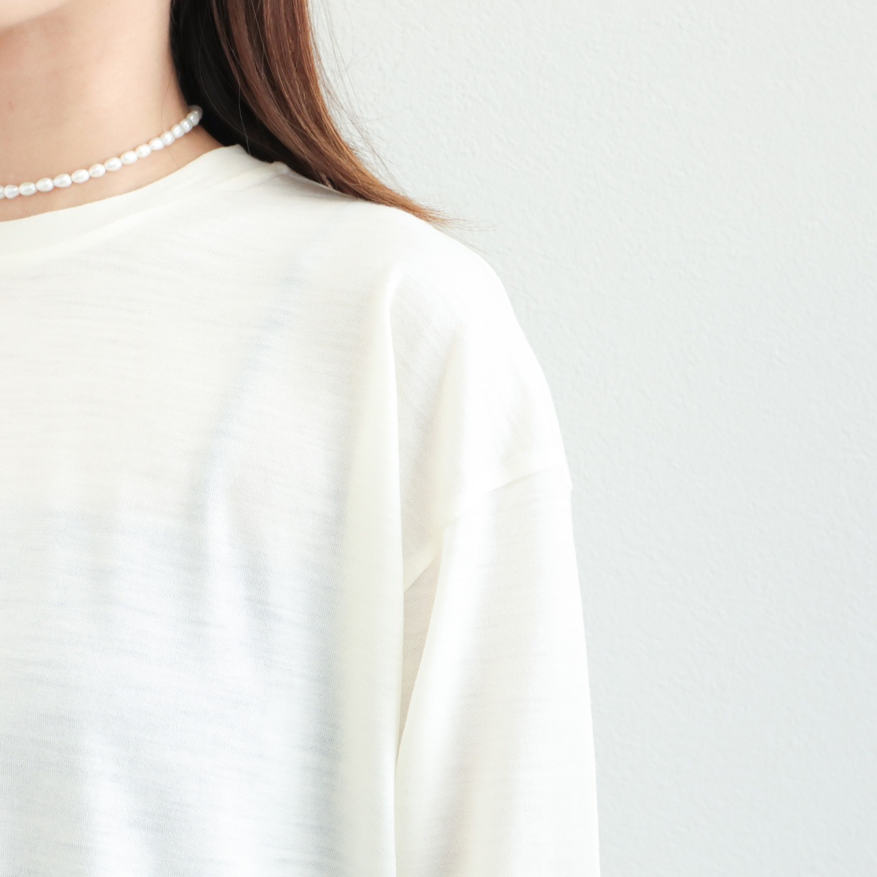 素材感の良さが引き立つクラス感のあるウールロンTです。一枚ではもちろん、ジレやレイヤードワンピースのインナーとしても活躍します。