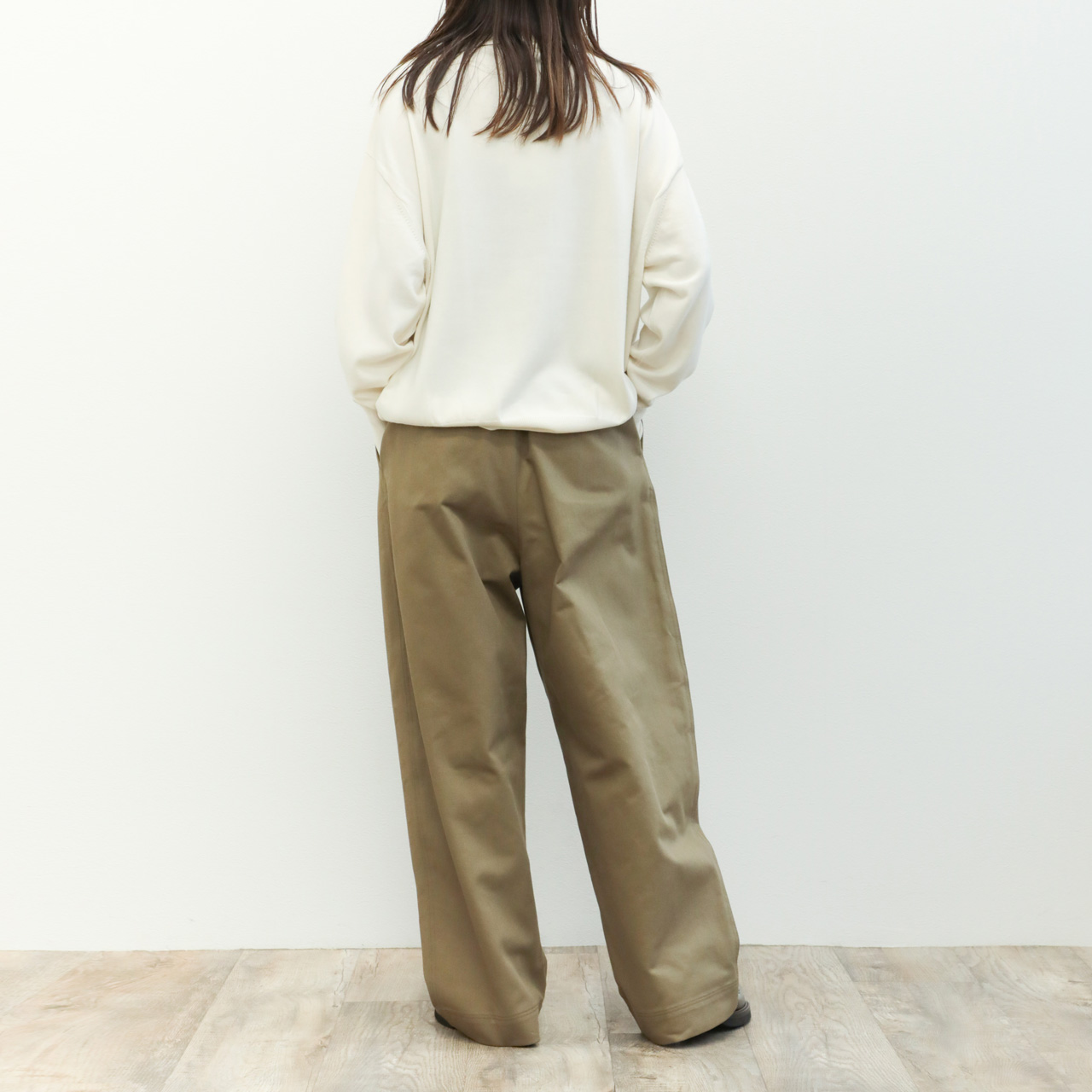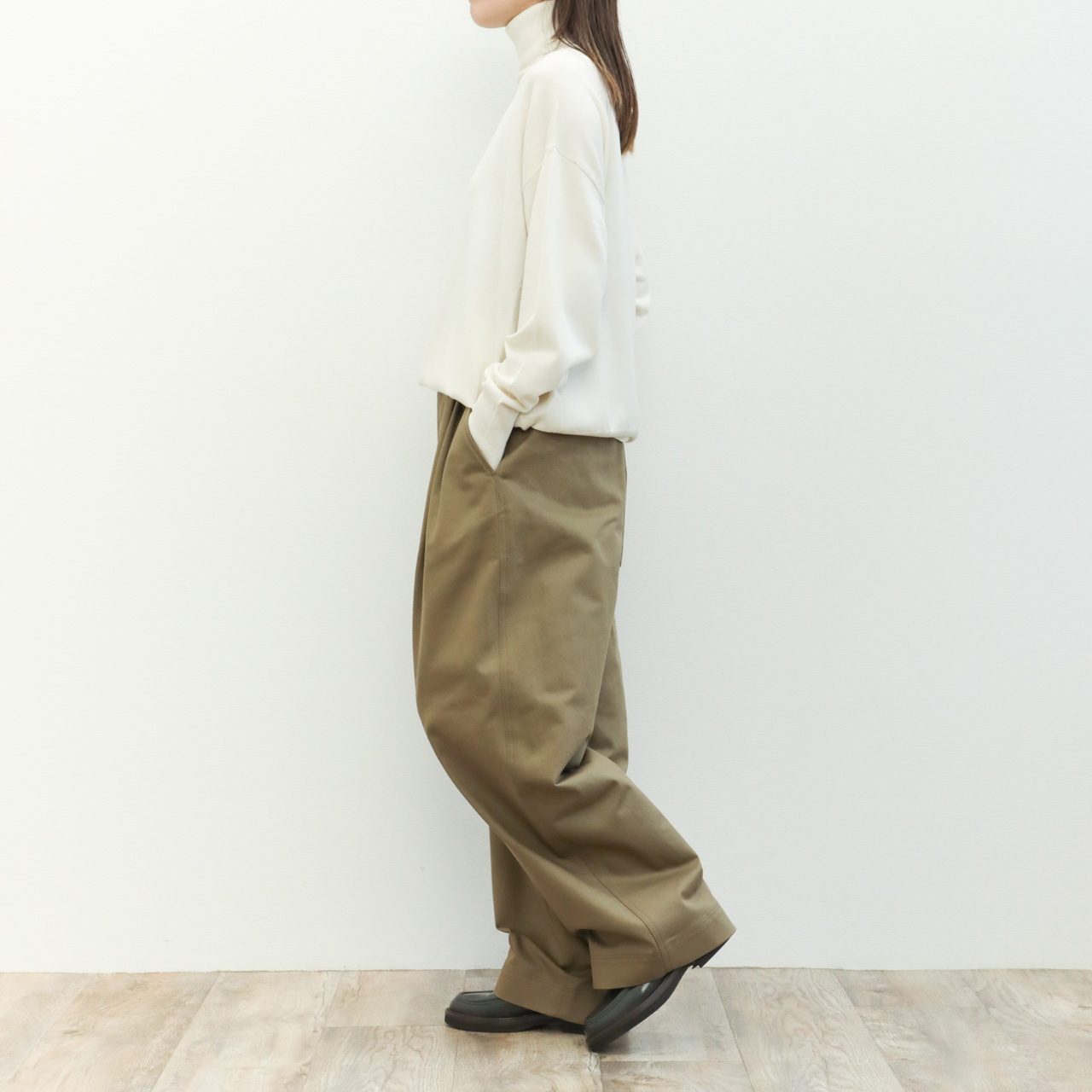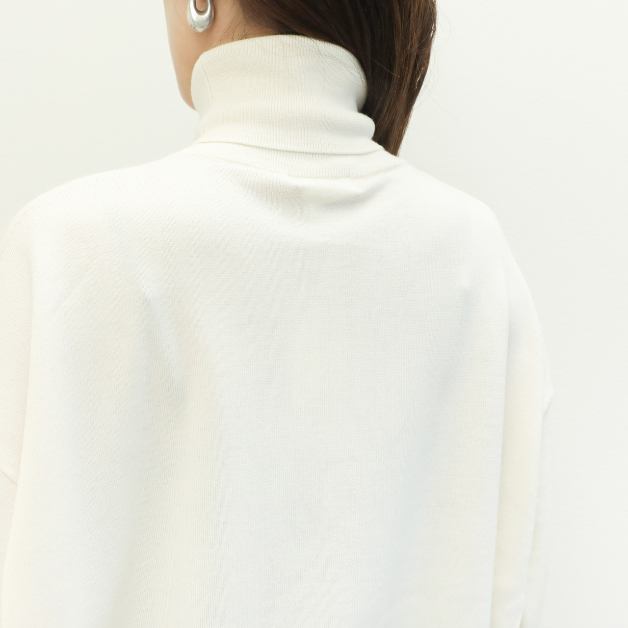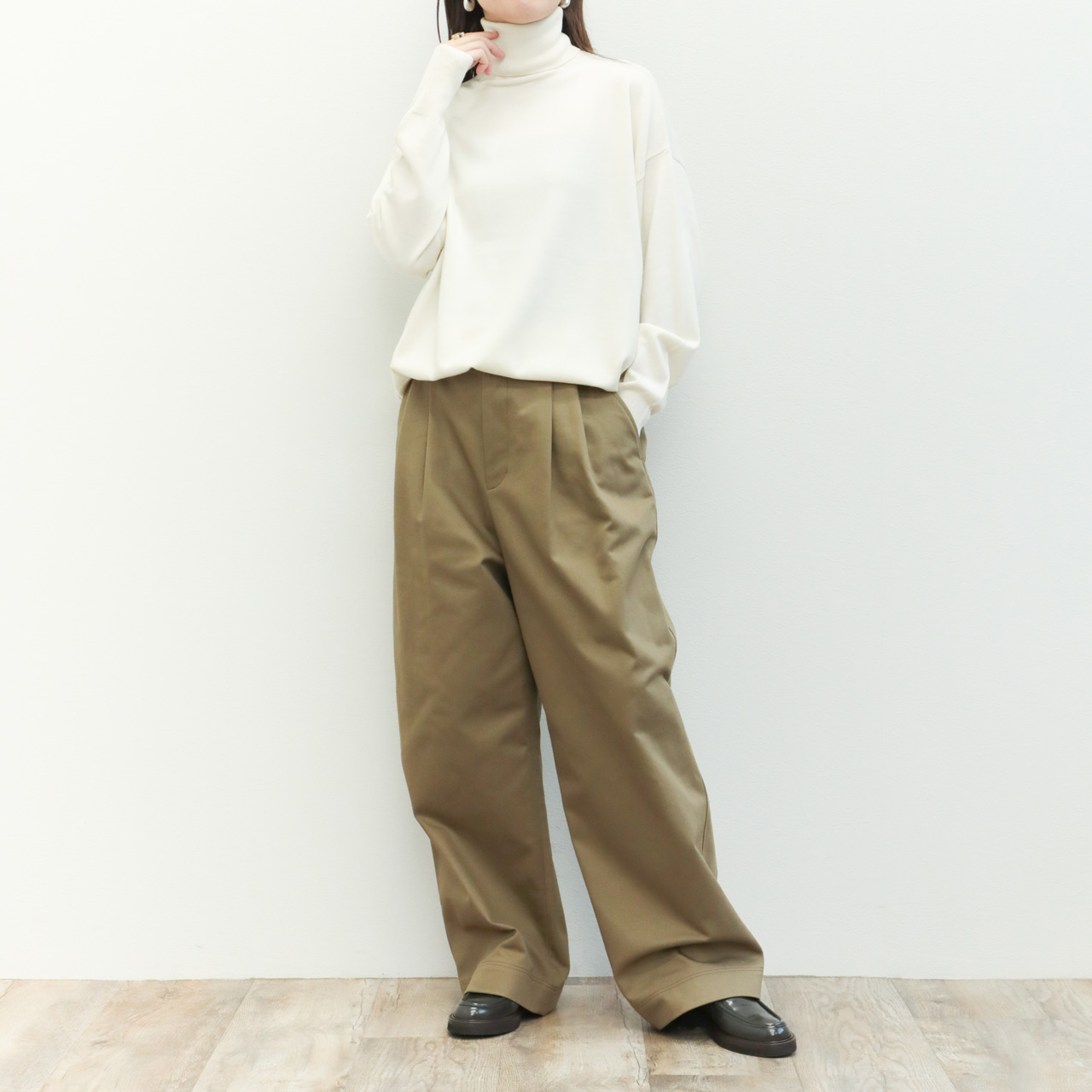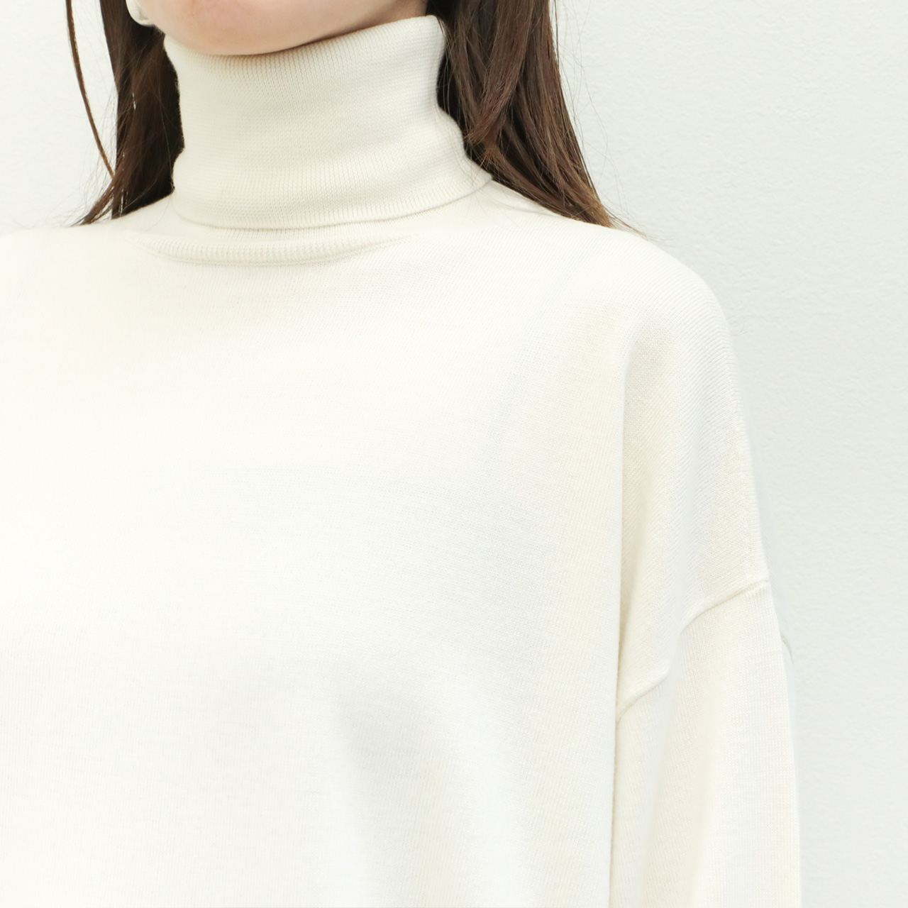 タートルネック部分と袖のリブが少し長く、くしゅっとしたシワが生まれることで柔らかさを感じるカジュアルスタイルが楽しめそうです。