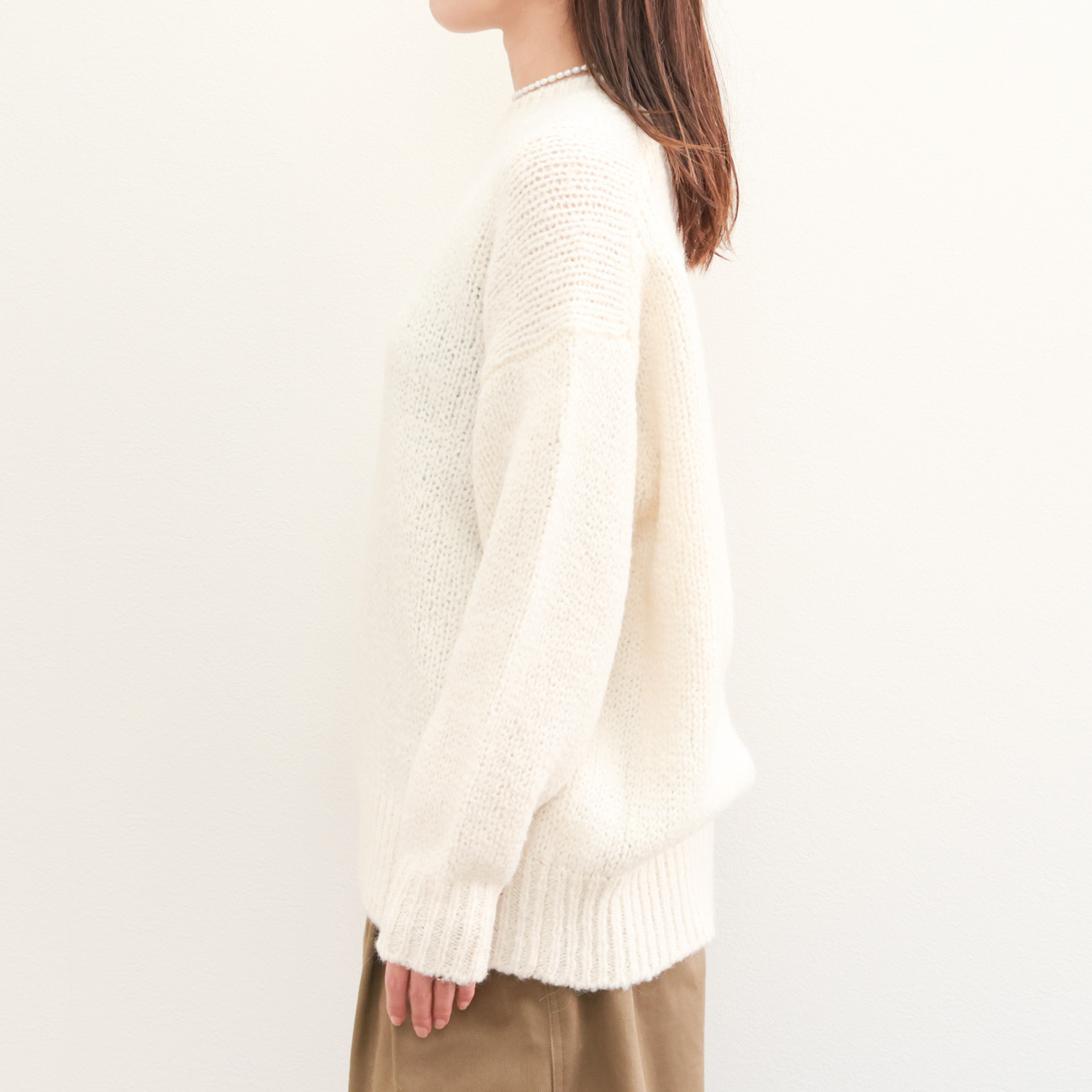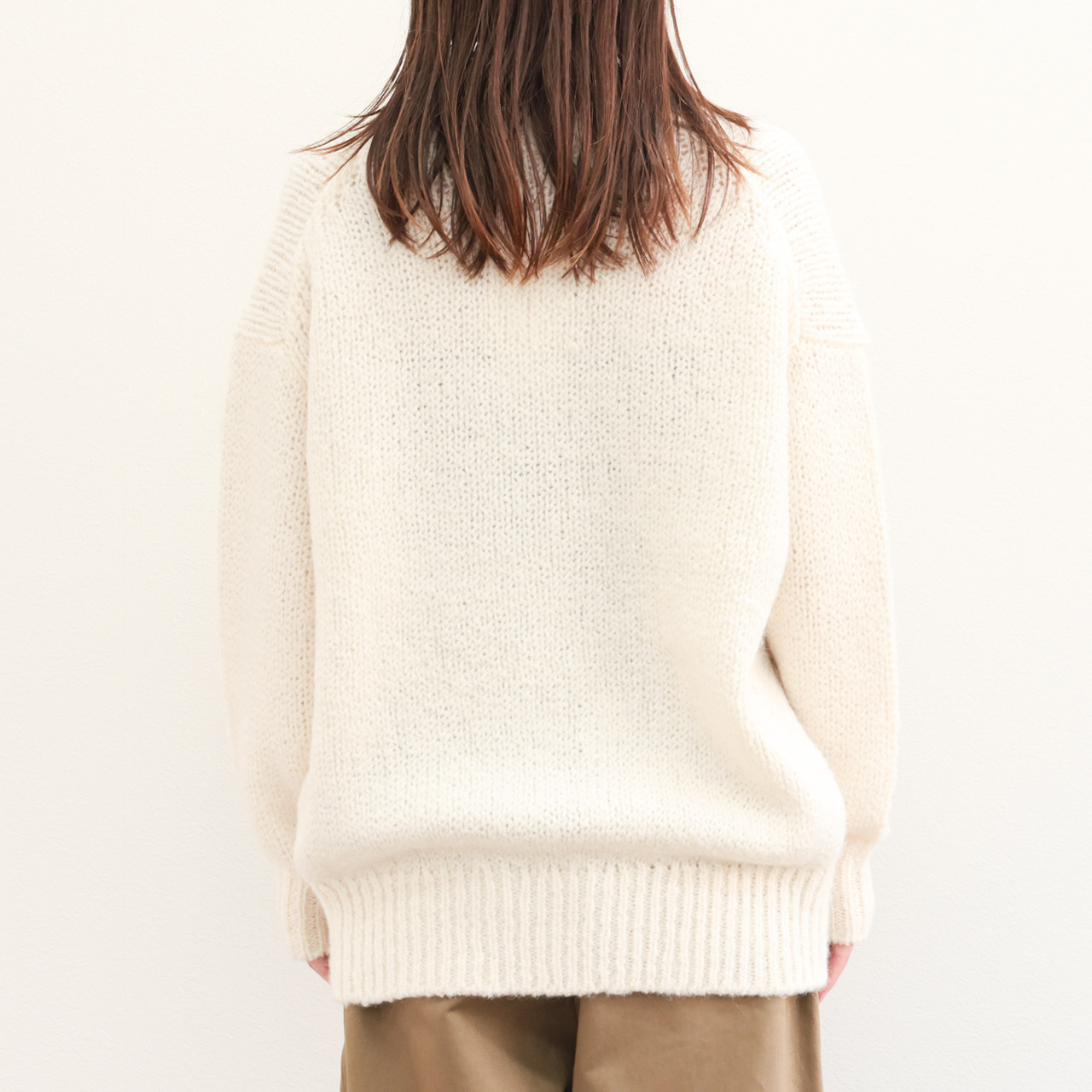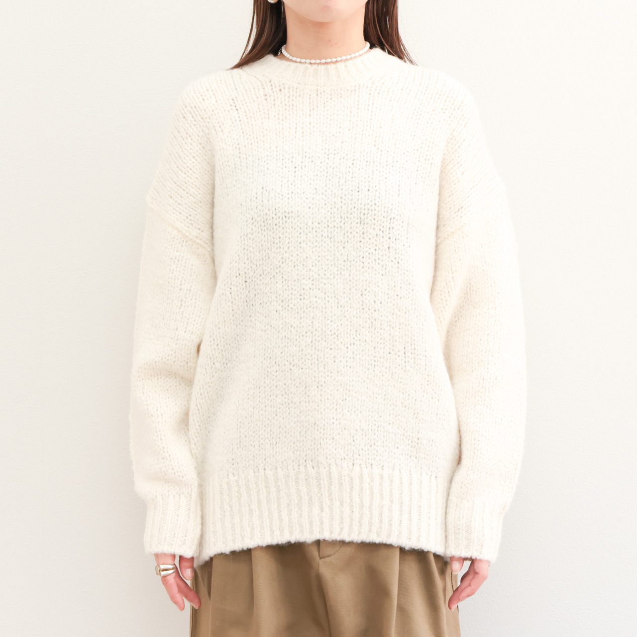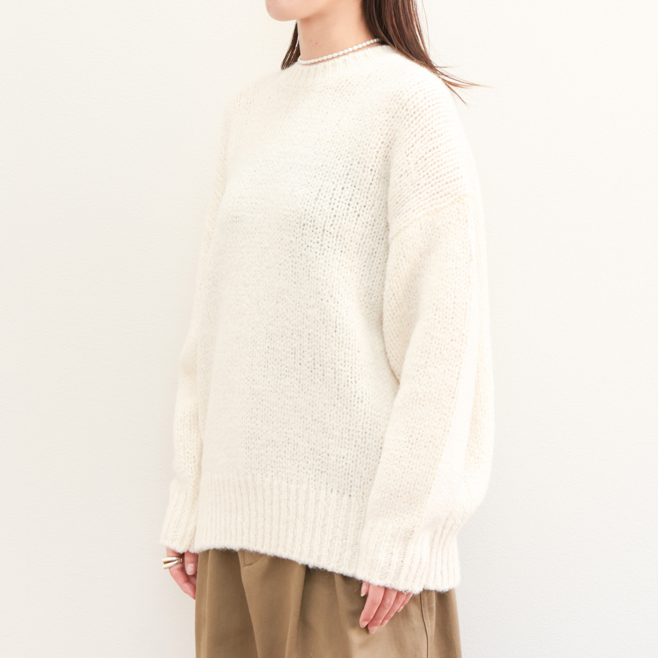 アルパカ混ならではの膨らみと柔らかな風合いが特徴。メンズライクなオーバーサイズのクルーネックニットはマニッシュな雰囲気が魅力の一着。ドロップショルダー、甘めの編みの風合いはフェミニンな雰囲気も感じられこのバランス感は見事。
