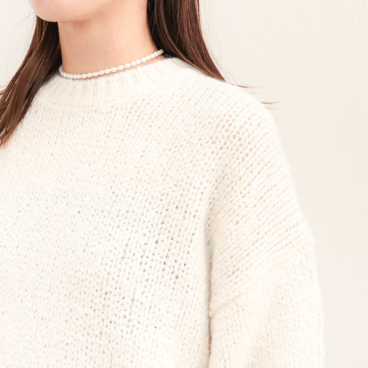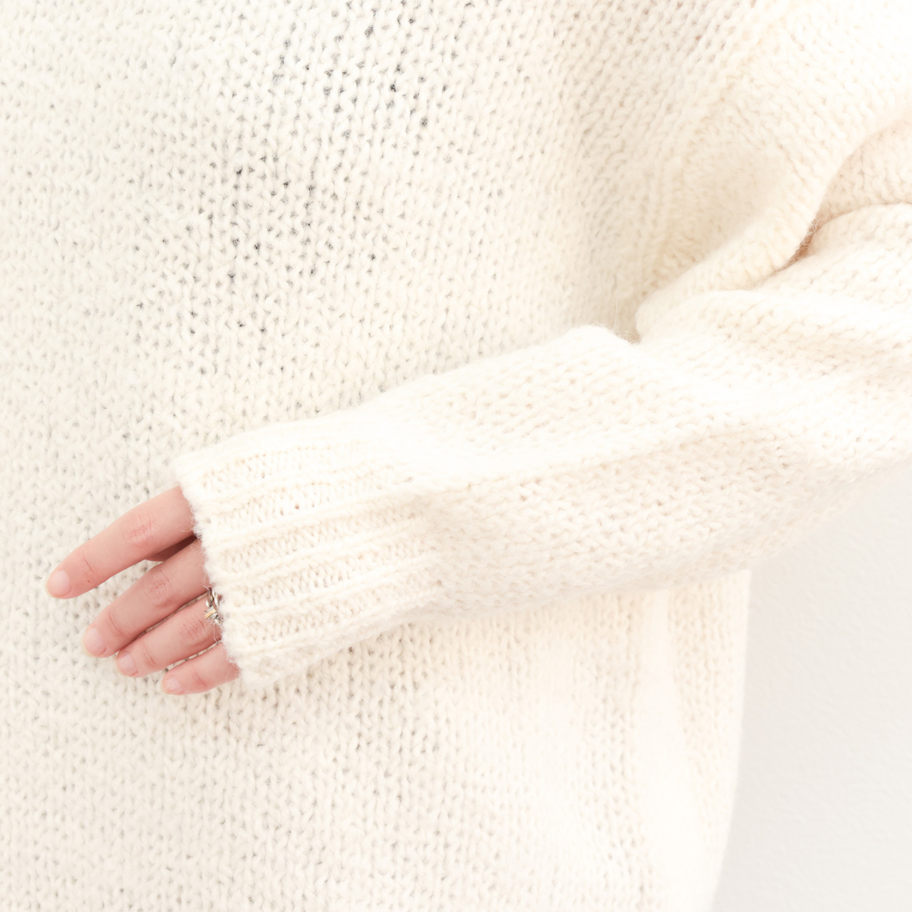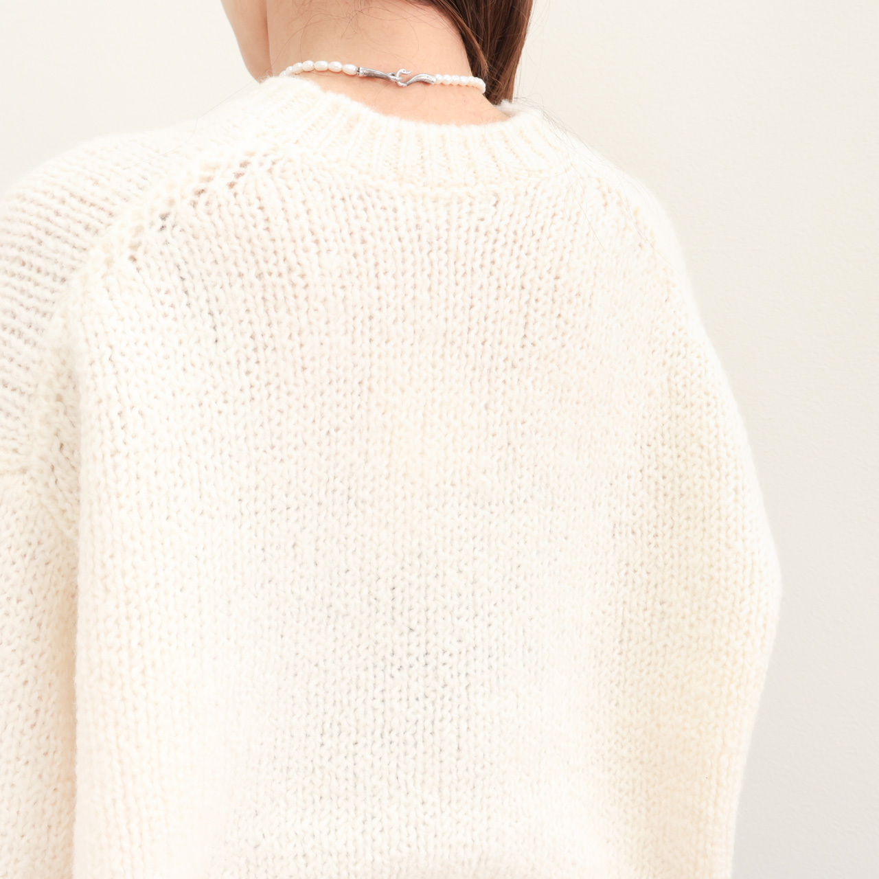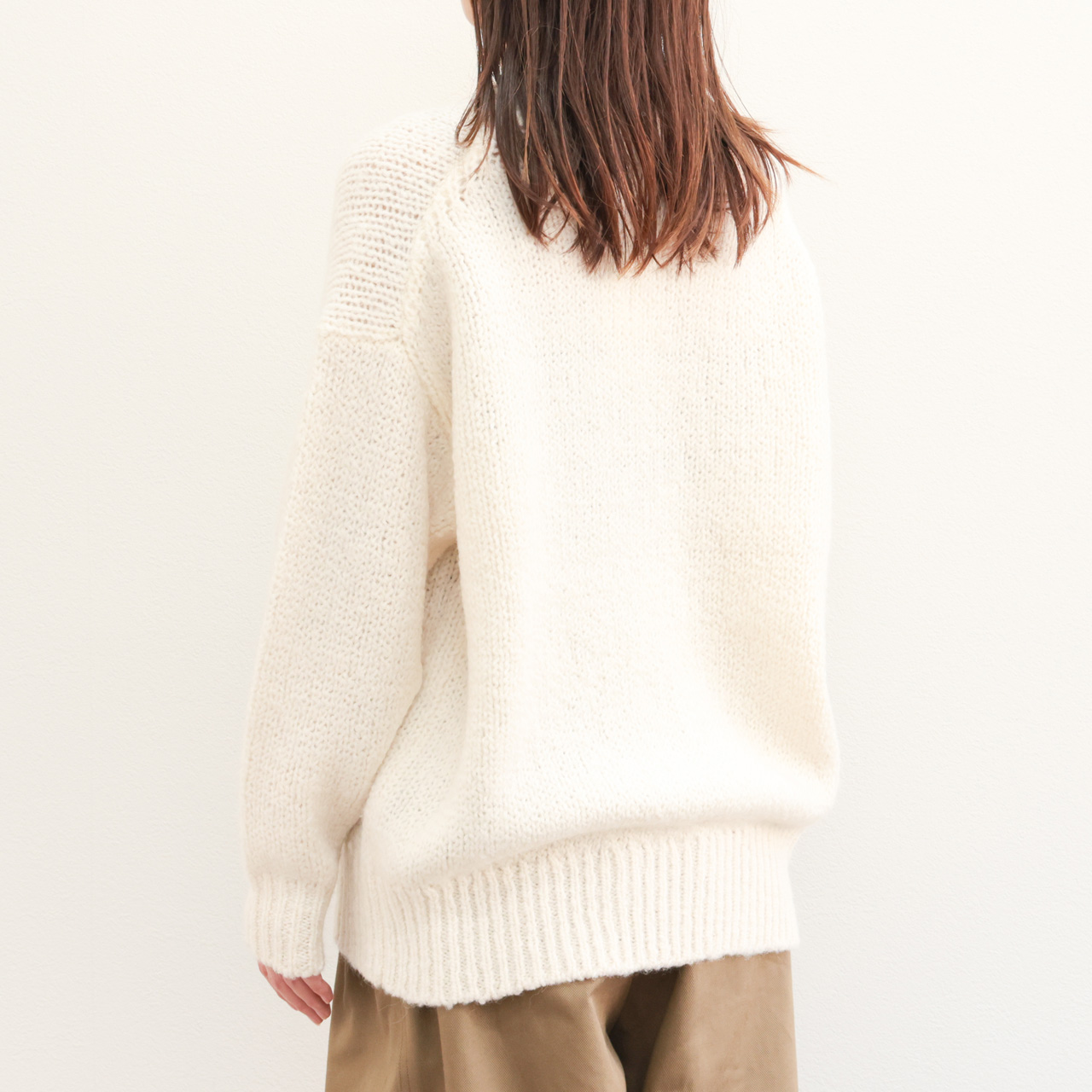 アルパカ混ならではの膨らみと柔らかな風合いが特徴。メンズライクなオーバーサイズのクルーネックニットはマニッシュな雰囲気が魅力の一着。ドロップショルダー、甘めの編みの風合いはフェミニンな雰囲気も感じられこのバランス感は見事。