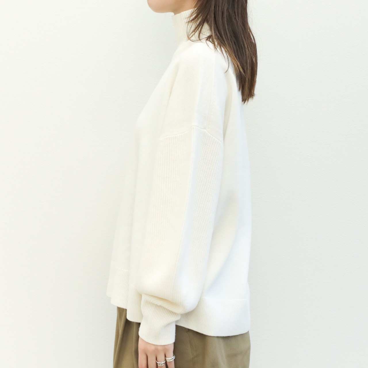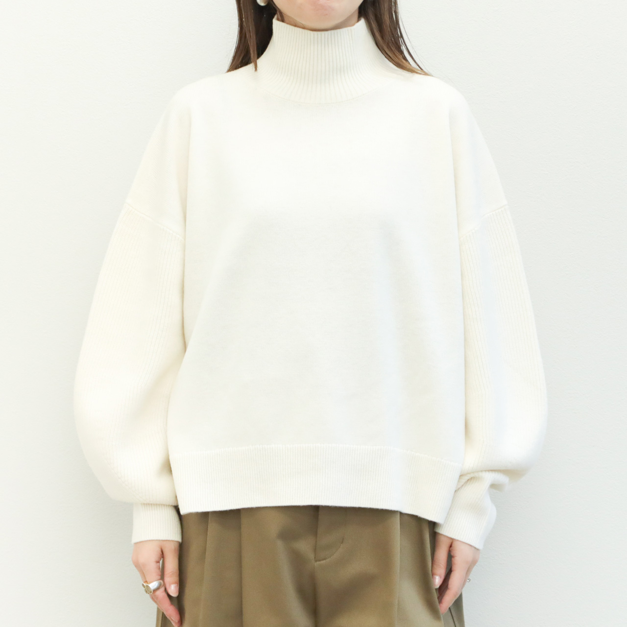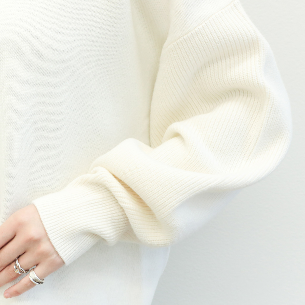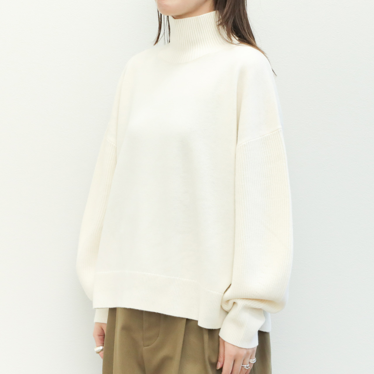 ベースはMICA&DEALの得意とする前後差をつけたボディラインを気にせず着られる程よくゆとりのあるシルエット。モックネック(ハイネック)を採用し、暖かさをキープ。更にユニークなのがスリーブのデザイン。